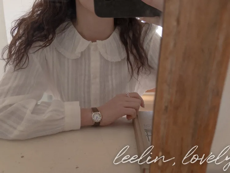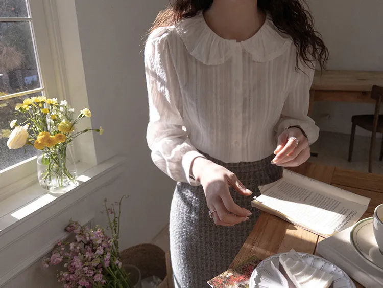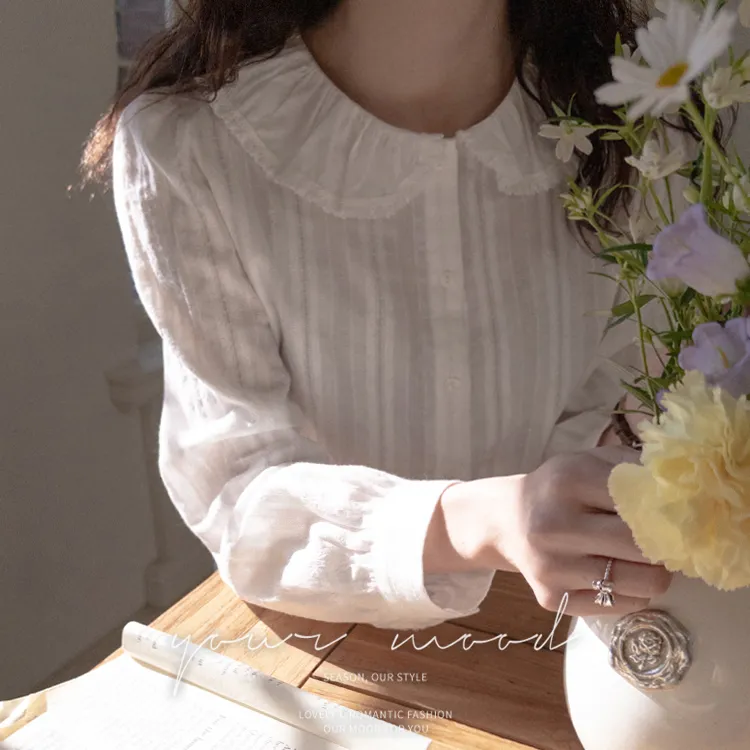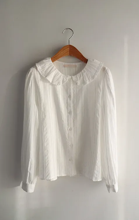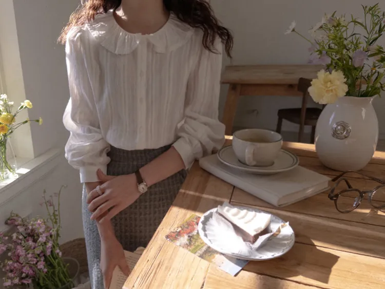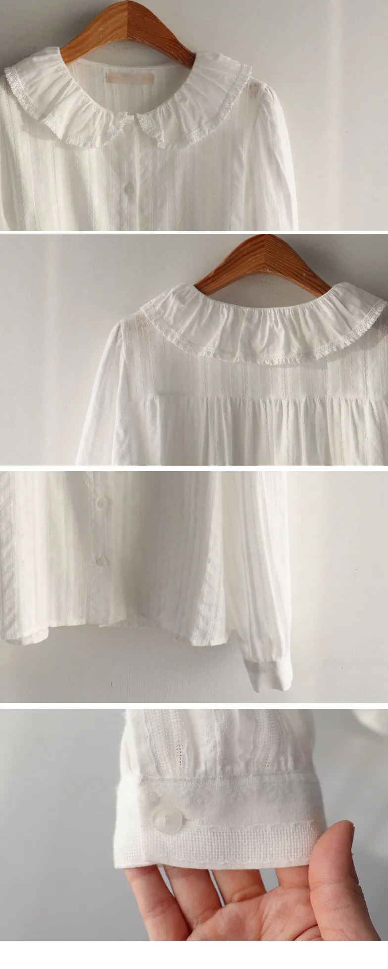 可愛細膩摺邊領蕾絲線條排扣上衣
