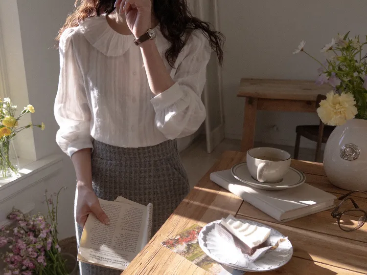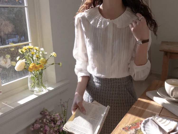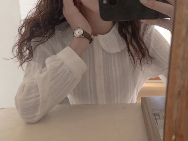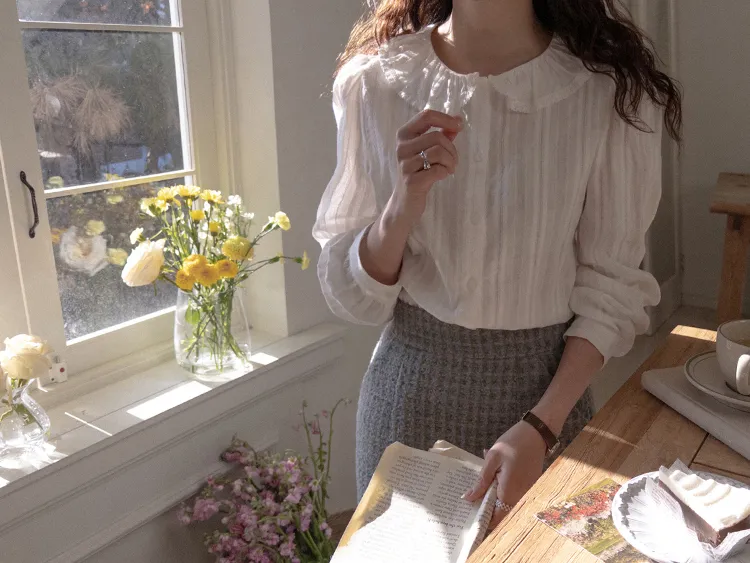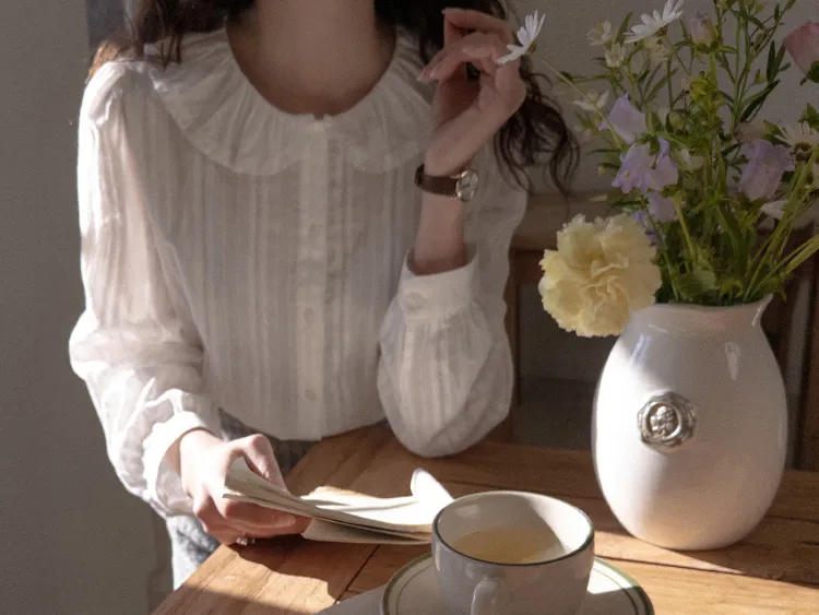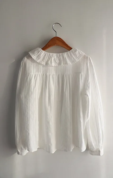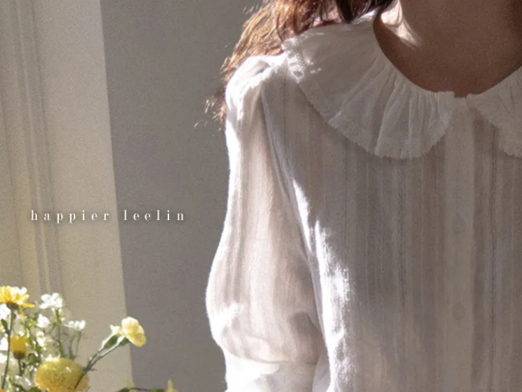 【褶邊領子充滿可愛的可愛排扣上衣♡】【帶有微妙蕾絲布料的柔和心情】【單獨或疊穿都可以!】【領口的層次感真的很漂亮】