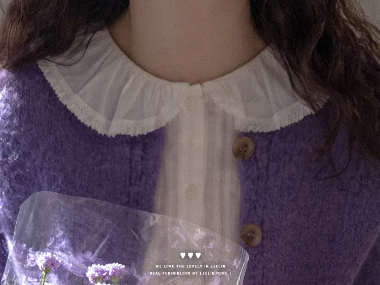 可愛細膩摺邊領蕾絲線條排扣上衣