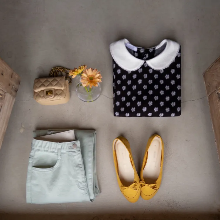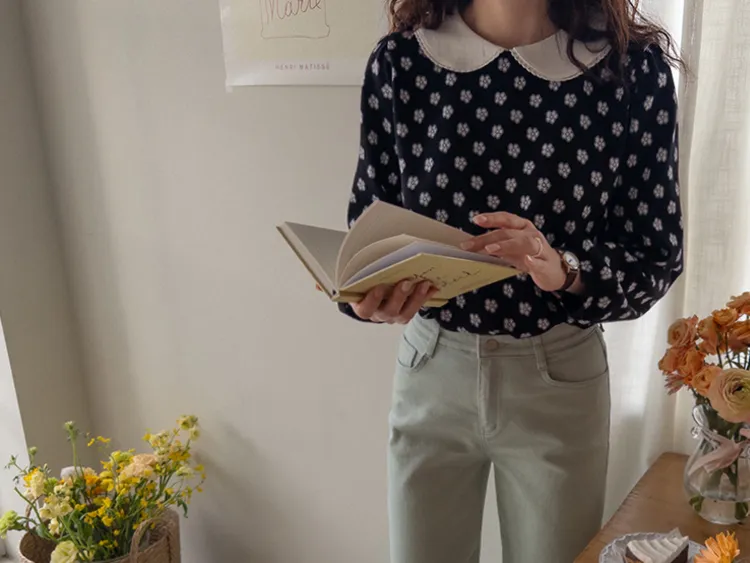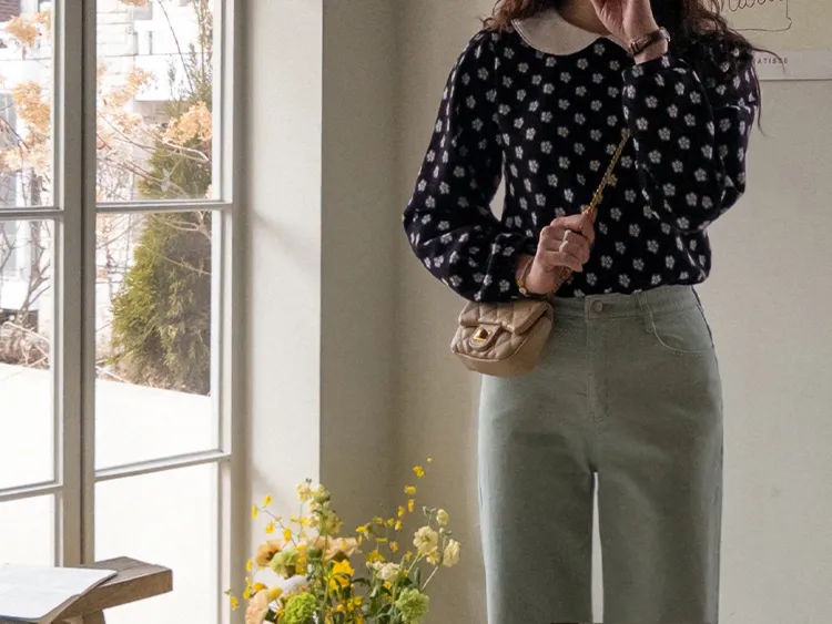 可愛花朵圓領肩線剪裁上衣
