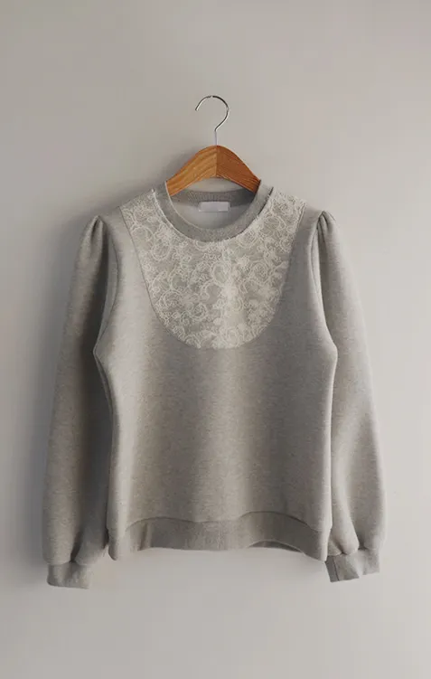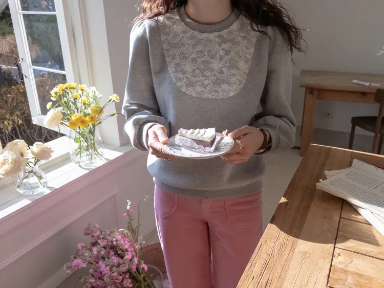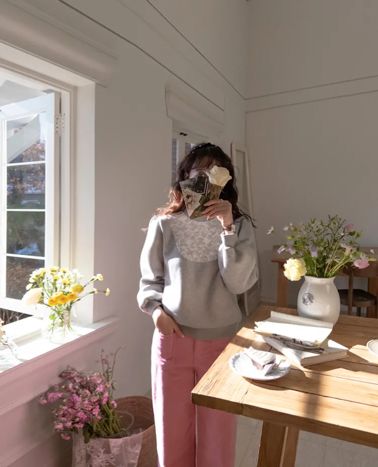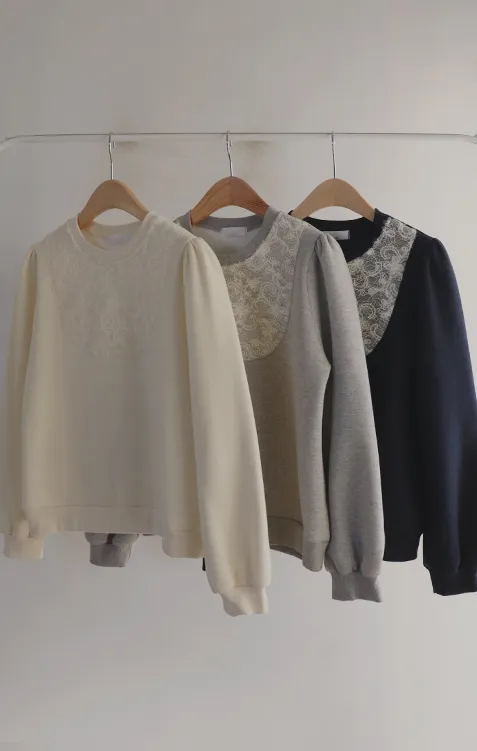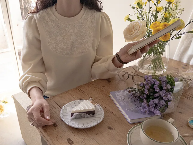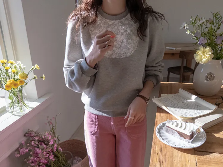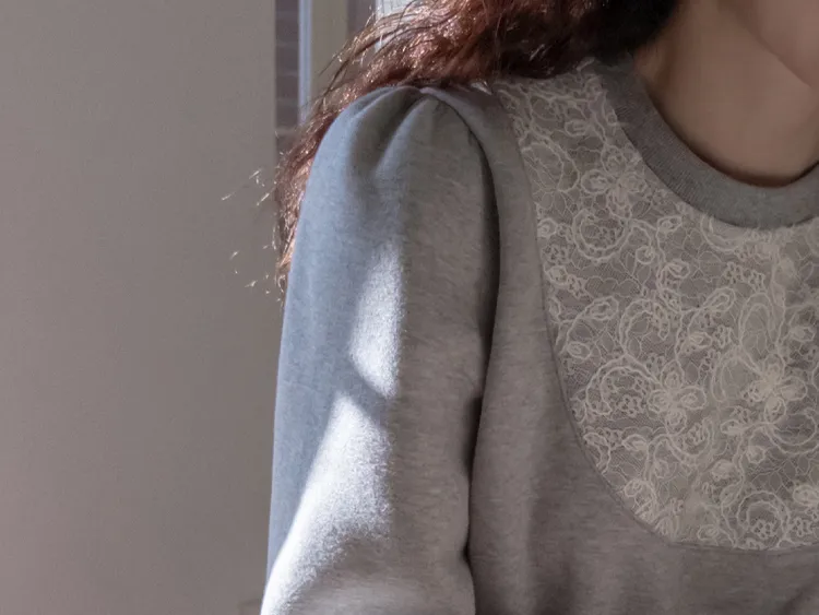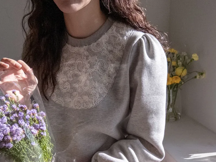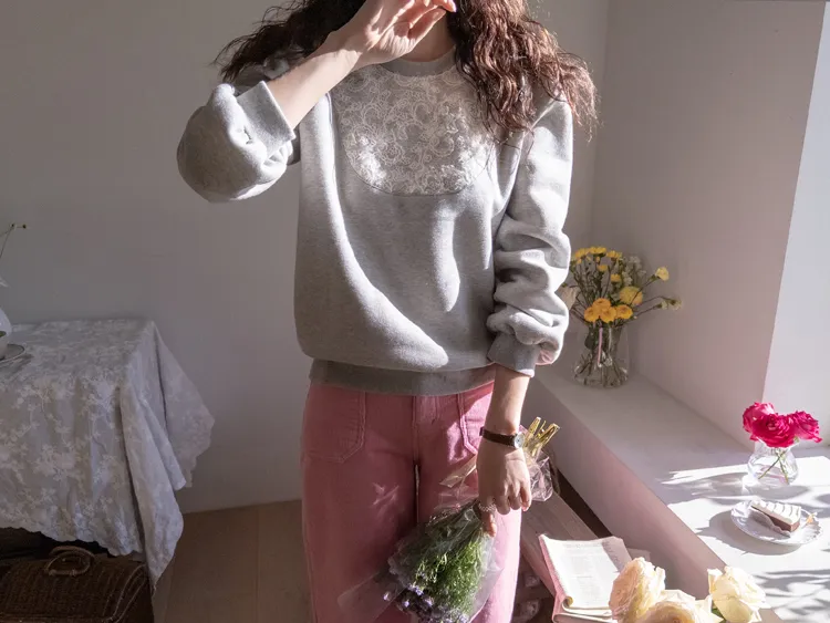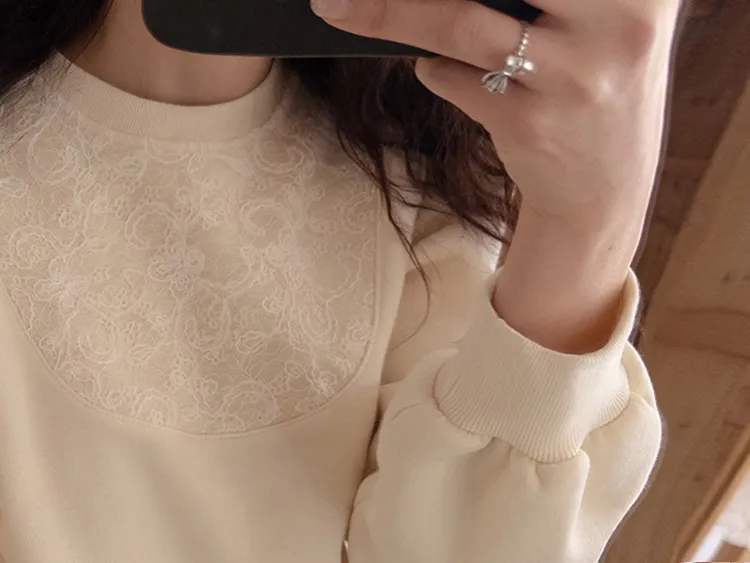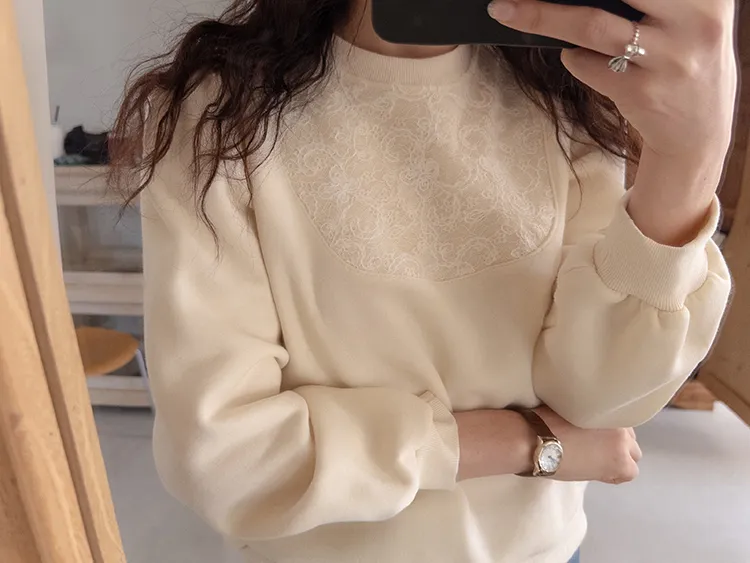 [內裡抓絨輕款暖和♡][正面蕾絲和肩部抽褶細節十足~][柔美與休閒並存!]【推薦,因為太漂亮了,穿搭也很可愛】