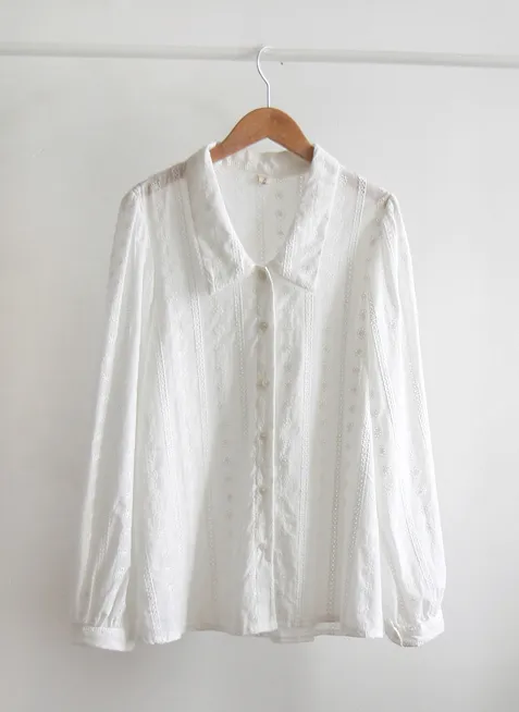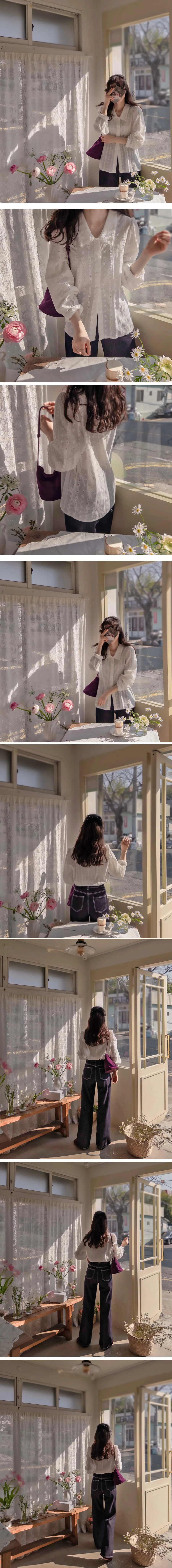 [帶有沖孔花朵刺繡的可愛設計] [修身款優質蕾絲] [領口也非常漂亮,帶有迷你蕾絲裝飾] [顏色非常適合在春天穿著] [帶有沖孔花朵刺繡的可愛設計,非常適合在春天穿著][推薦作為舒適的排扣上衣]