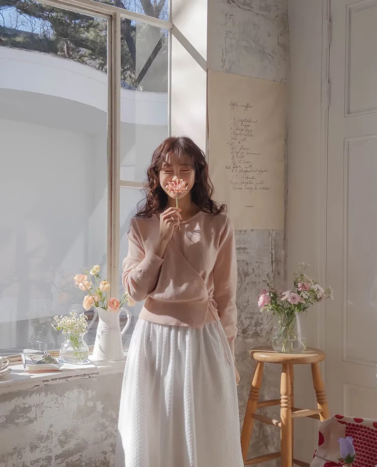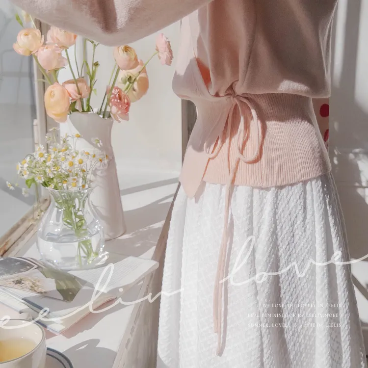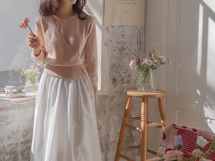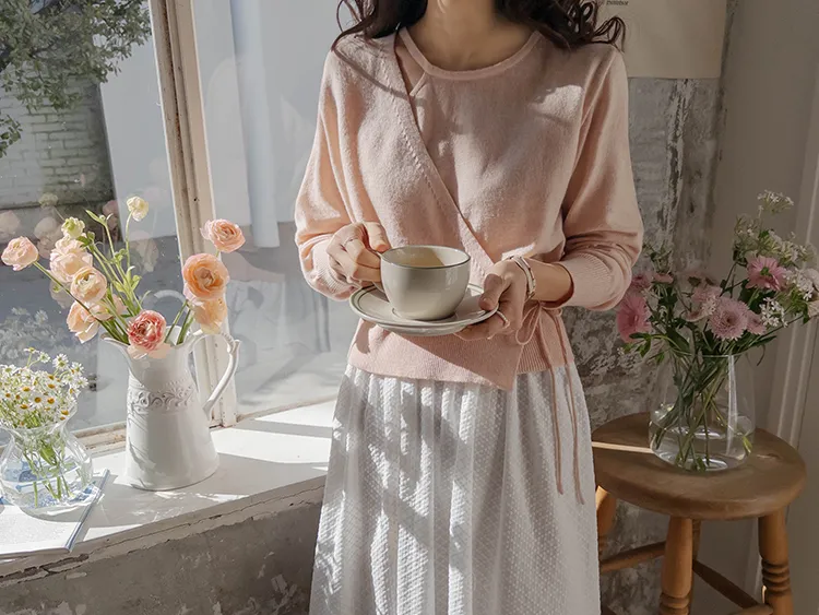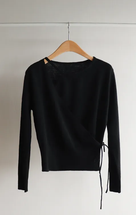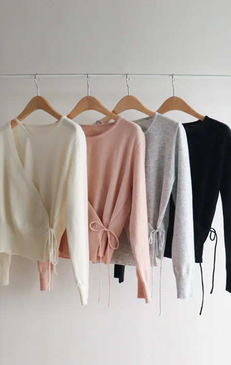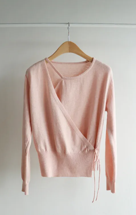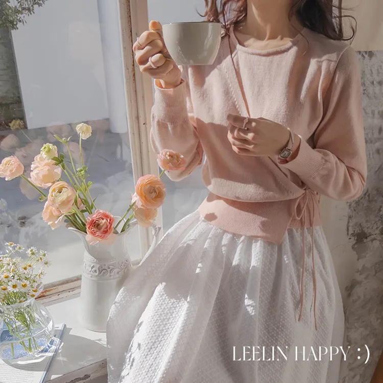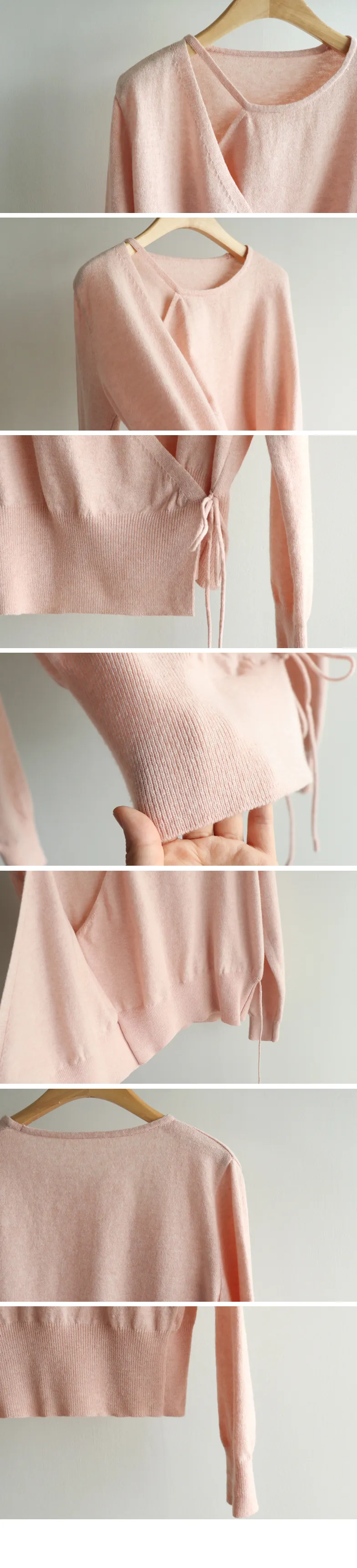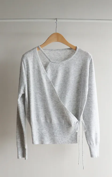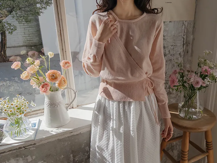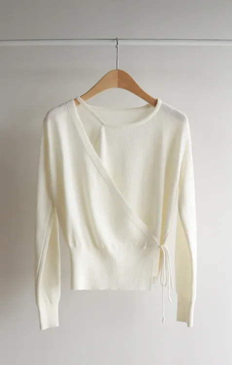[帶有裹身款式和肩縫的女性化裹身針織♥] [不對稱領口設計] [腰線上有綁帶蝴蝶結!
