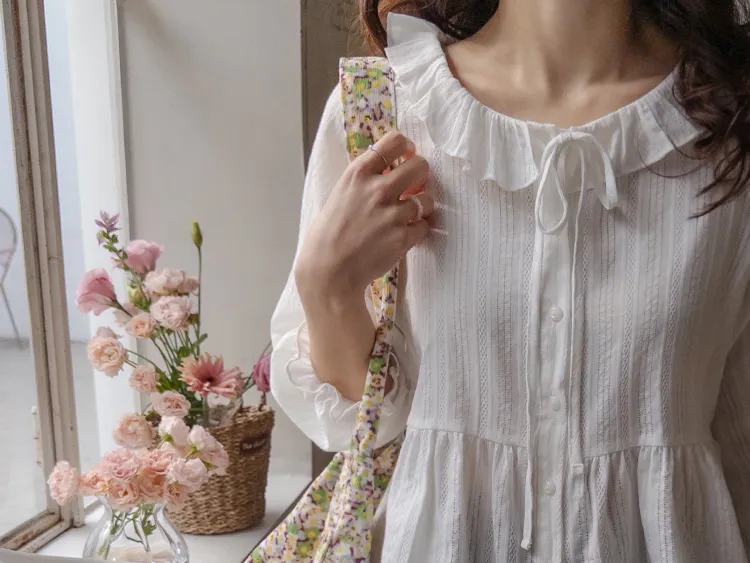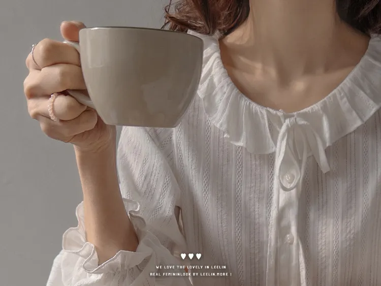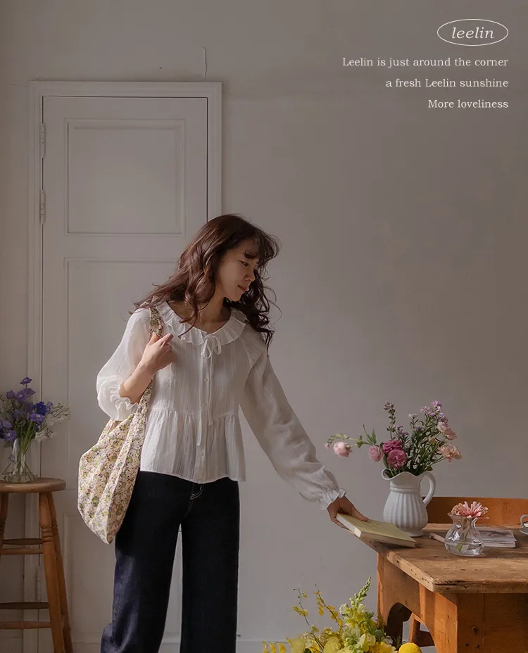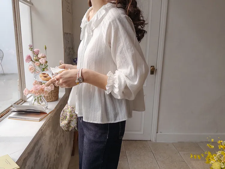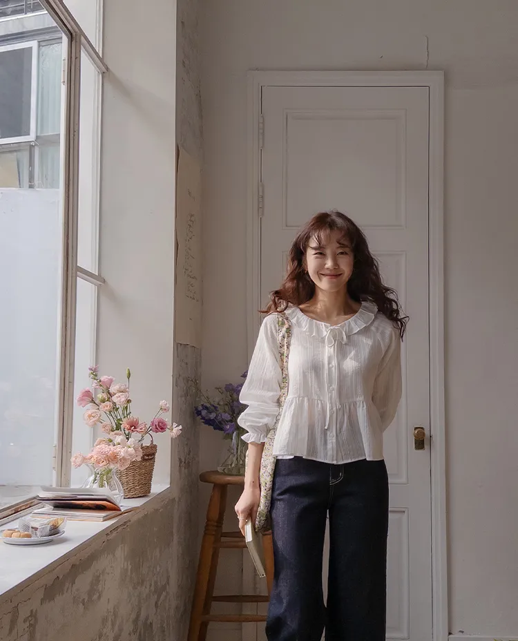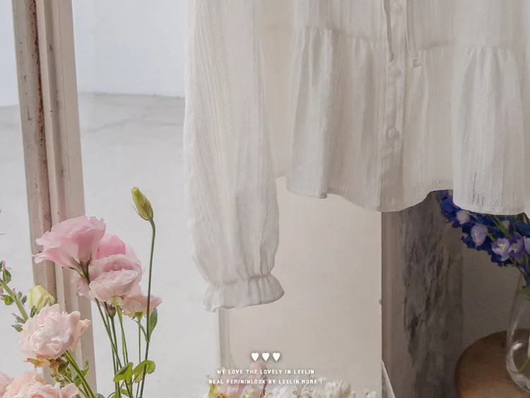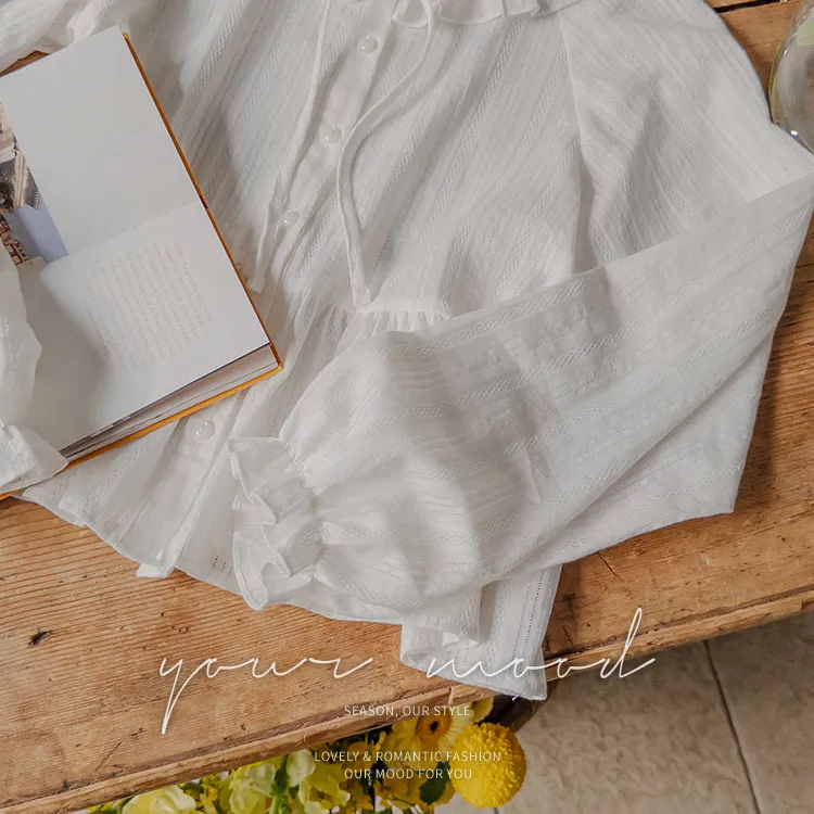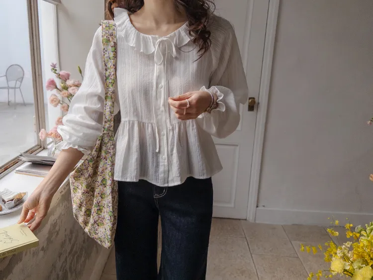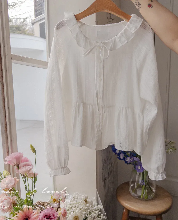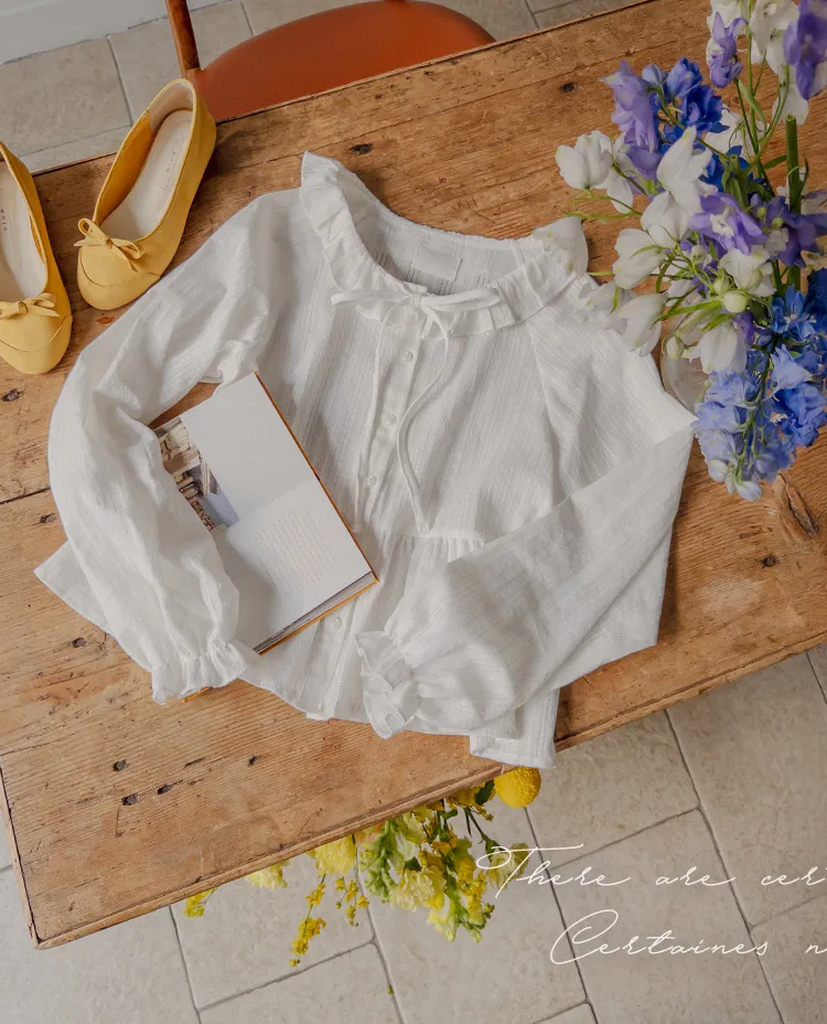 [腰部有褶皺細節,打造腰身線條! ] [繫帶設計,打造多種造型] [可愛的荷葉邊領口細節] [袖口束邊舒適〜]