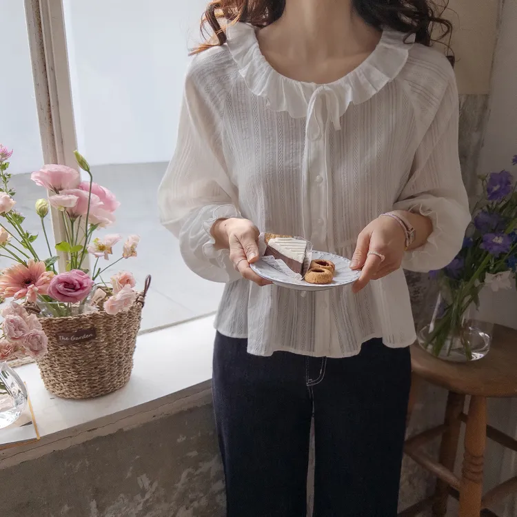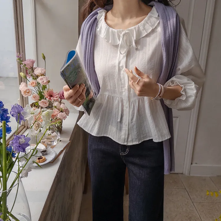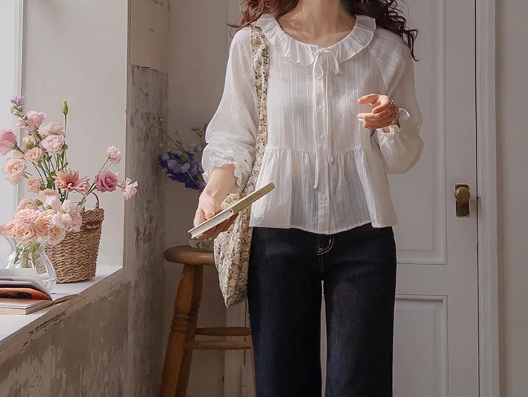 可愛摺邊領口綁帶腰線褶皺袖口束摺邊排扣上衣