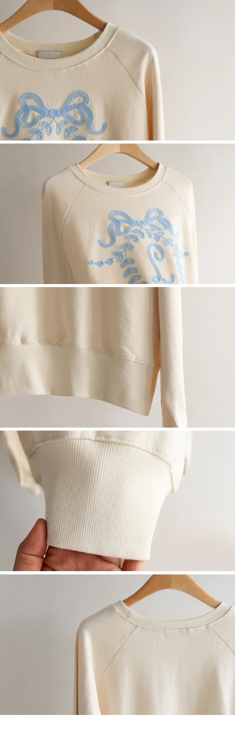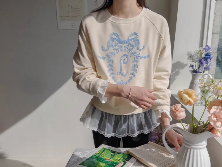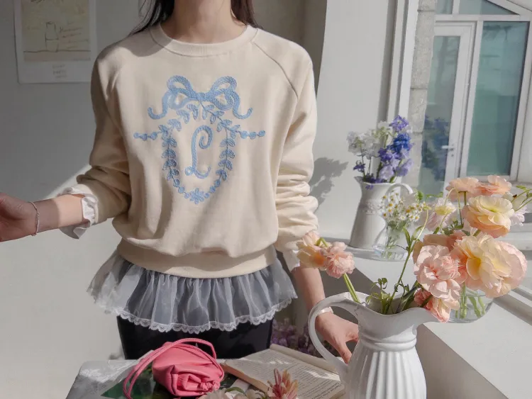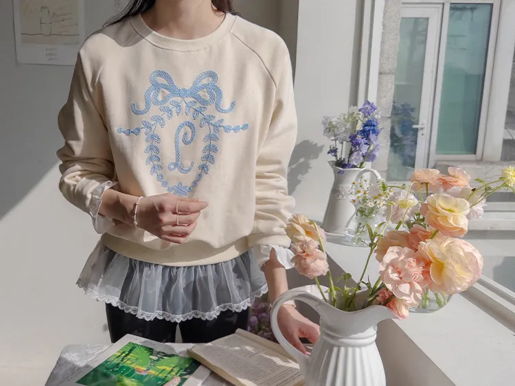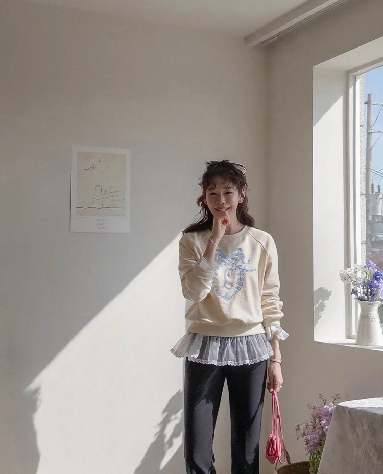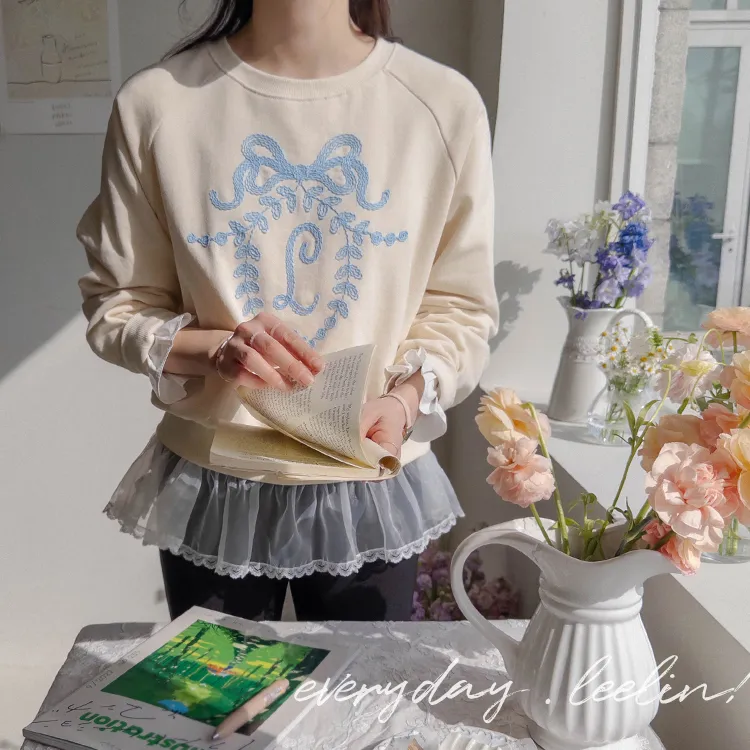 可愛立體蝴蝶結刺繡落肩穿搭上衣