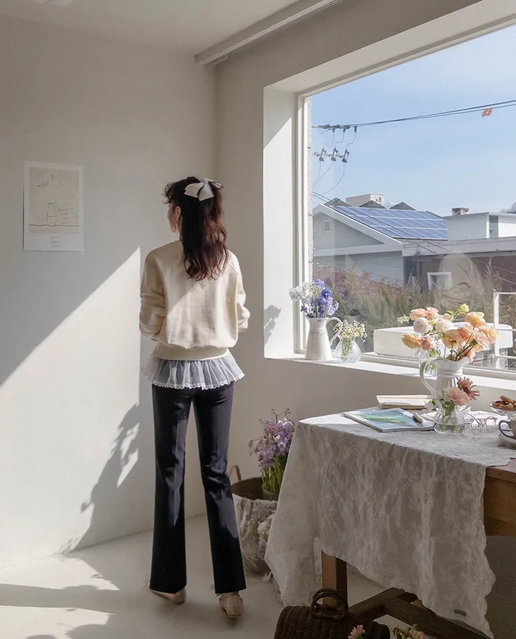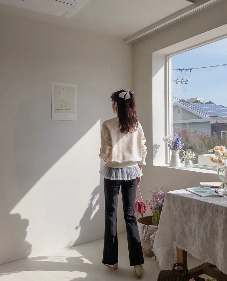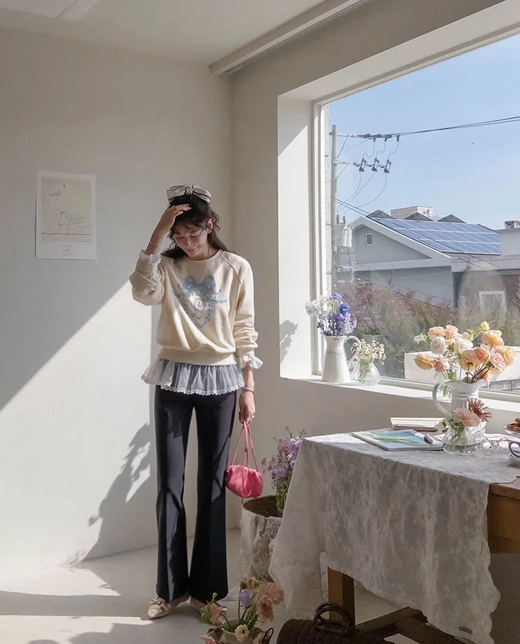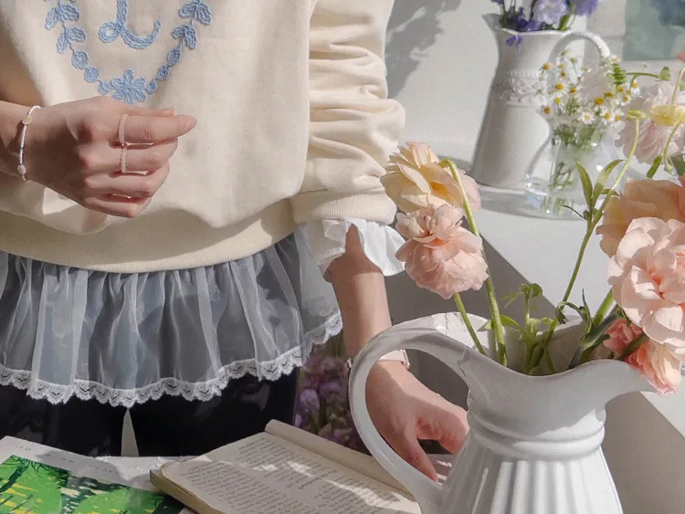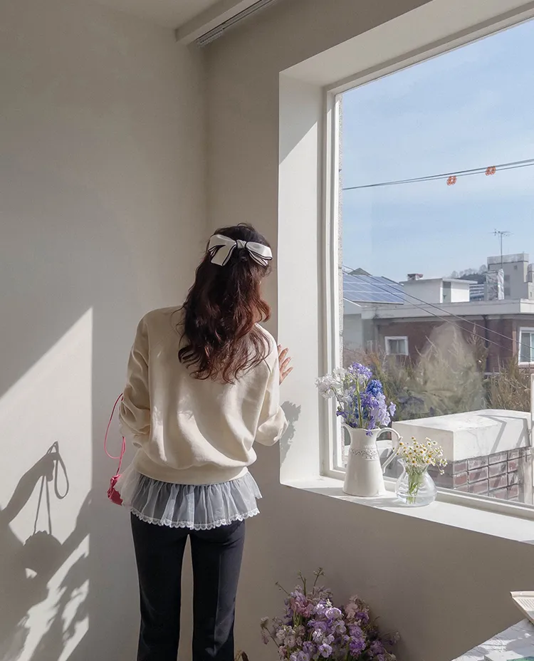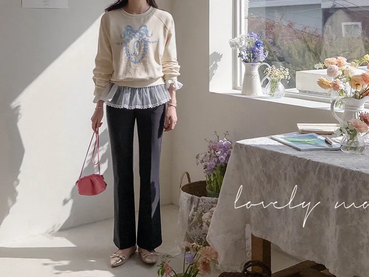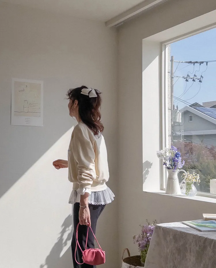 可愛立體蝴蝶結刺繡落肩穿搭上衣