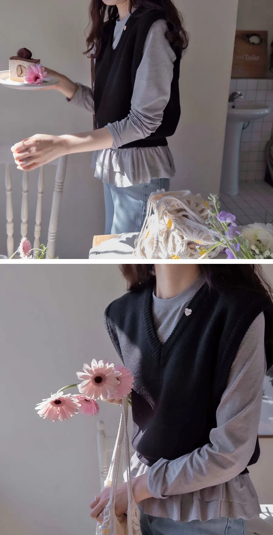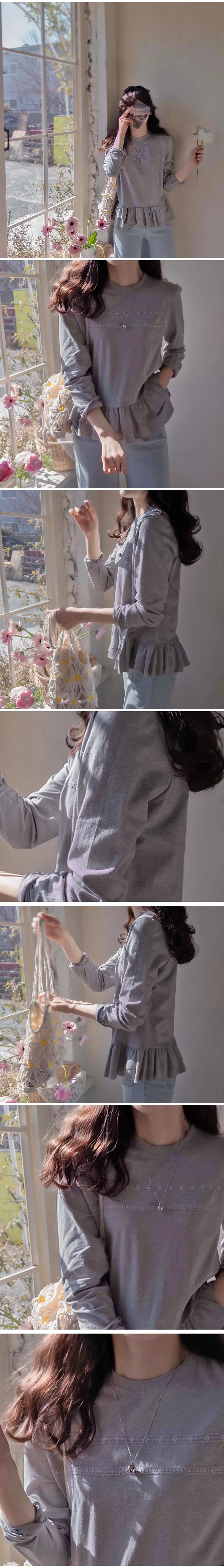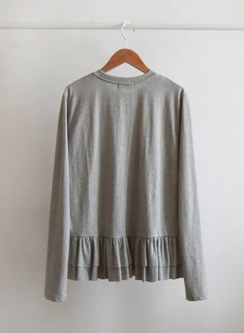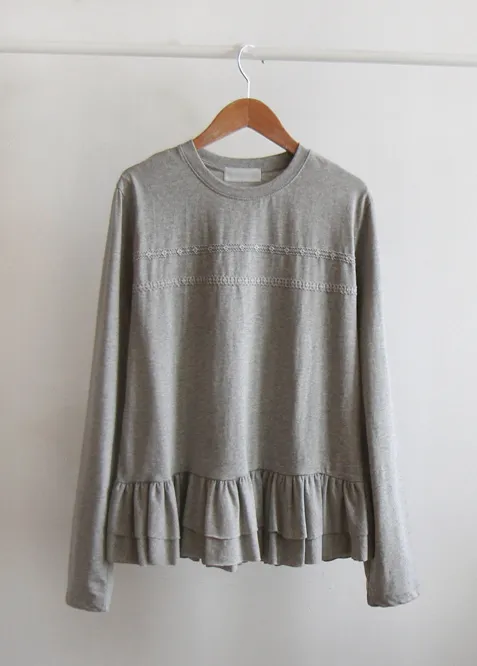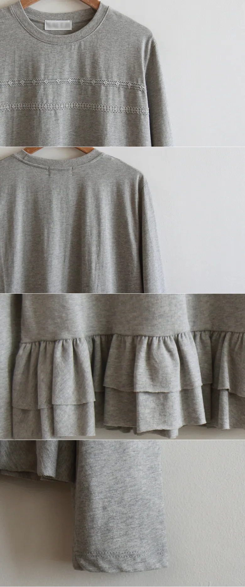 點綴蕾絲花紋柔軟彈性層次摺邊下擺上衣 現貨灰