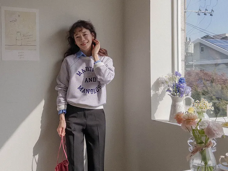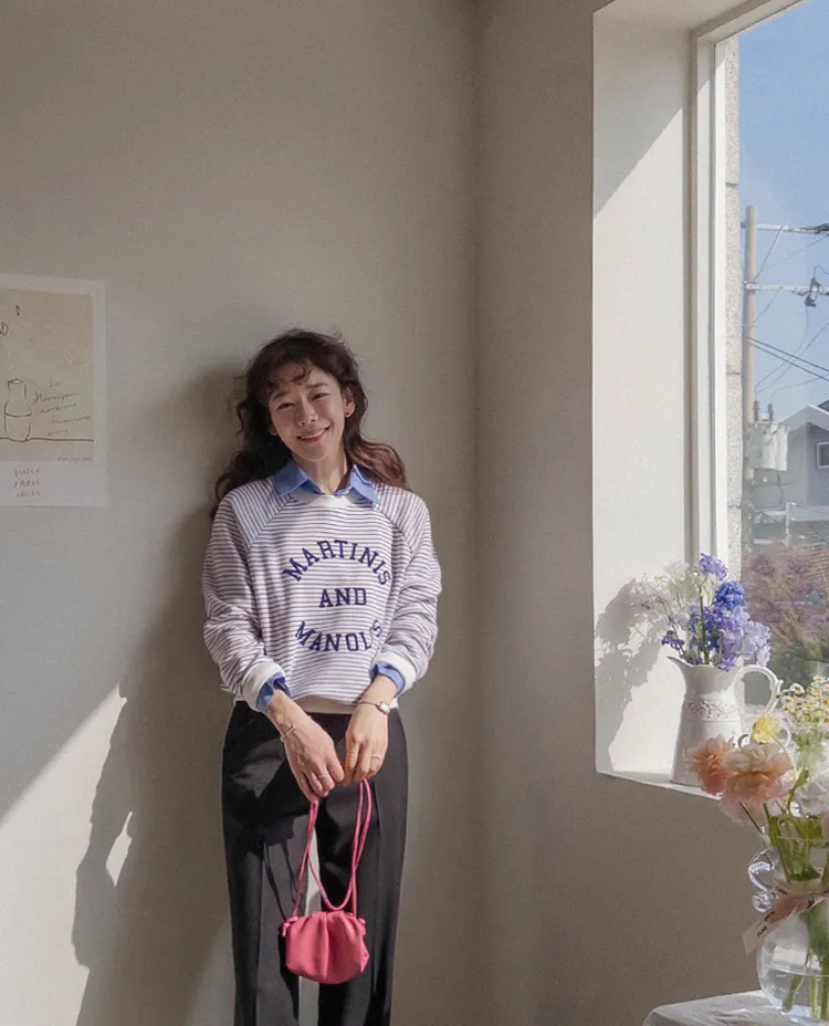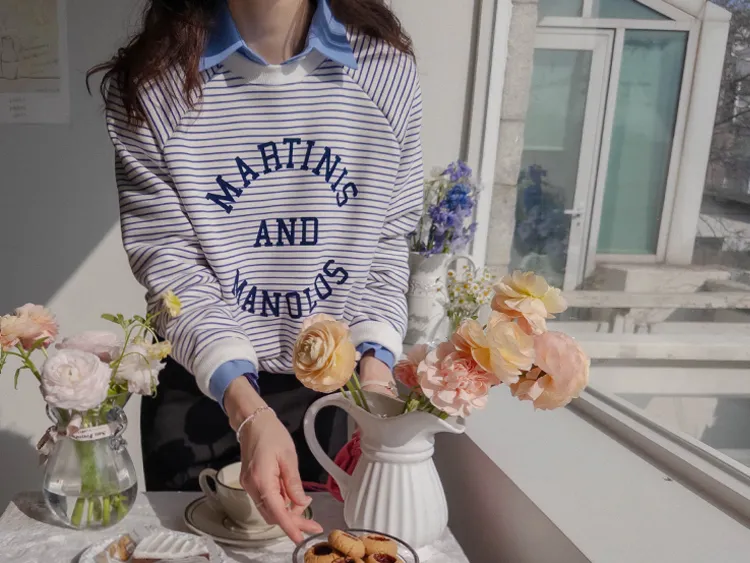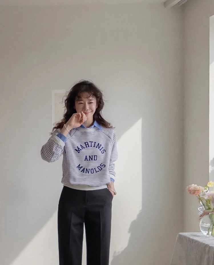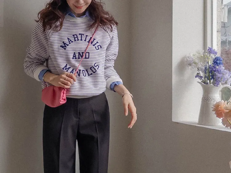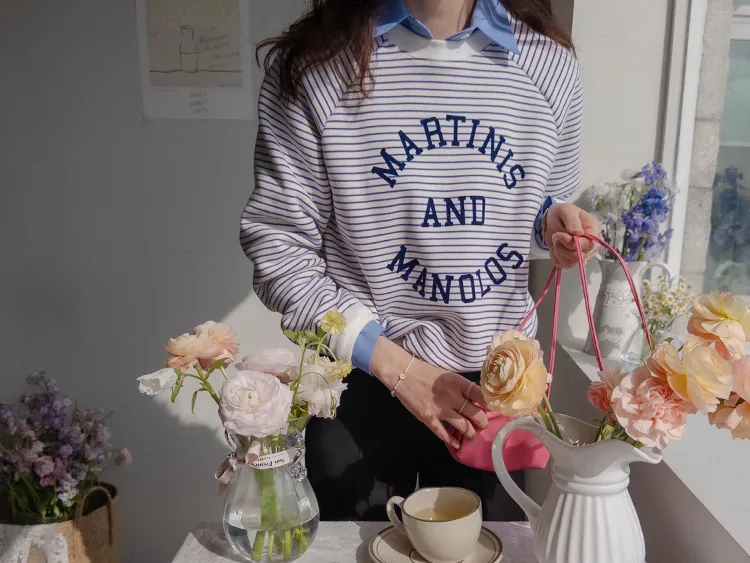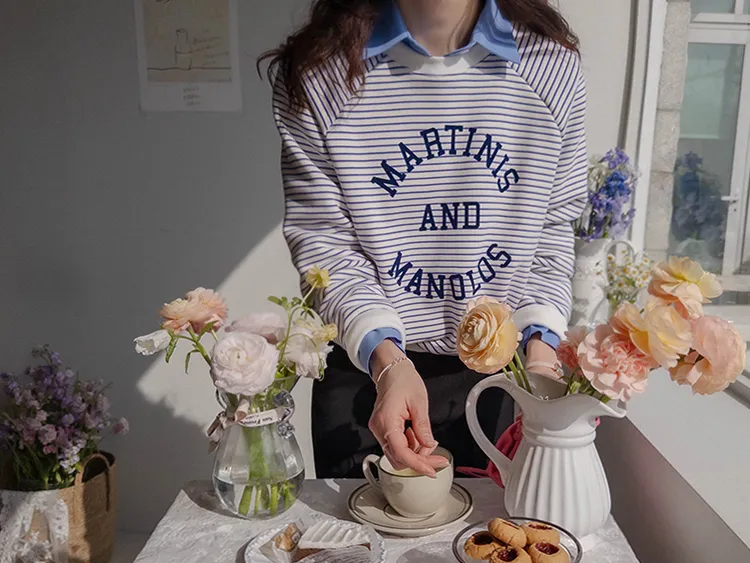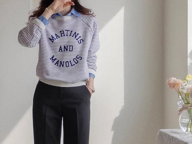 【現代風格!條紋圖案春季上衣♥] [末端有色塊] [從肩線垂落的輪廓] [寬鬆版型剪裁]