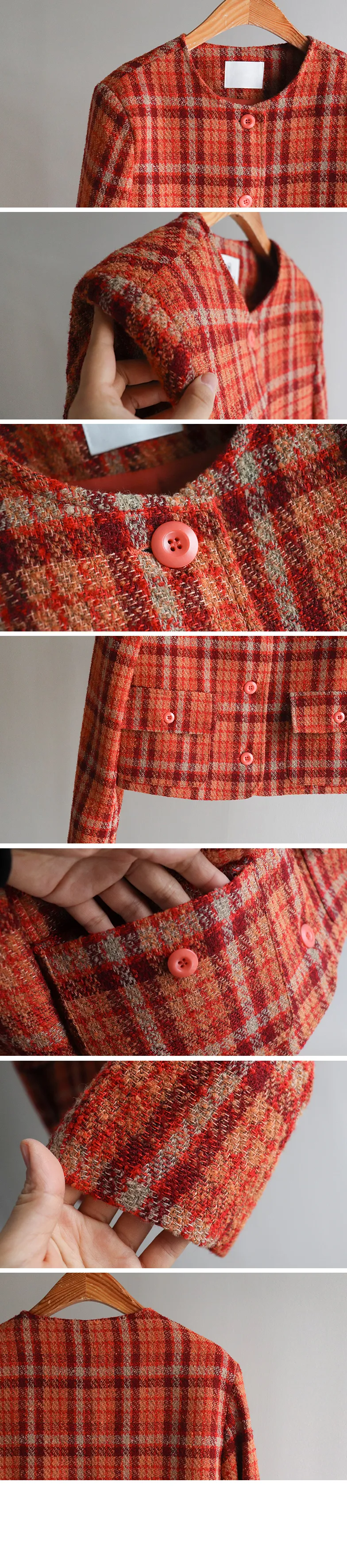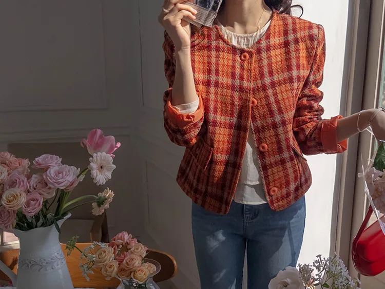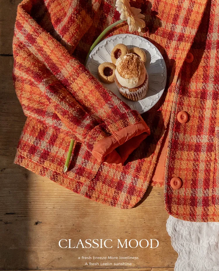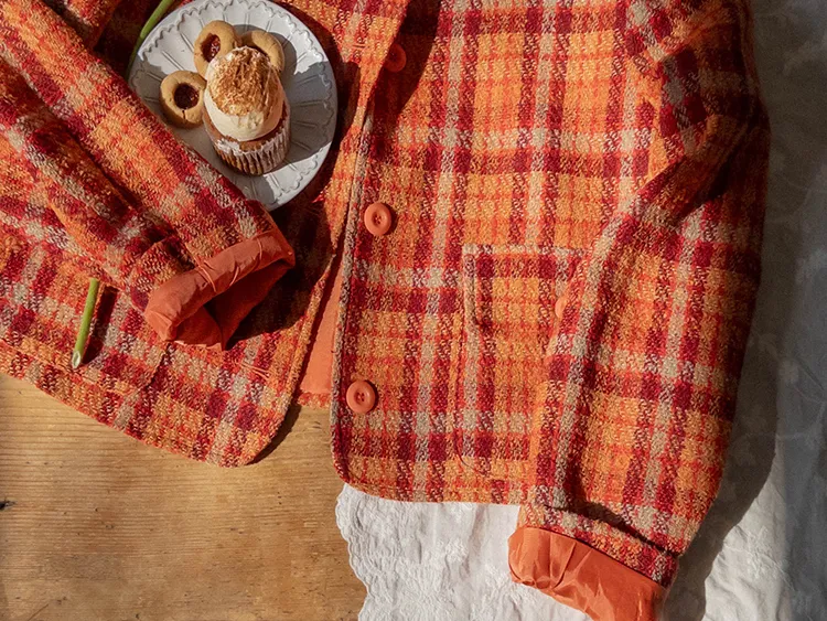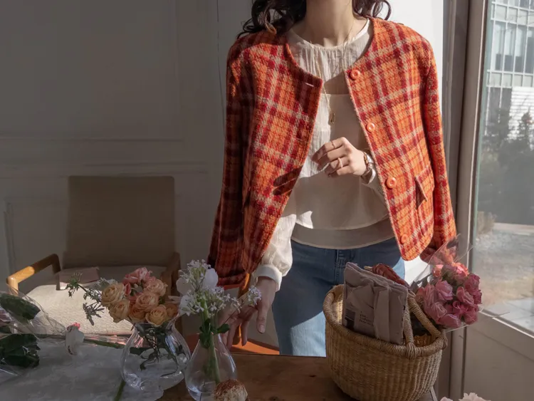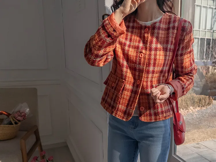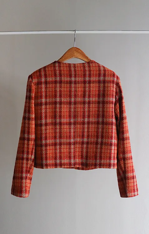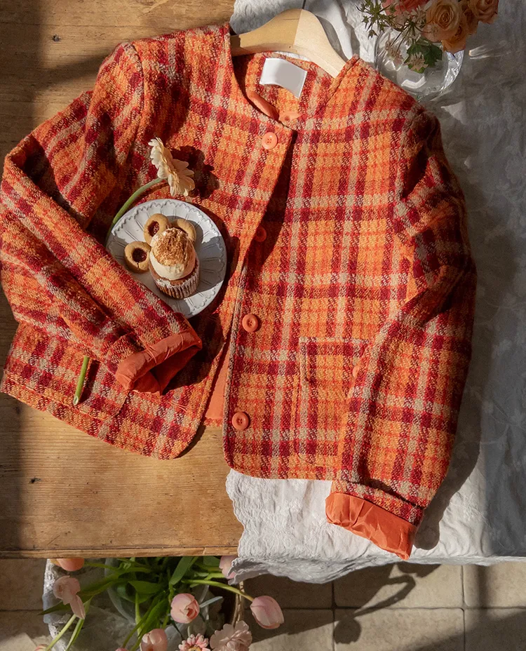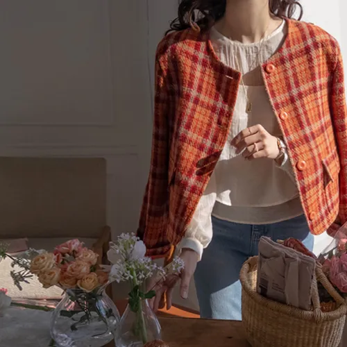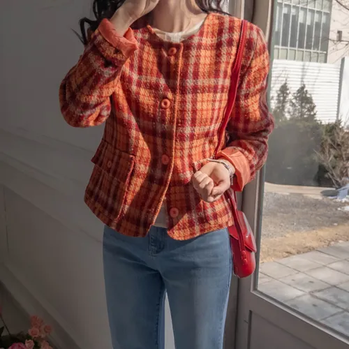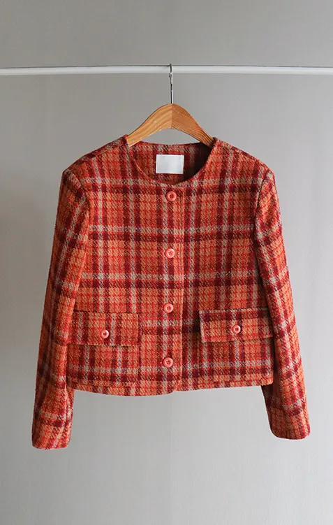 【橘色調引人注目的花呢外套♥】 【含30%羊毛】 【為整體造型錦上添花的單品】 【無領&圓領】