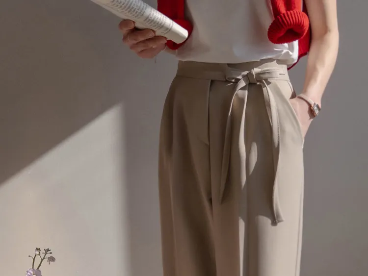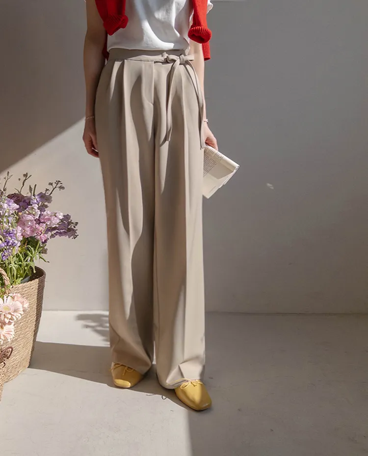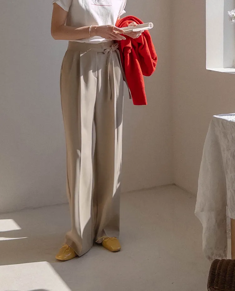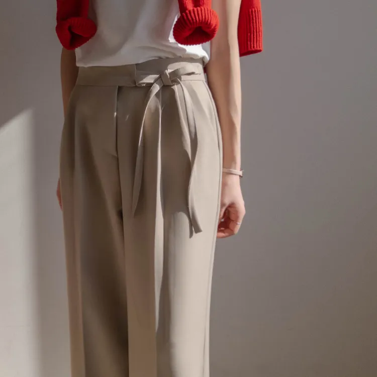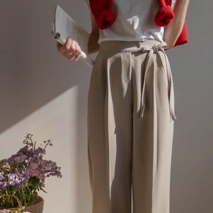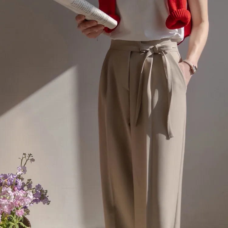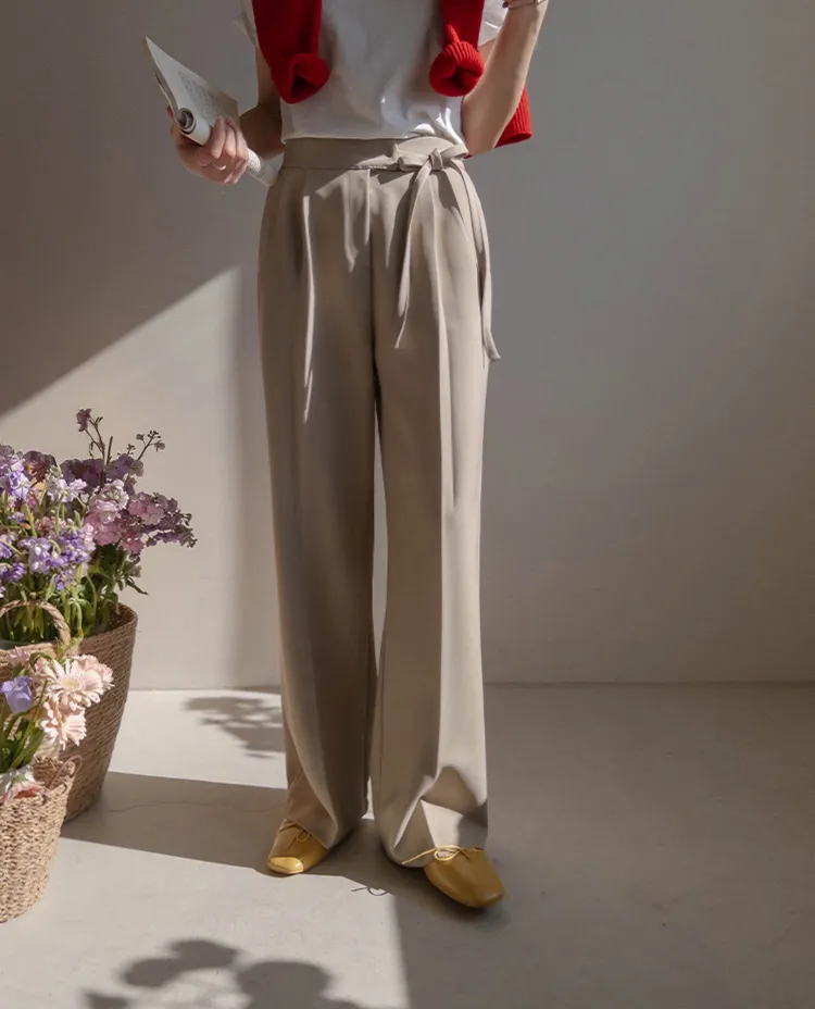 獨特雅緻腰側綁帶針摺直筒寬版休閒褲
