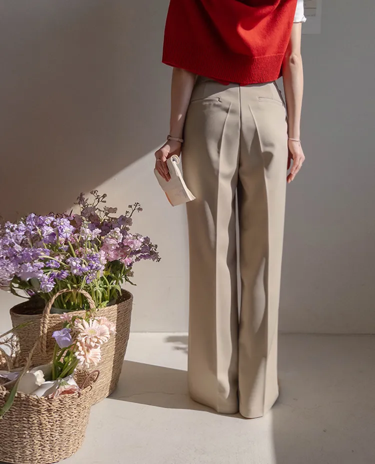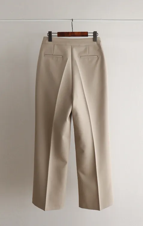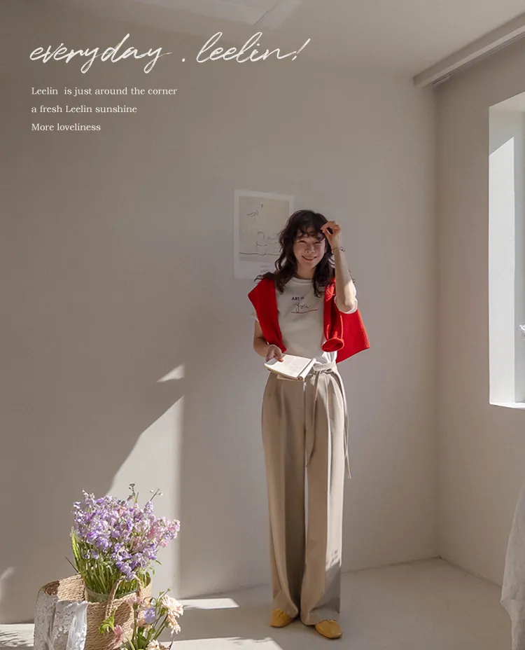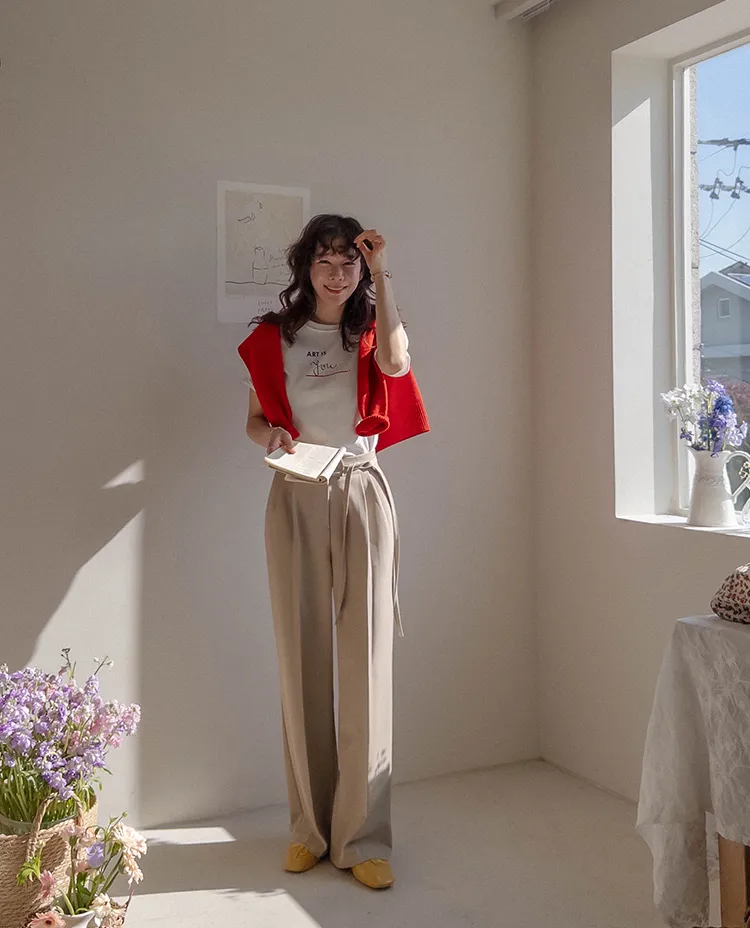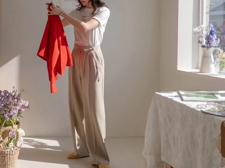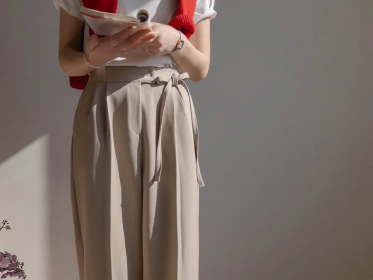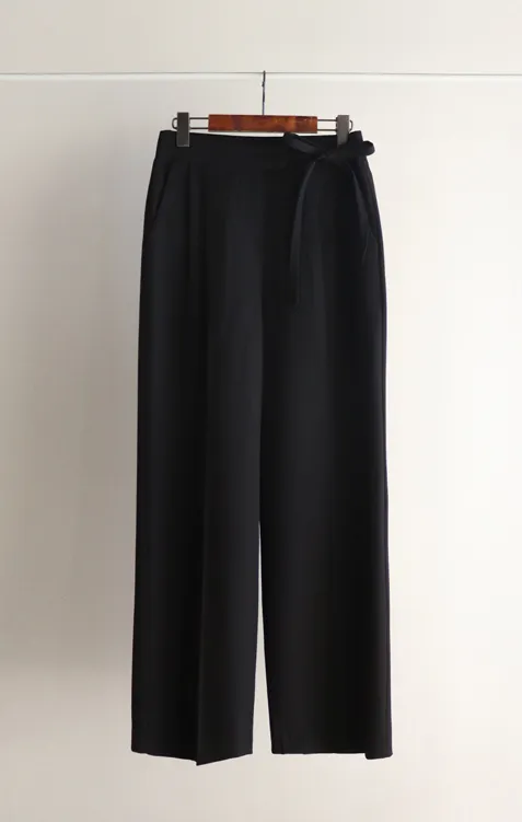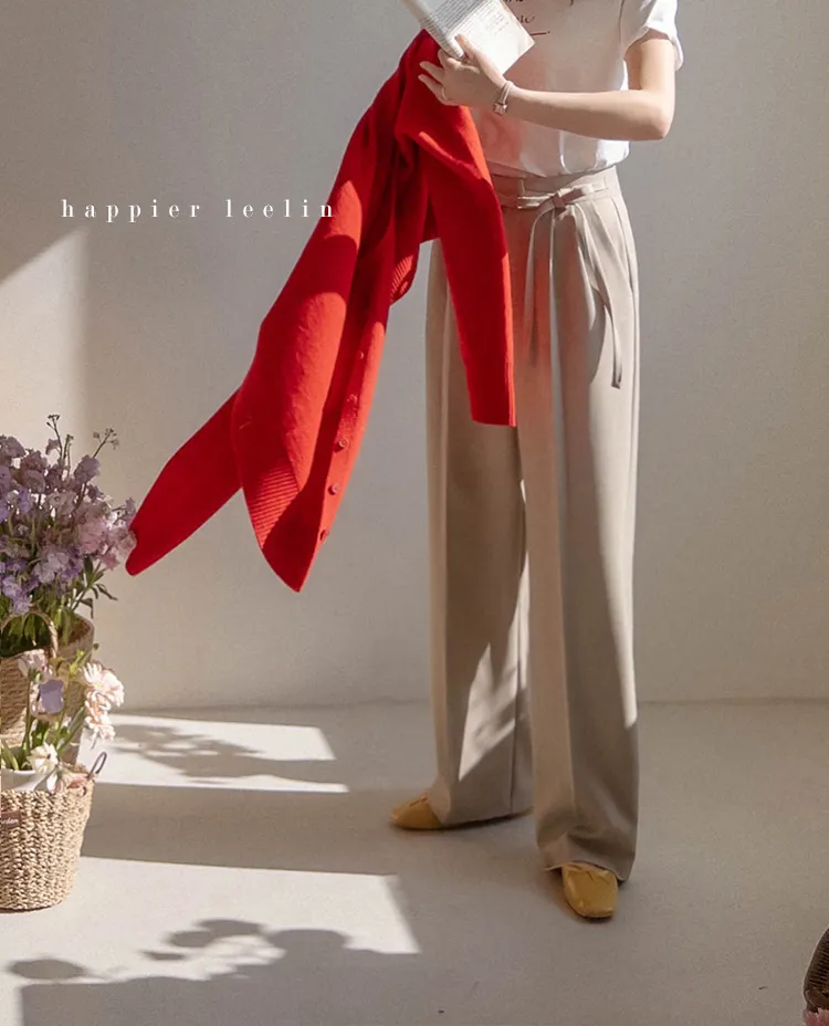獨特雅緻腰側綁帶針摺直筒寬版休閒褲