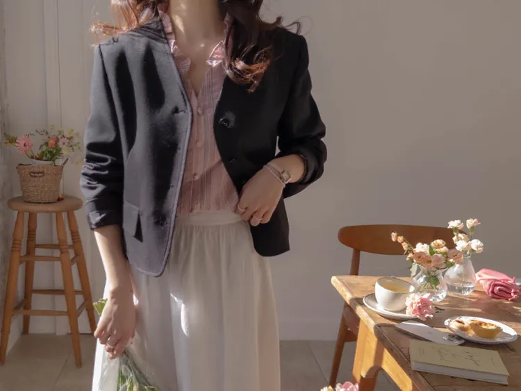 浪漫情調摺邊領口豆扣混色條紋排扣上衣