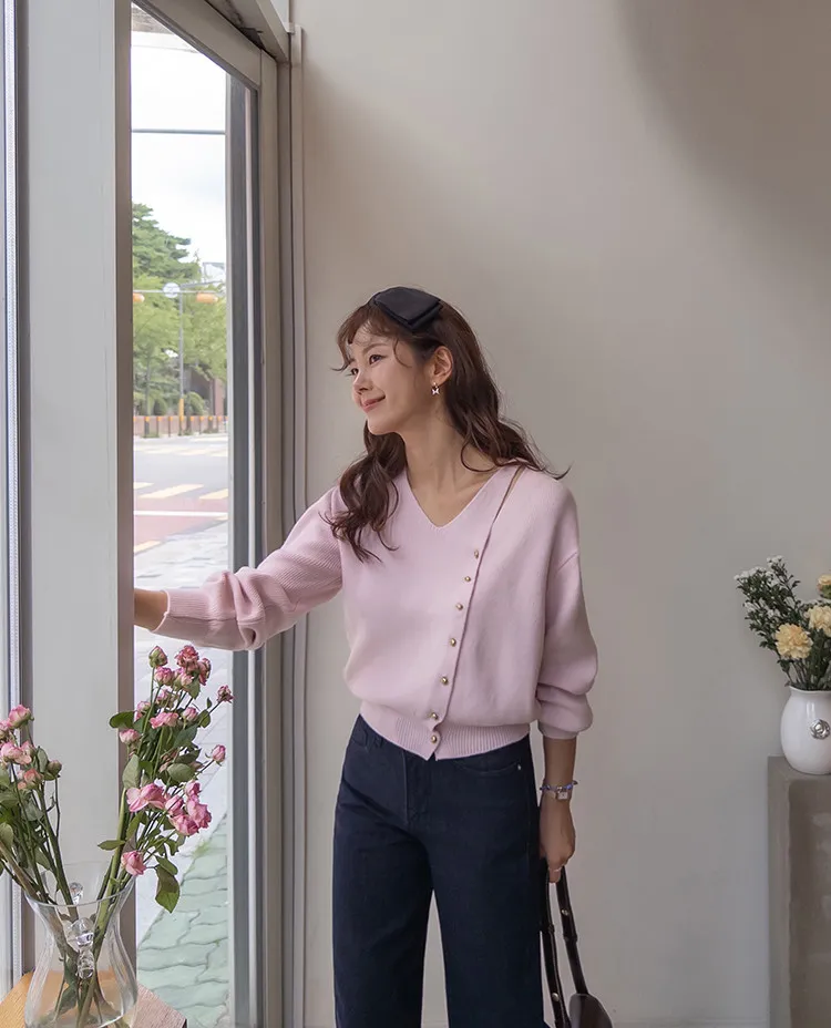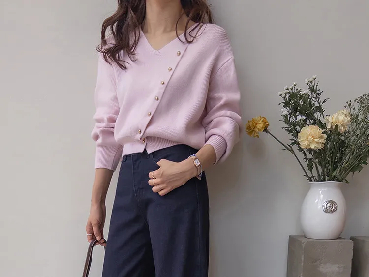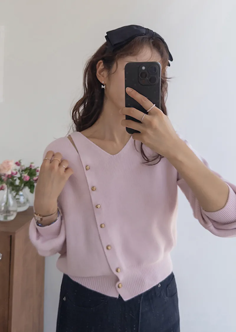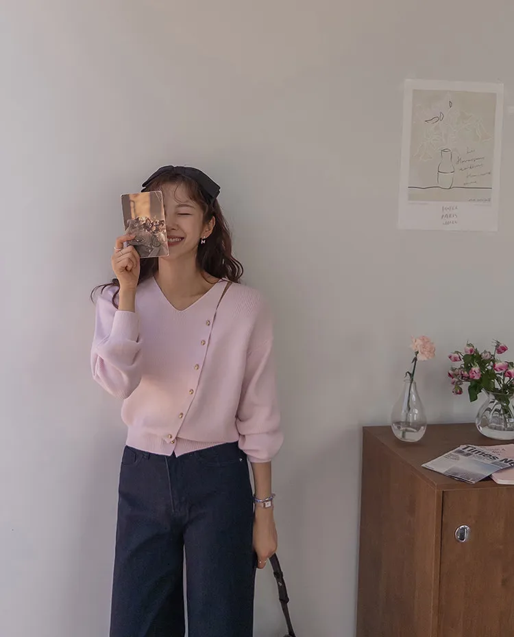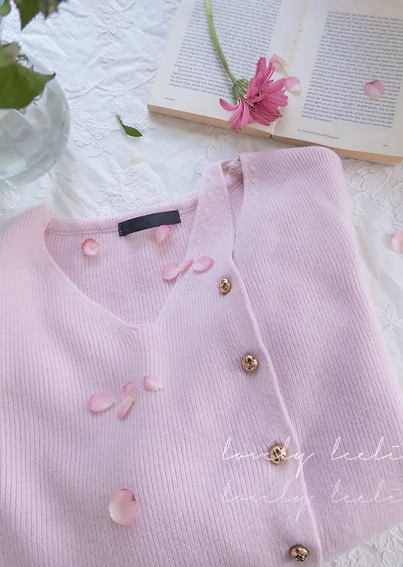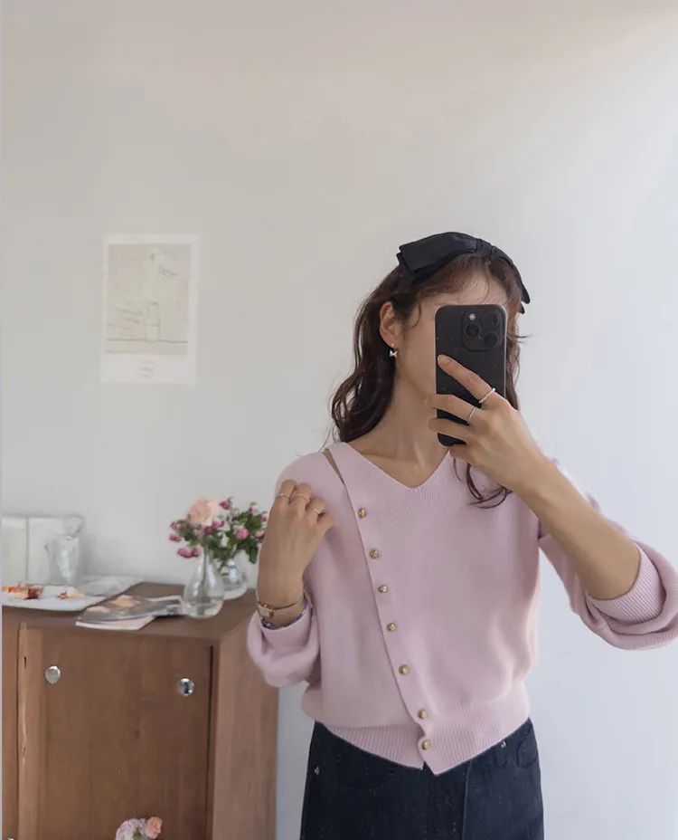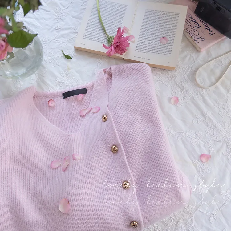 金色鈕扣] [柔軟且富有彈性的材質,穿著舒適] [充滿春天氣息的針織衫] [優雅甜美]