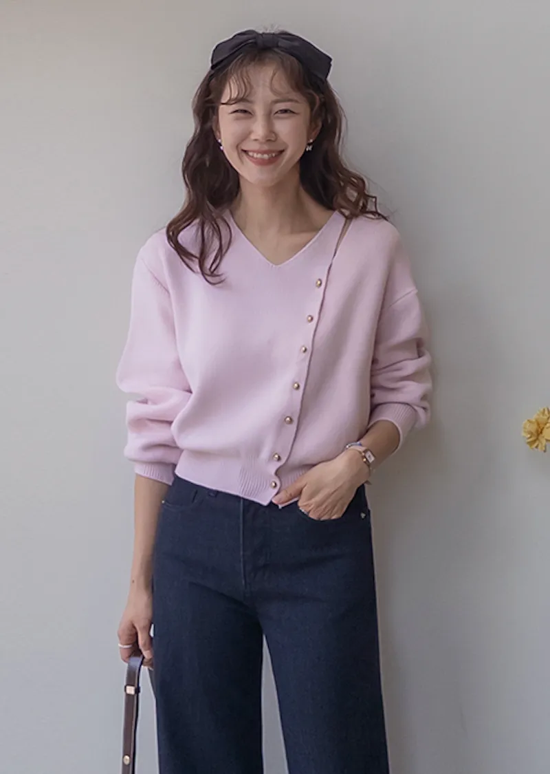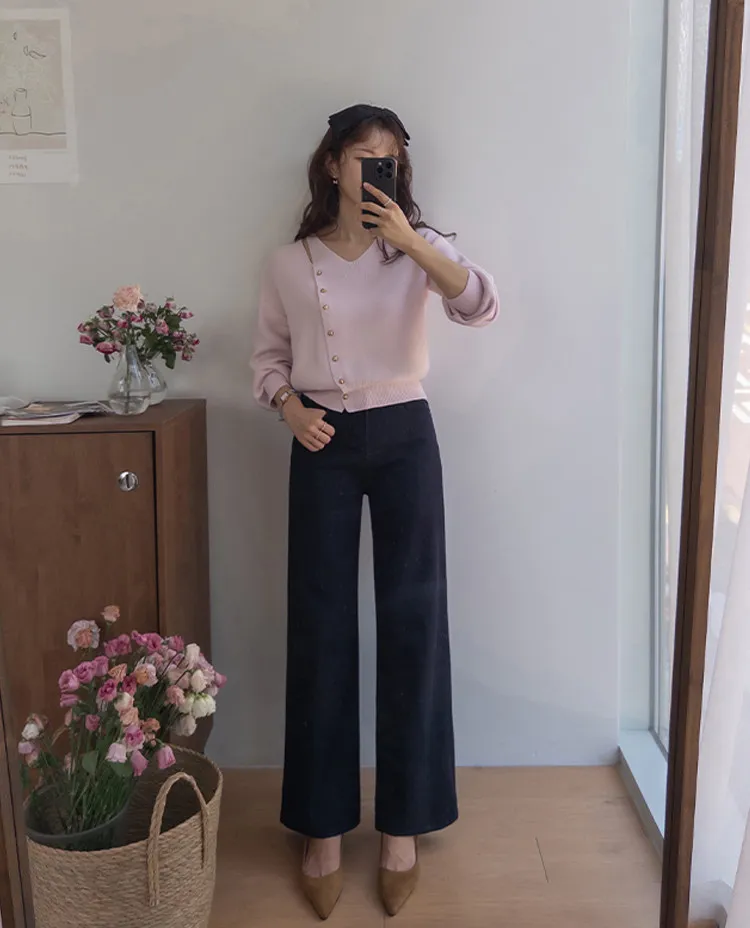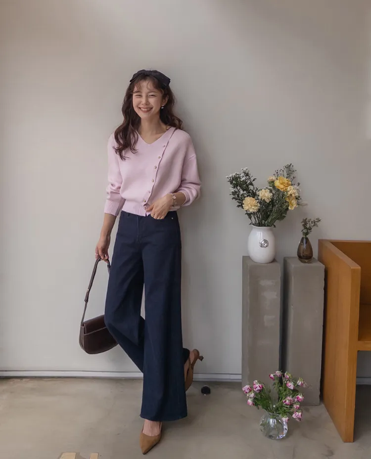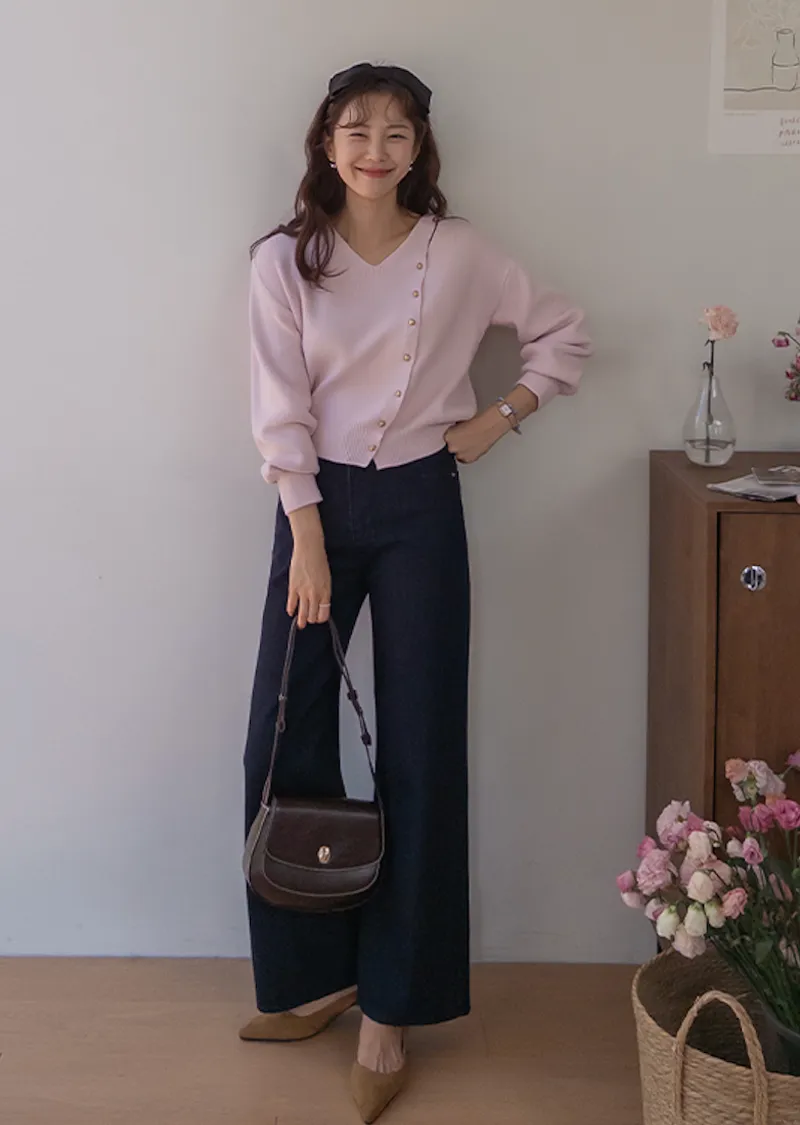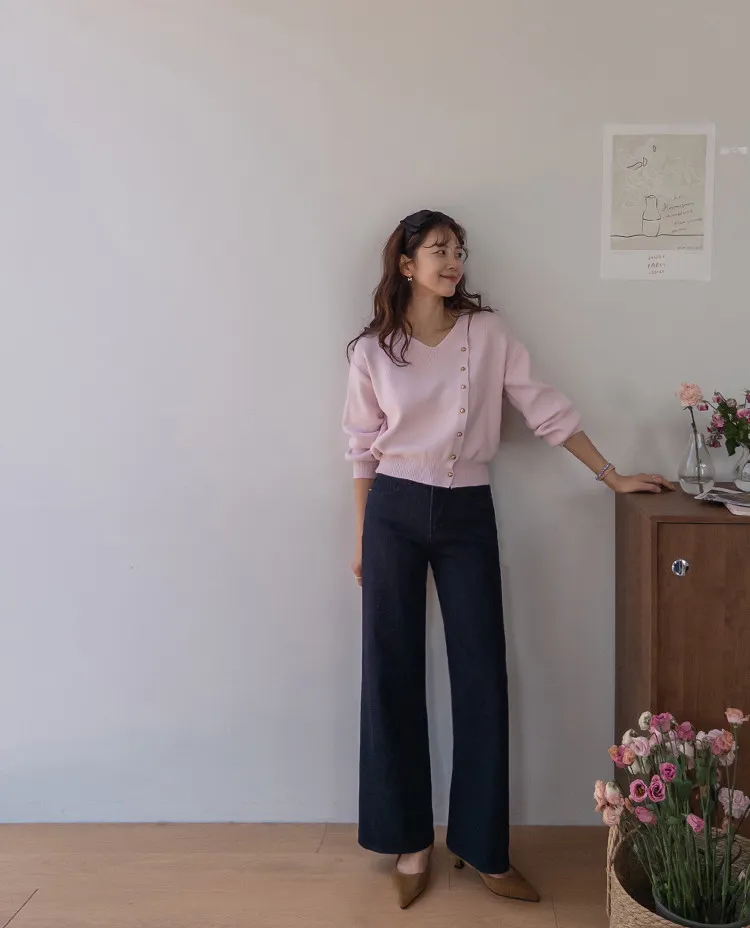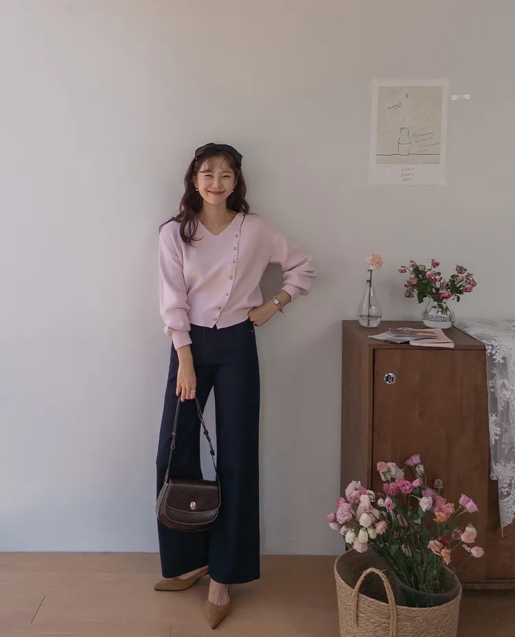 金色鈕扣] [柔軟且富有彈性的材質,穿著舒適] [充滿春天氣息的針織衫] [優雅甜美]