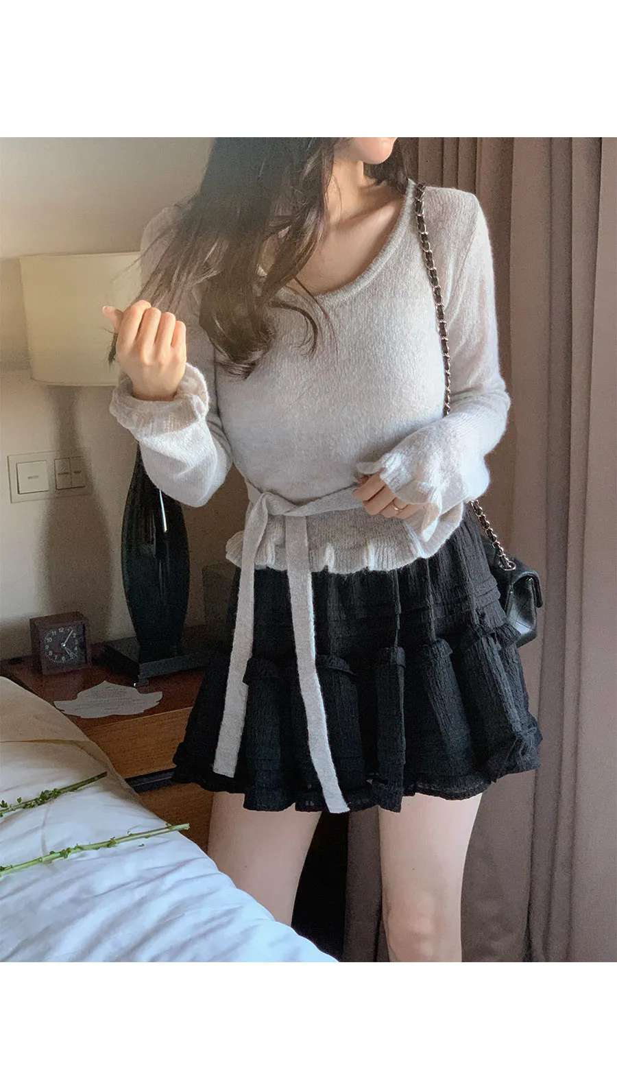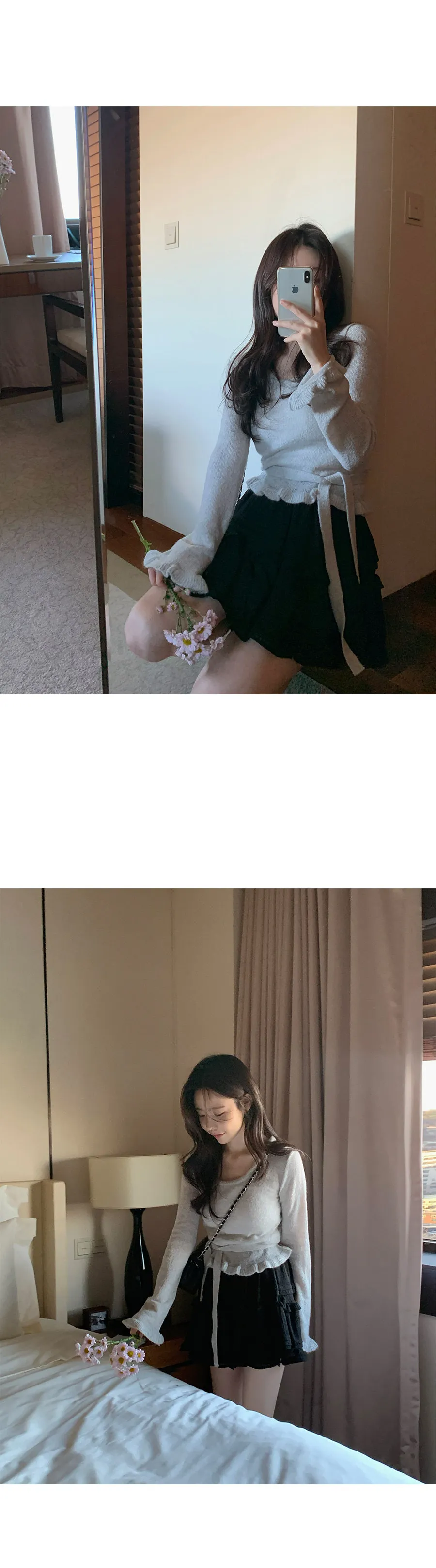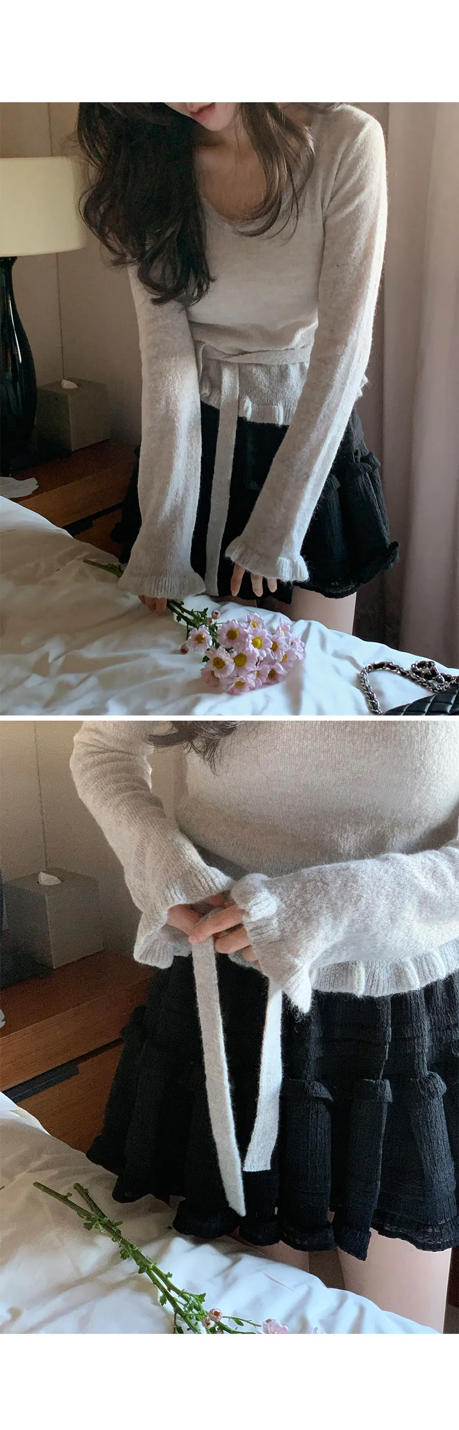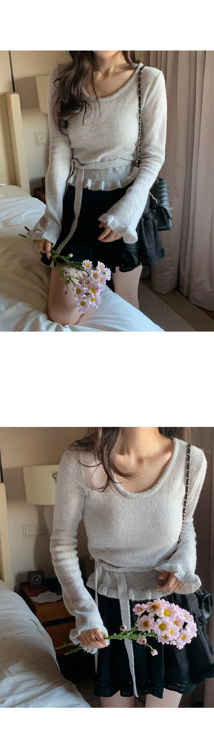 迷人輪廓摺邊下擺附綁帶針織上衣