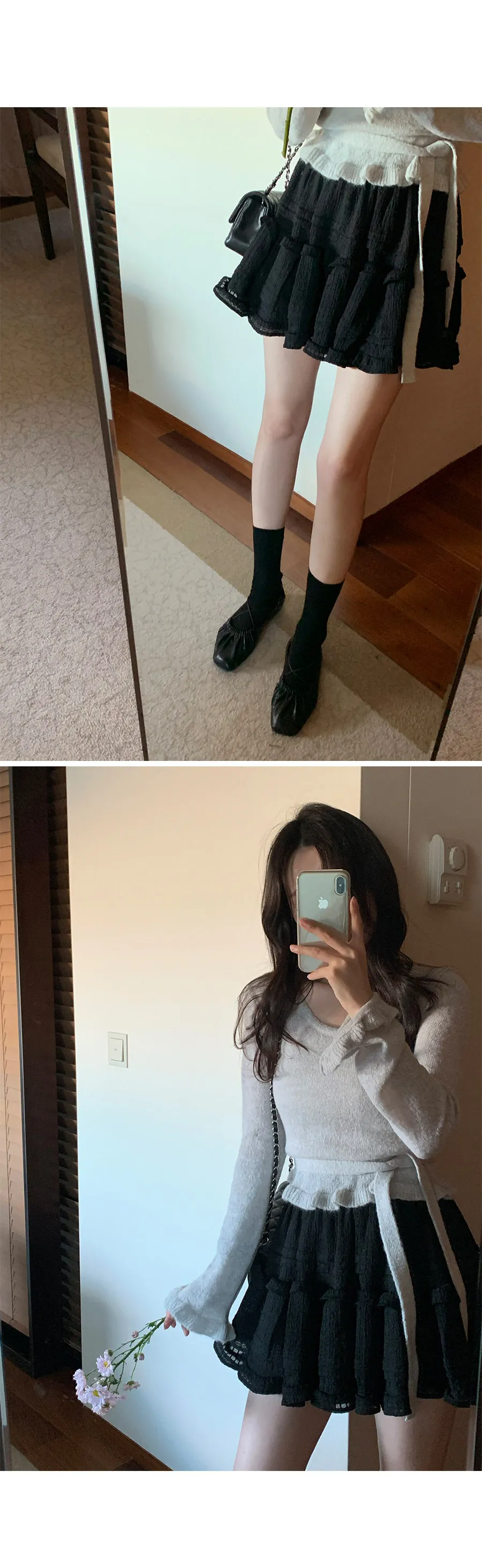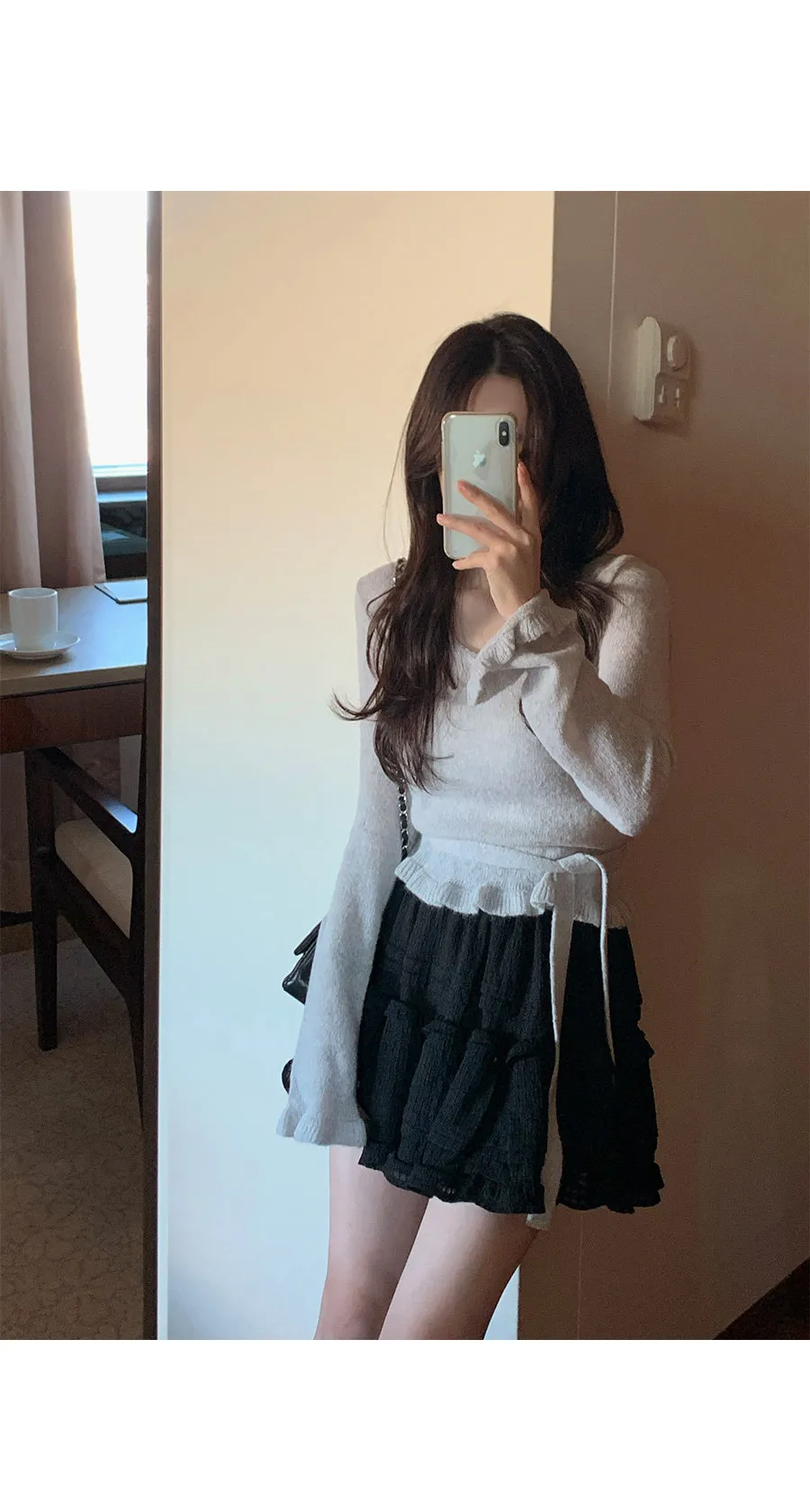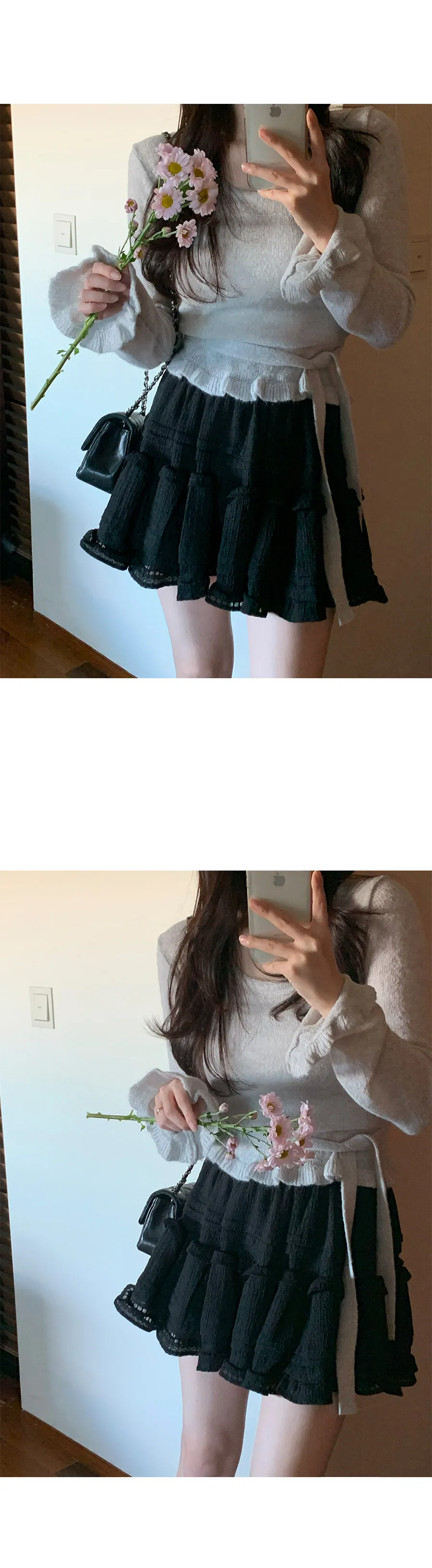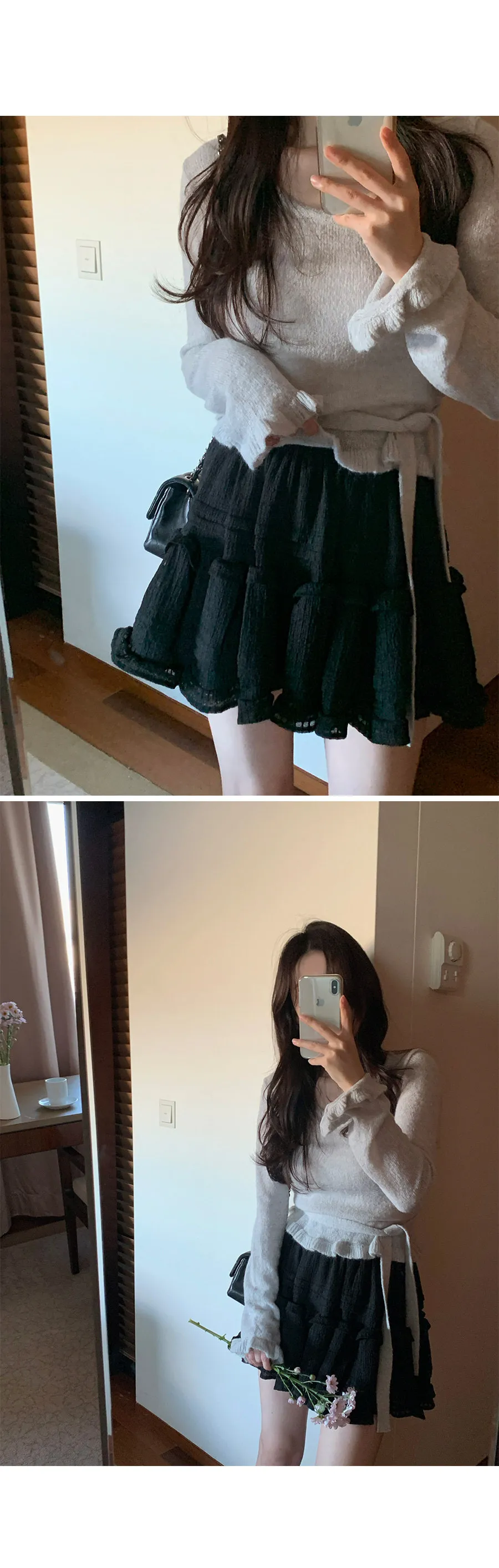 迷人輪廓摺邊下擺附綁帶針織上衣