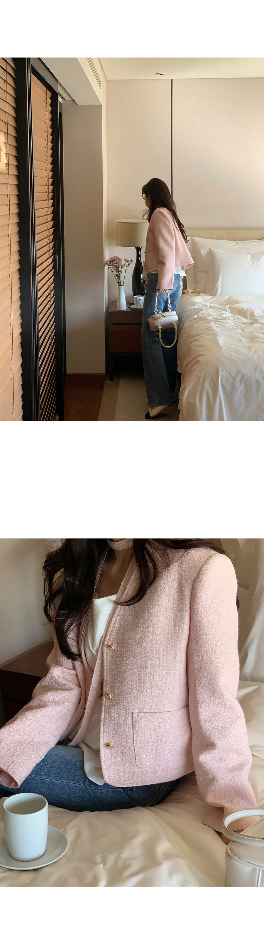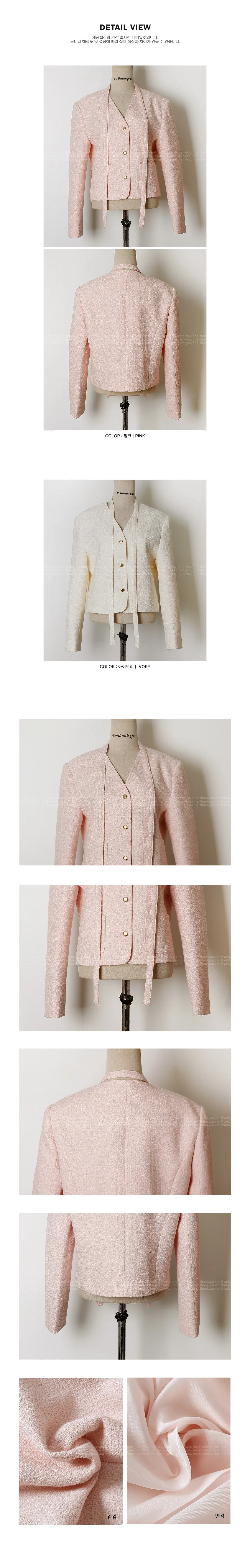 適合享受女性氣息的花呢外套套裝。採用立體感突出的花呢材質 ,可以開合的金色鈕扣營造出優雅的氛圍。 從袖孔到後背下擺的圓形褶線營造出乾淨而纖細的線條。 無領V領乾淨簡潔, 相同材質的領帶套裝為領口增添了焦點。 厚度足夠春秋季節穿著, 擁有兩個口袋非常實用。