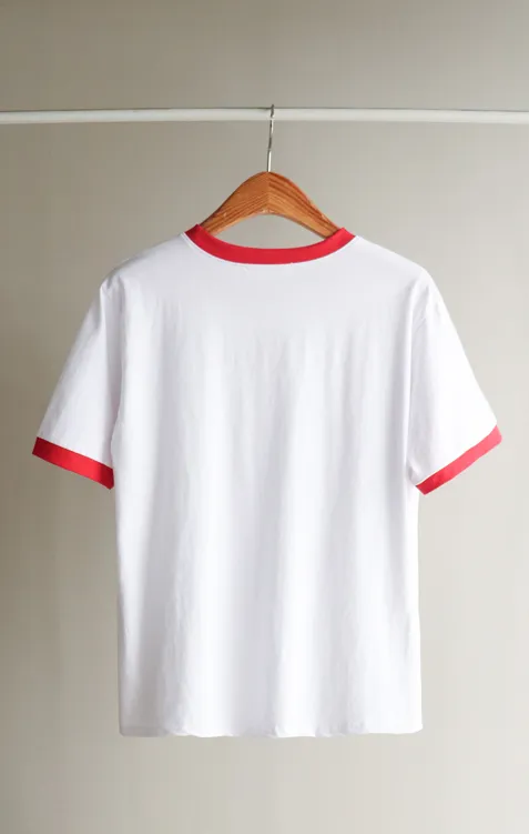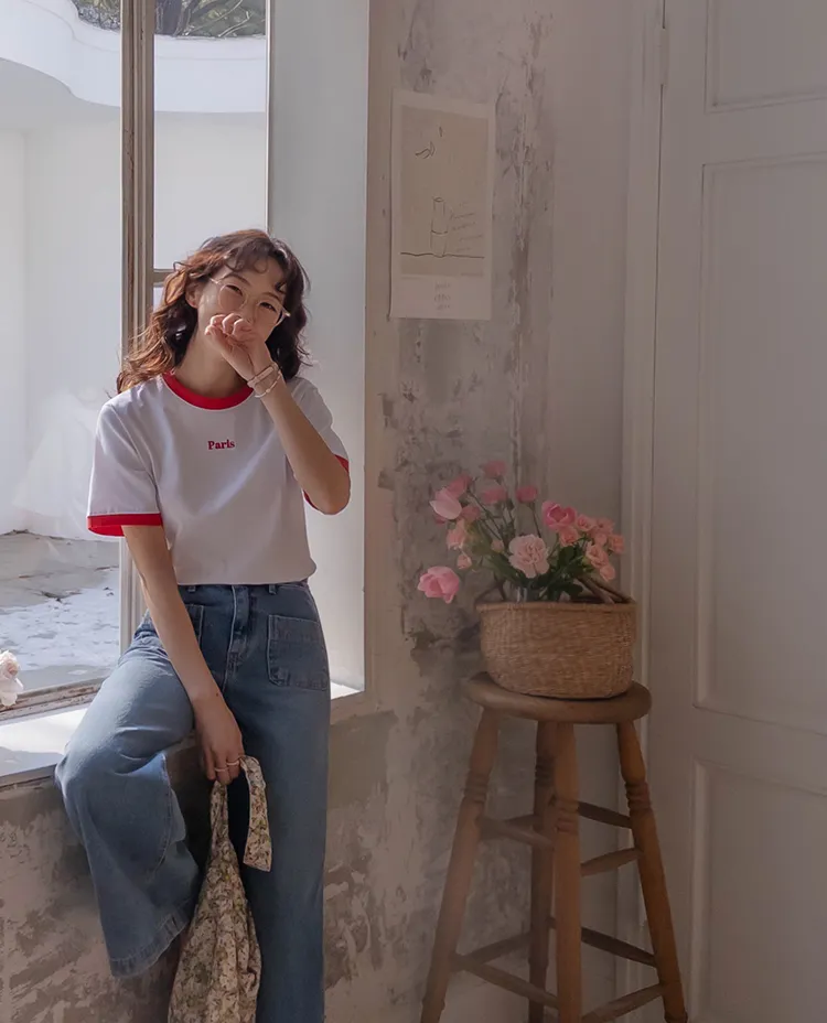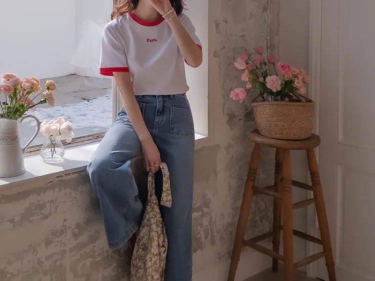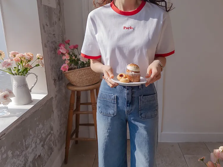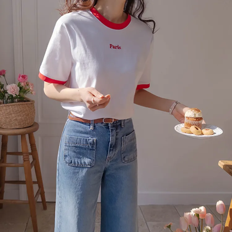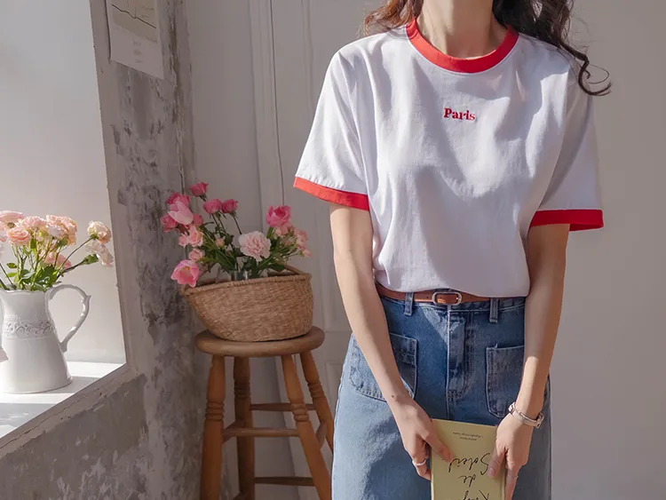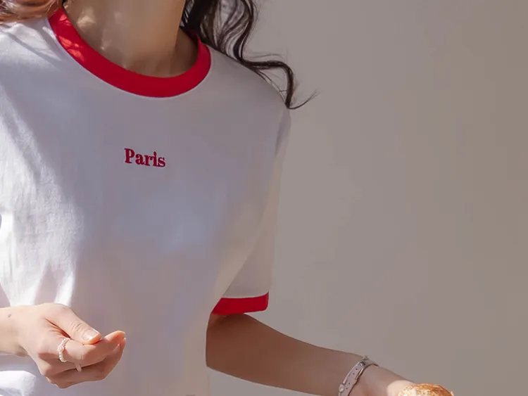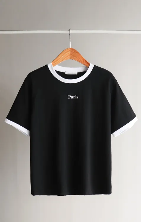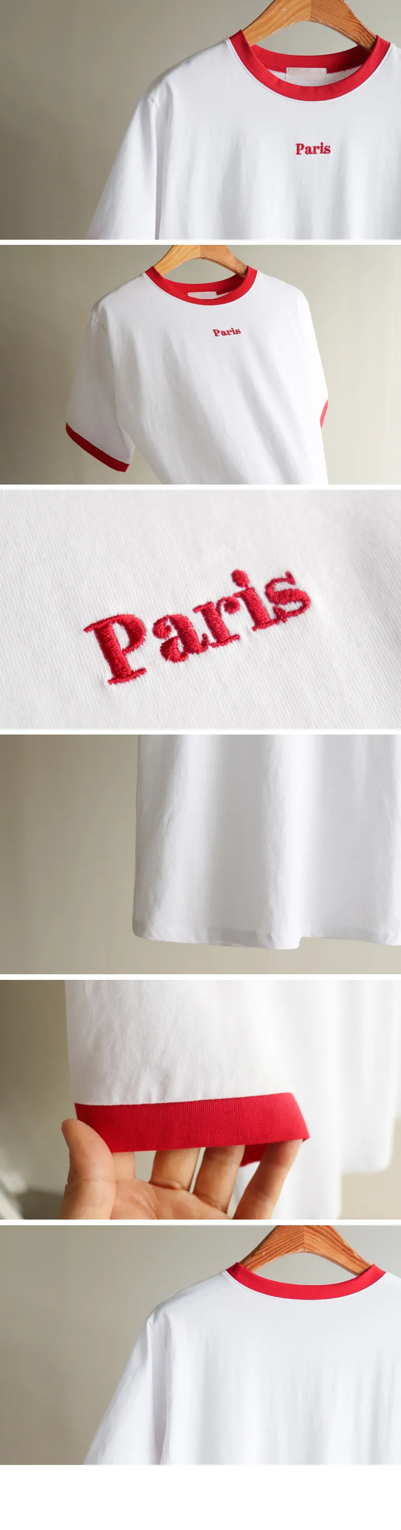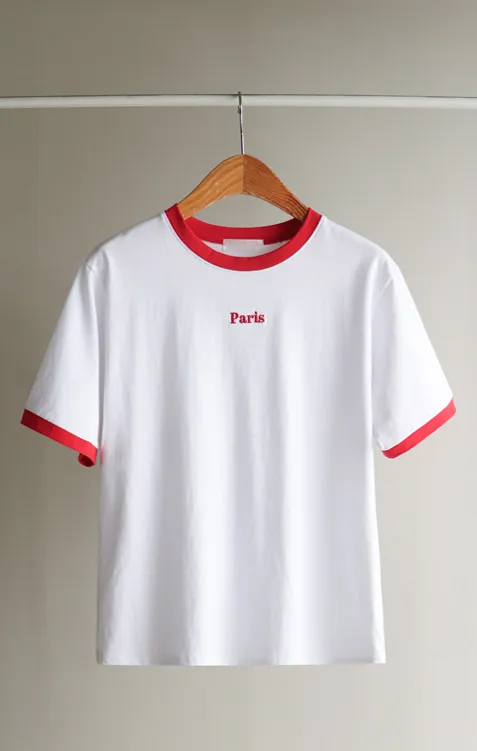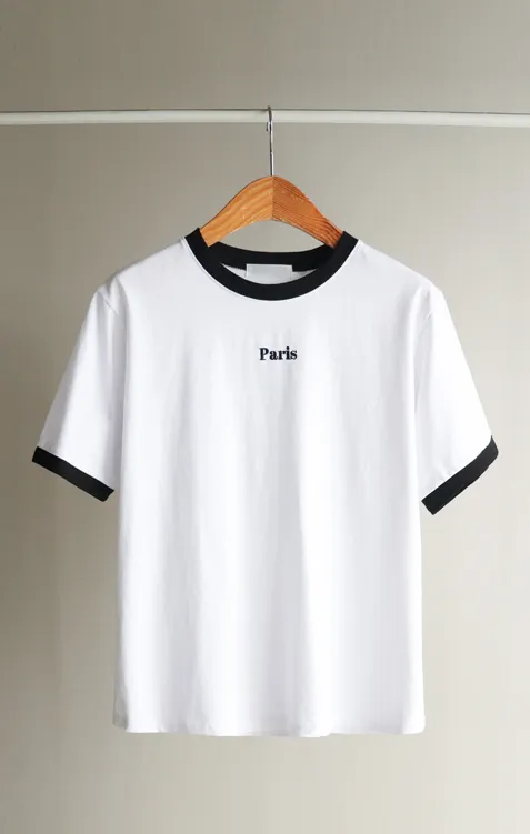 清新Paris字母刺繡配色邊棉質短袖上衣