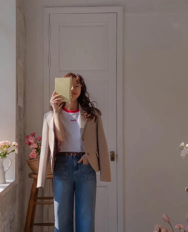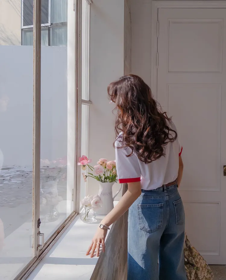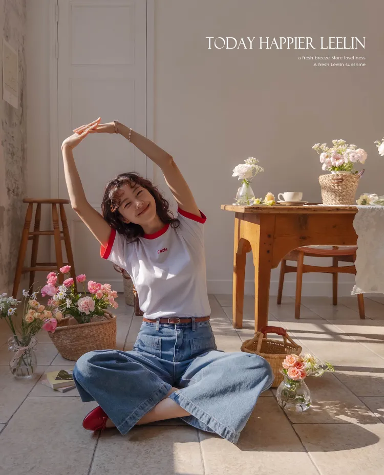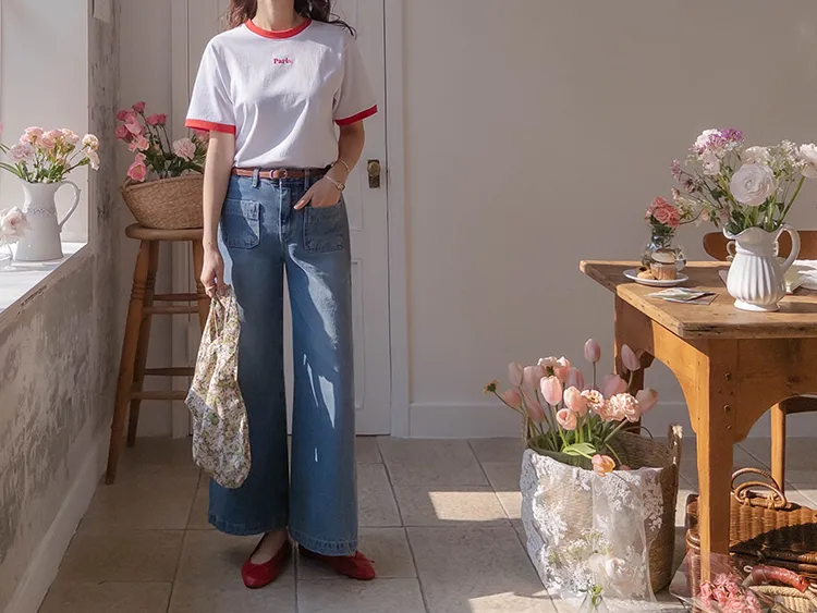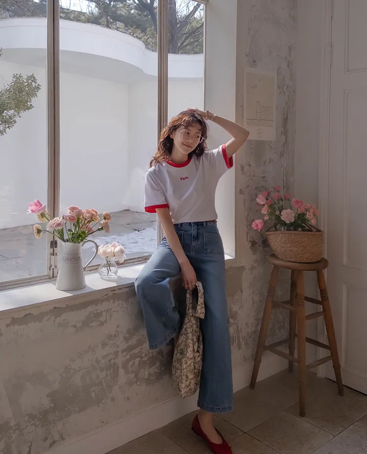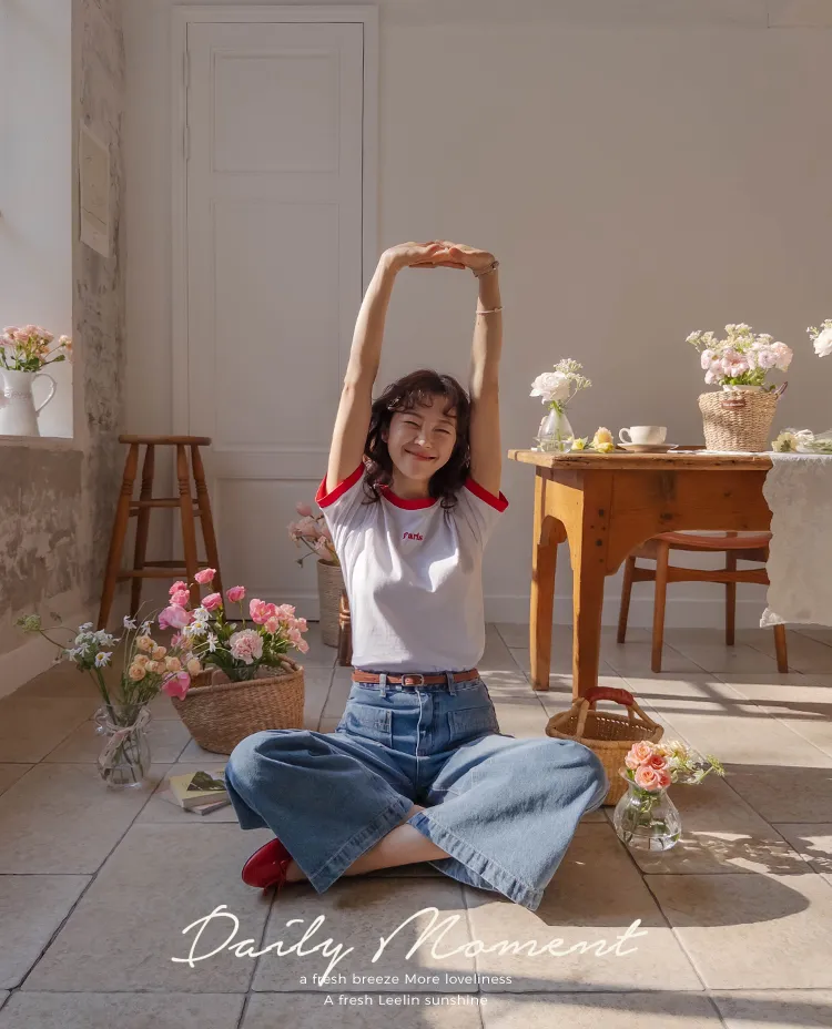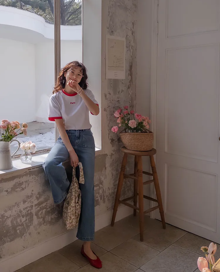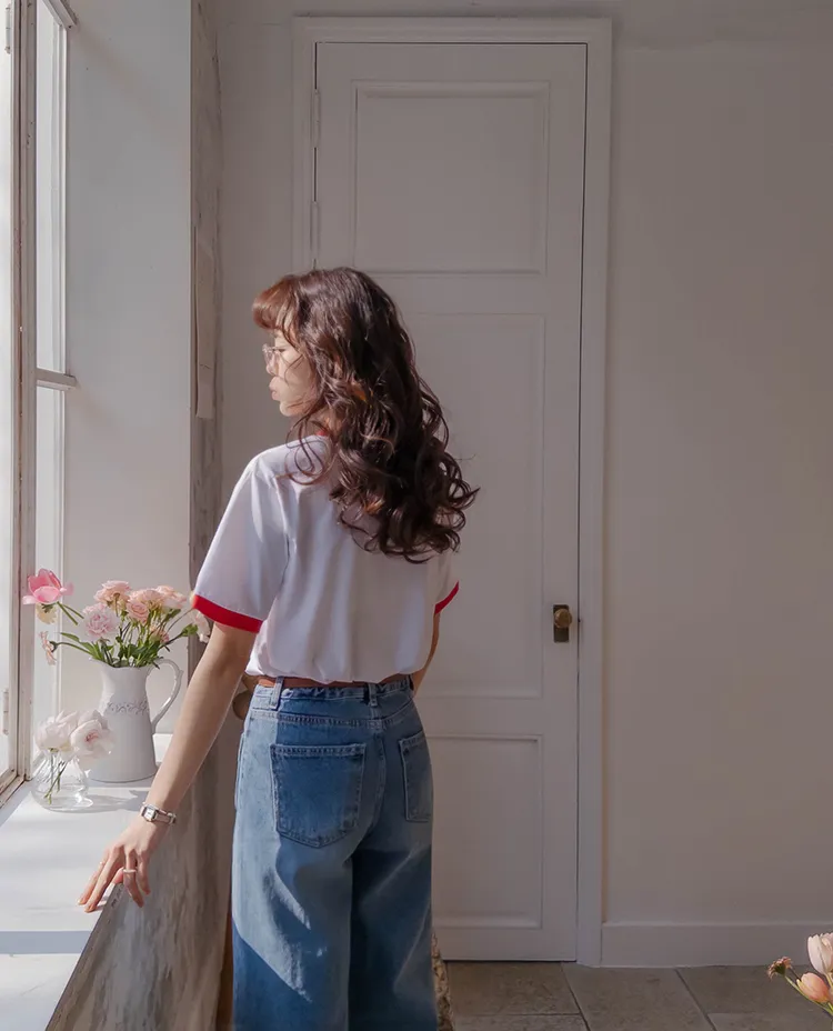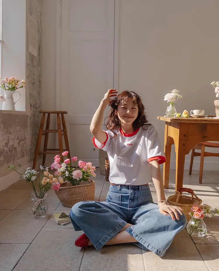清新Paris字母刺繡配色邊棉質短袖上衣
