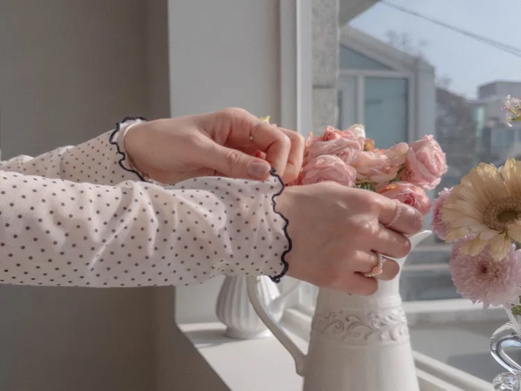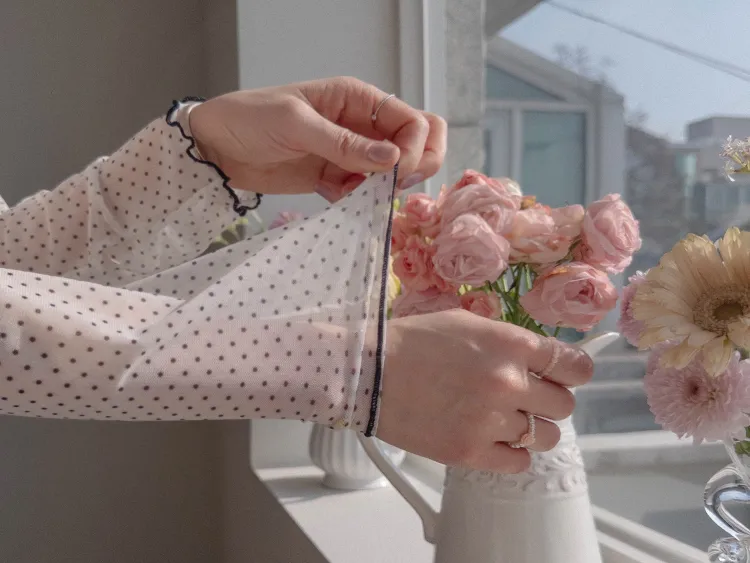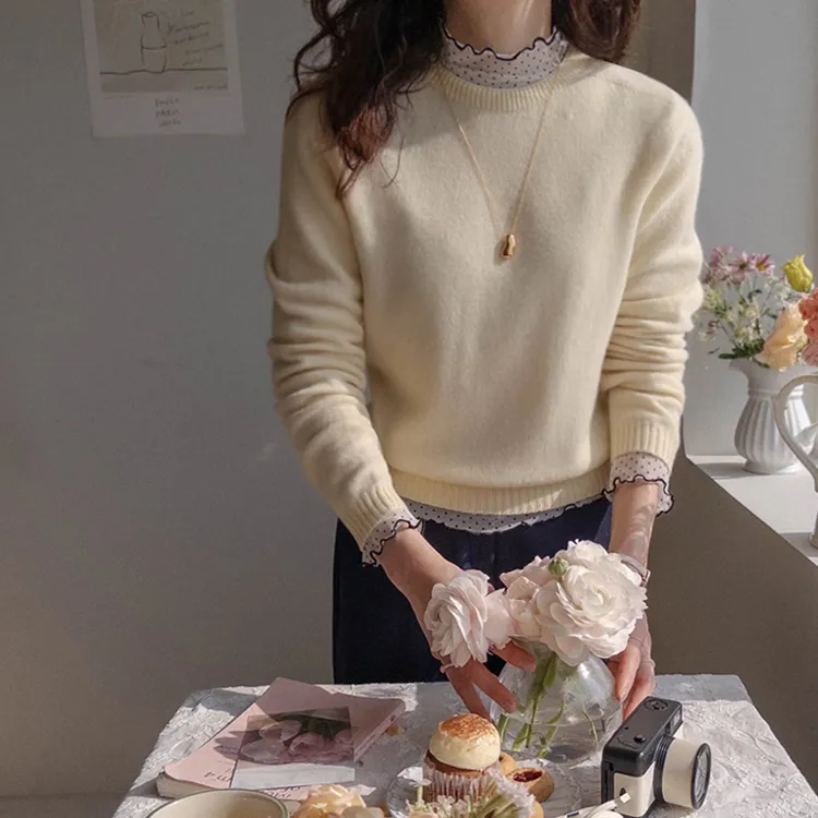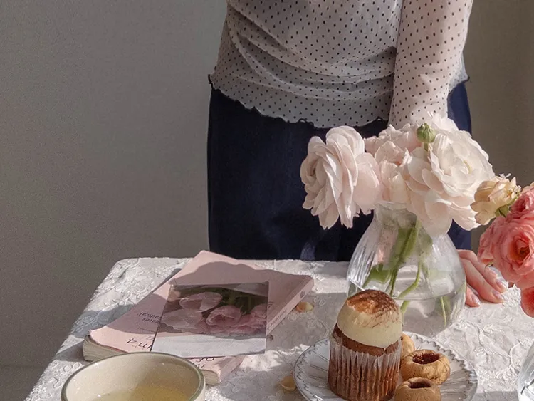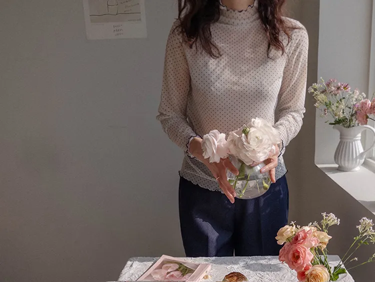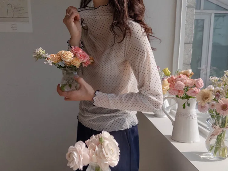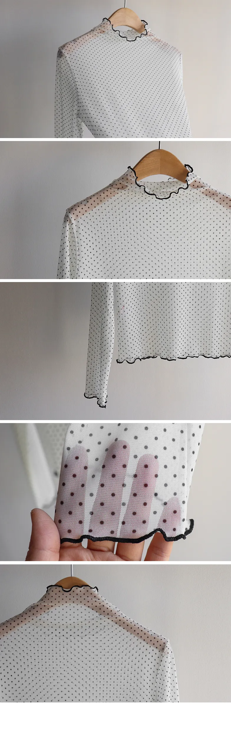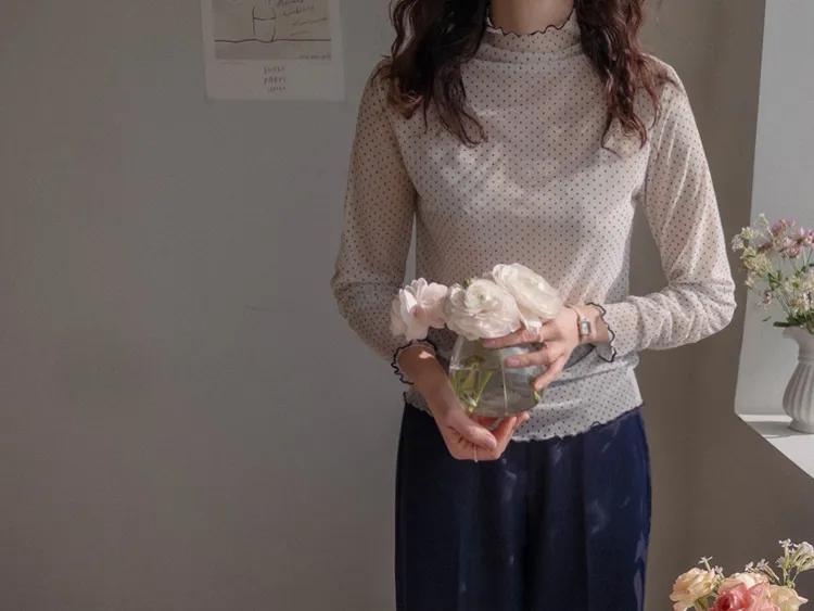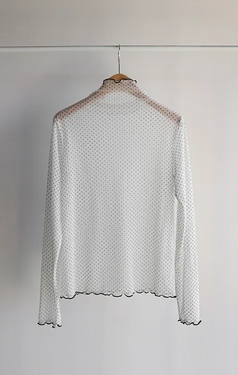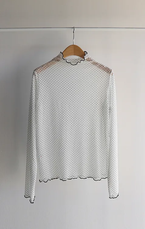 精緻氛圍透膚點點配色波浪邊半高領穿搭上衣