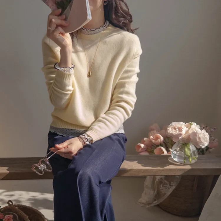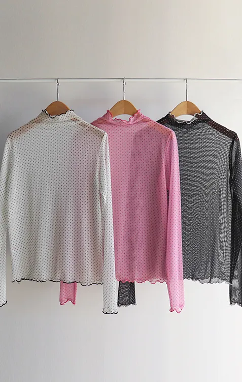 【透視材質和半高領領口,營造精緻氛圍~】【永恆圓點圖案的經典魅力♥】【撞色波浪線,獨特性UP↑】【高性價比的完美疊搭單品