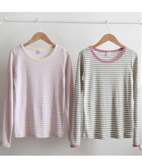 清新條紋配色領口袖末迷你鏤空柔軟彈性上衣