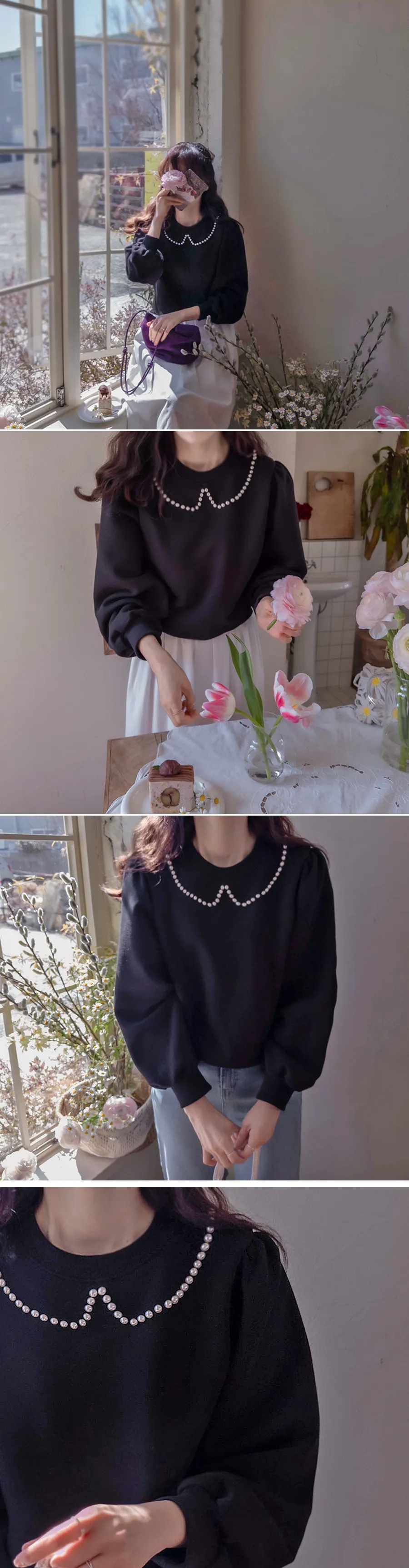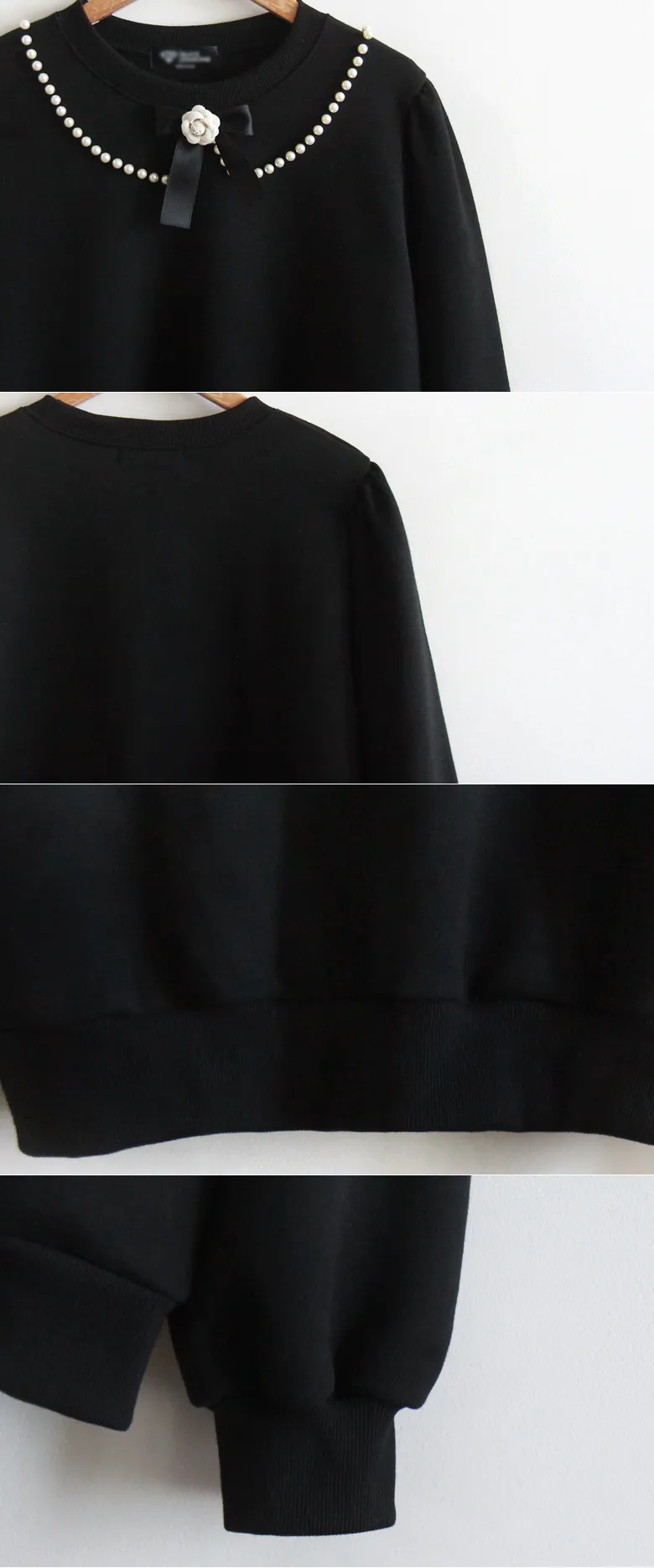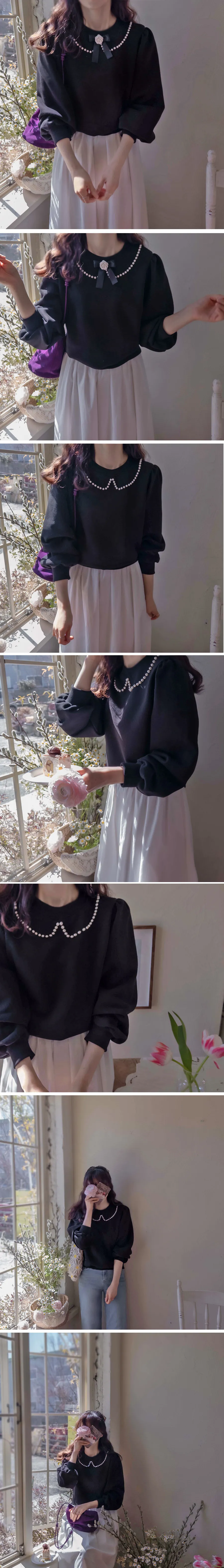 [胸針:可拆卸] [領口下面,珍珠點綴設計的獨特上衣♡] [立體的珍珠細節很漂亮] [毛巾布面料,柔軟輕盈] [蝴蝶結花朵胸針可拆卸,非常實用] [肩部共享也很漂亮] [充滿春天氣息的可愛上衣]