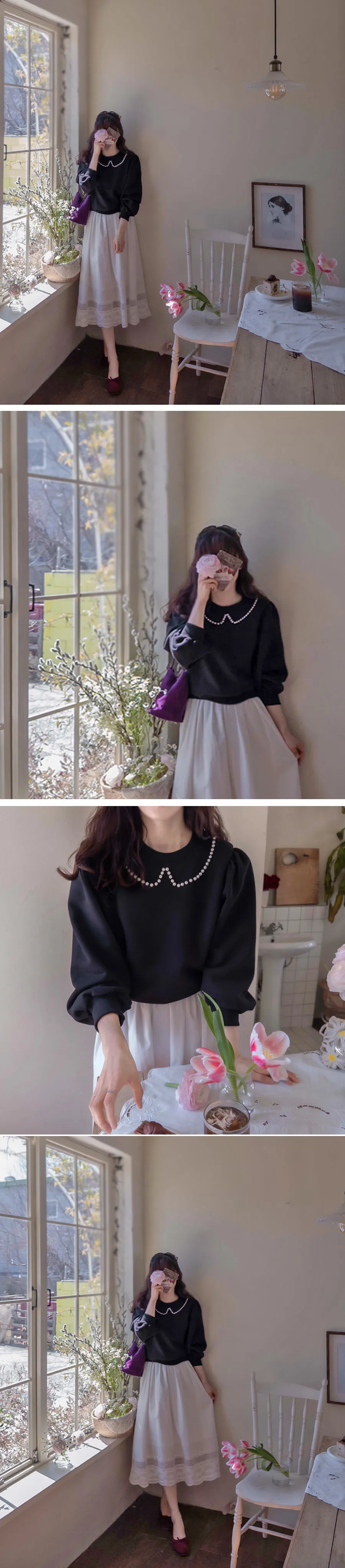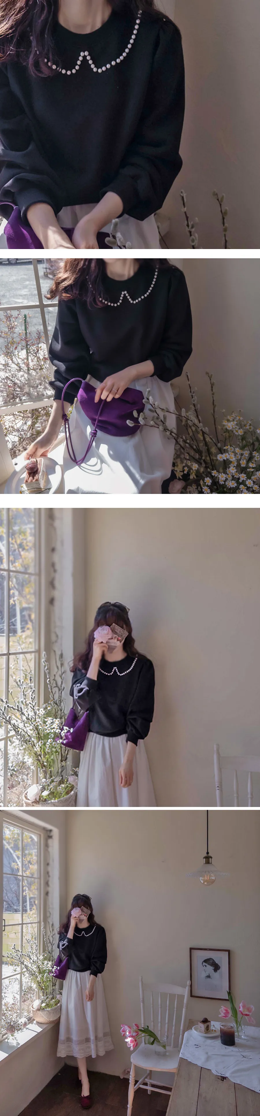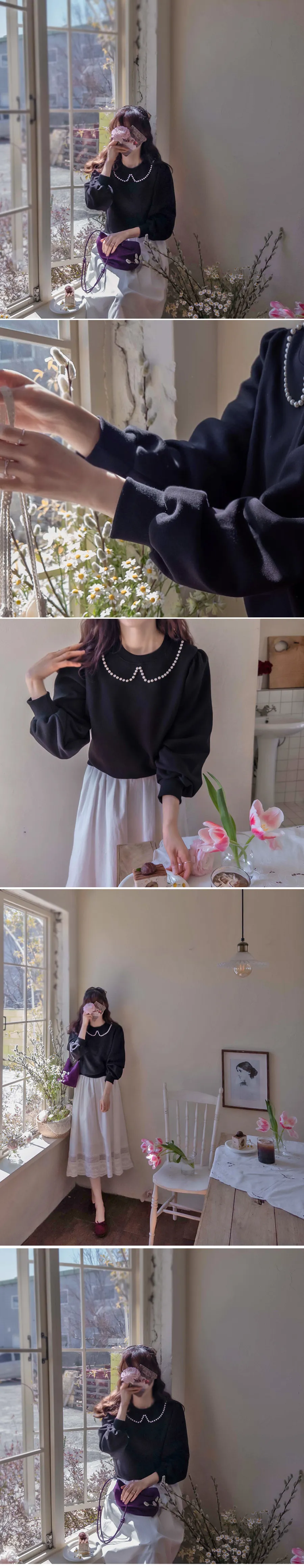 [胸針:可拆卸] [領口下面,珍珠點綴設計的獨特上衣♡] [立體的珍珠細節很漂亮] [毛巾布面料,柔軟輕盈] [蝴蝶結花朵胸針可拆卸,非常實用] [肩部共享也很漂亮] [充滿春天氣息的可愛上衣]