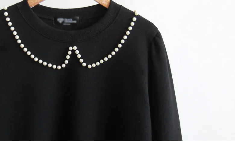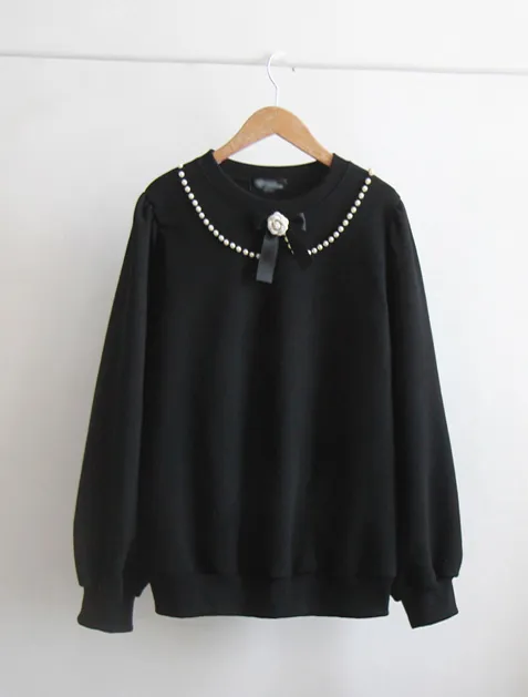 優雅珍珠飾領附緞帶花朵胸針上衣