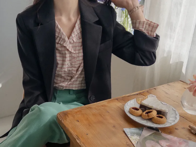 浪漫氛圍V領荷葉摺邊格紋排扣上衣