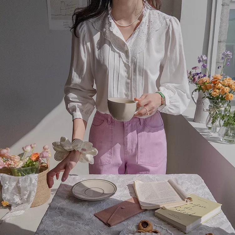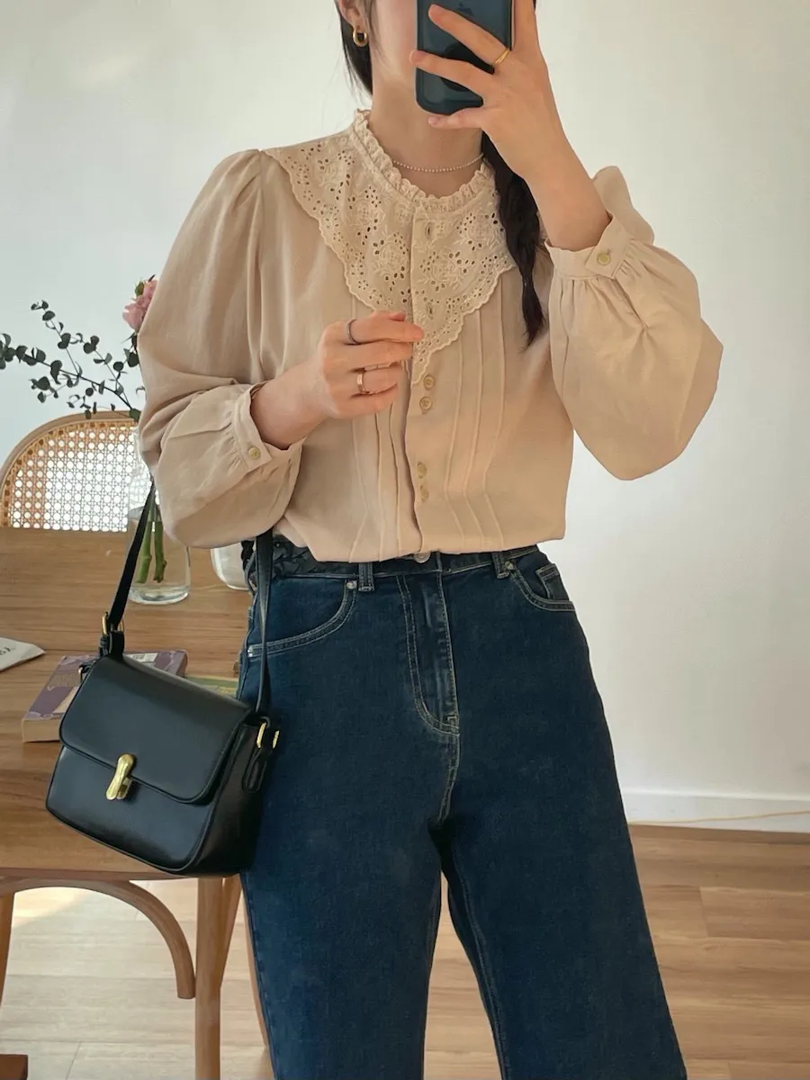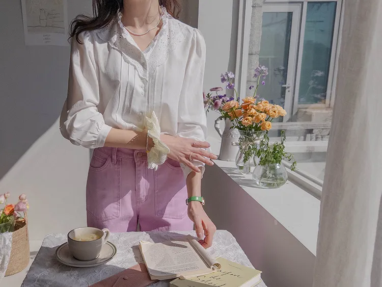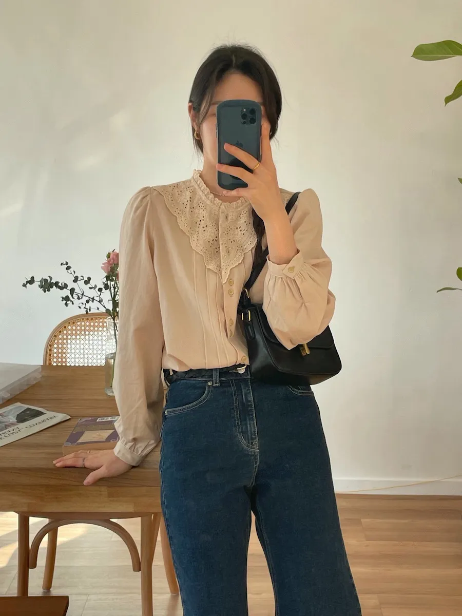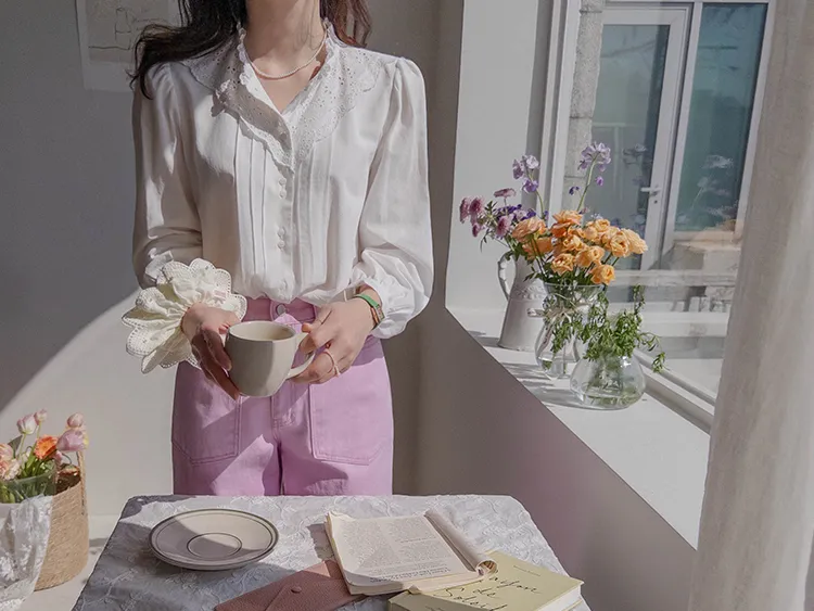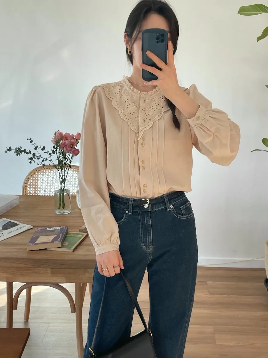 [充滿浪漫情懷的蕾絲上衣✿] [雙扣的排列,散發出獨特的魅力~] [與外套完美搭配的荷葉摺邊領口! ] [清新柔軟的棉質面料,穿著舒適]