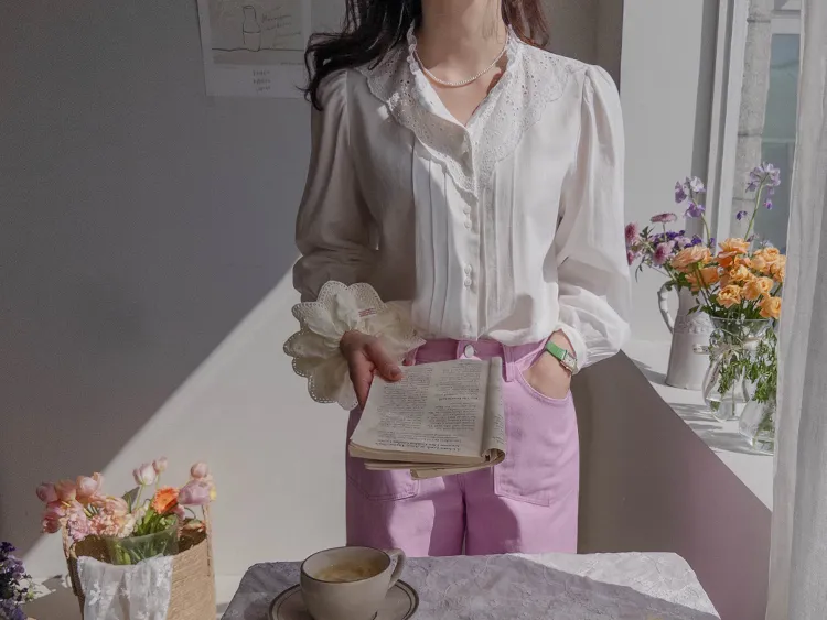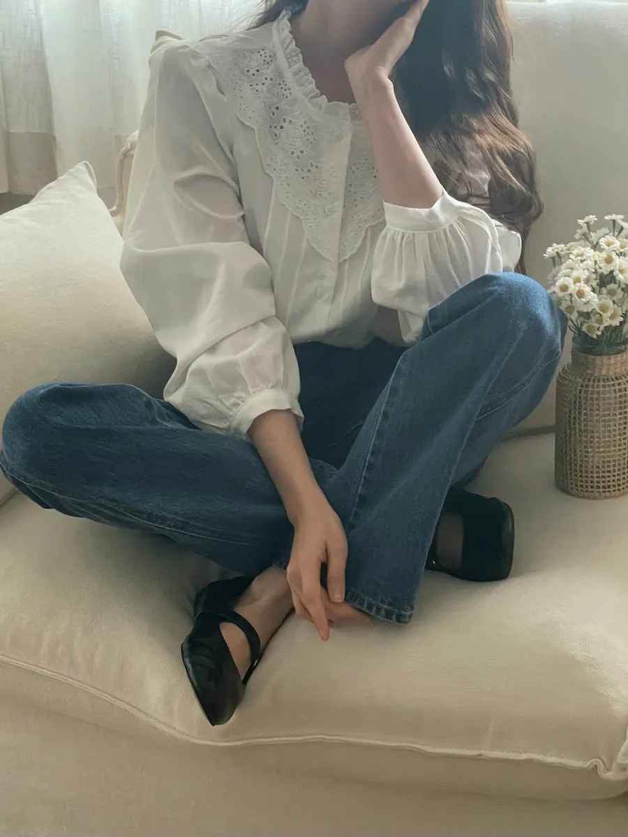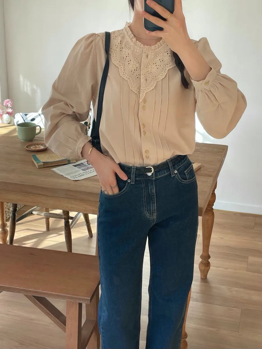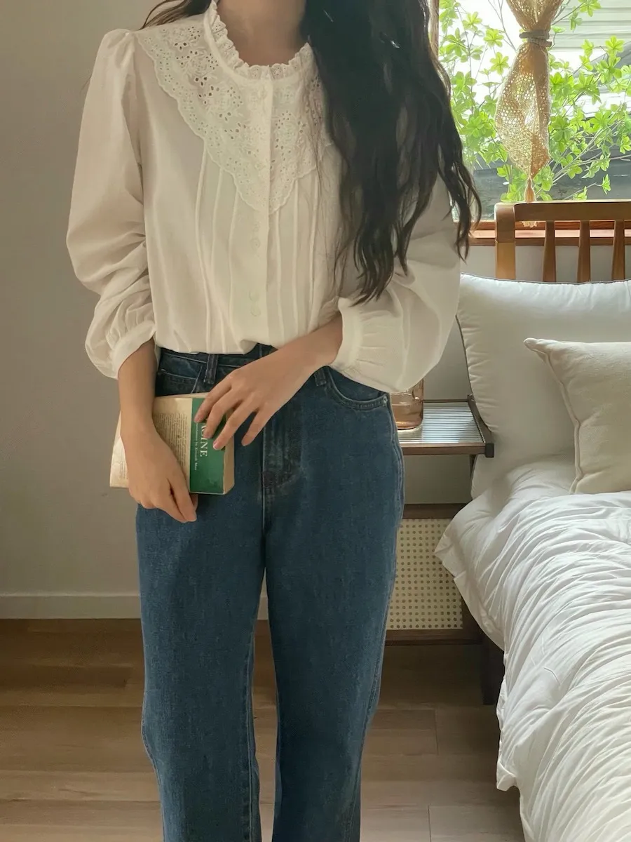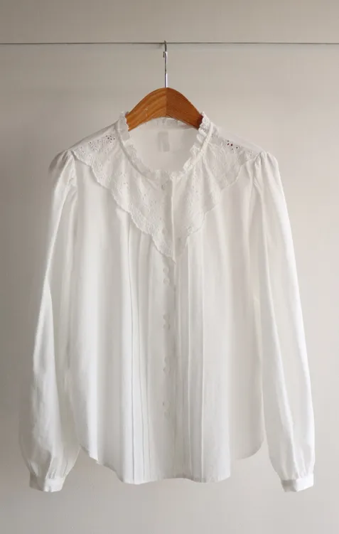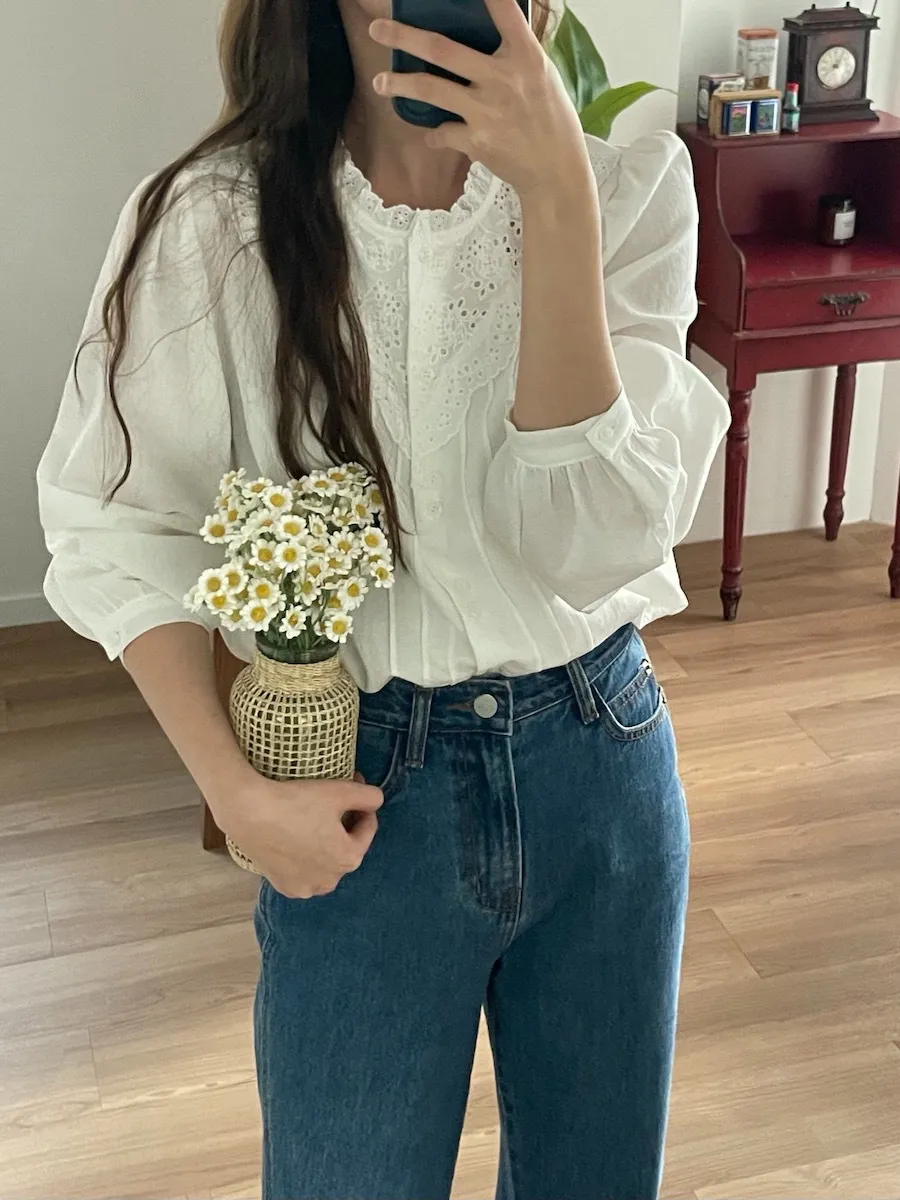 [充滿浪漫情懷的蕾絲上衣✿] [雙扣的排列,散發出獨特的魅力~] [與外套完美搭配的荷葉摺邊領口! ] [清新柔軟的棉質面料,穿著舒適]