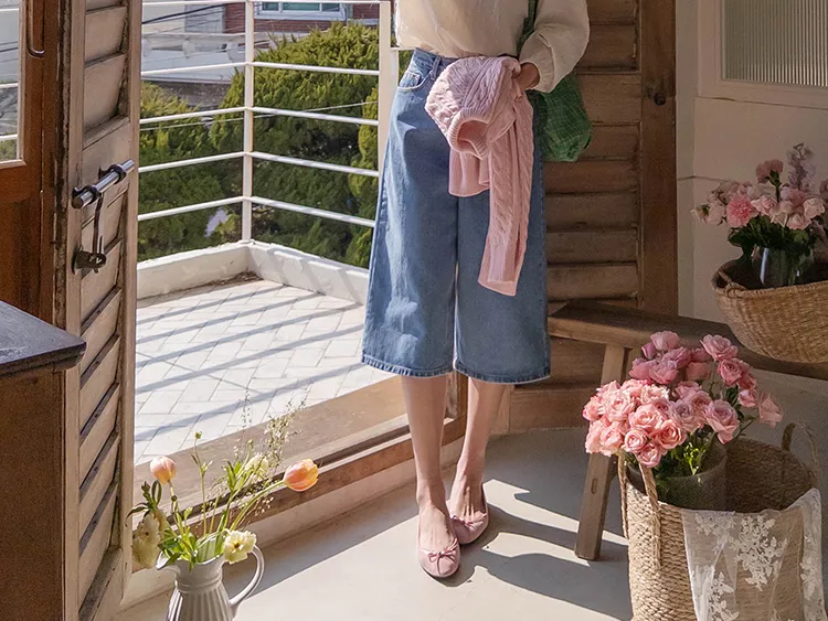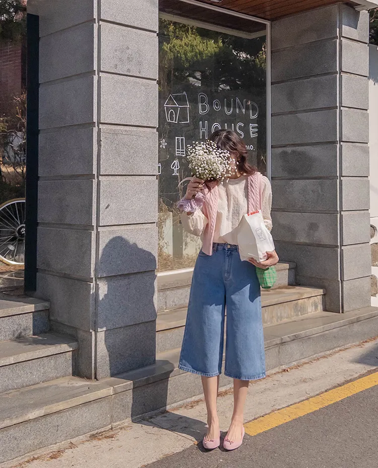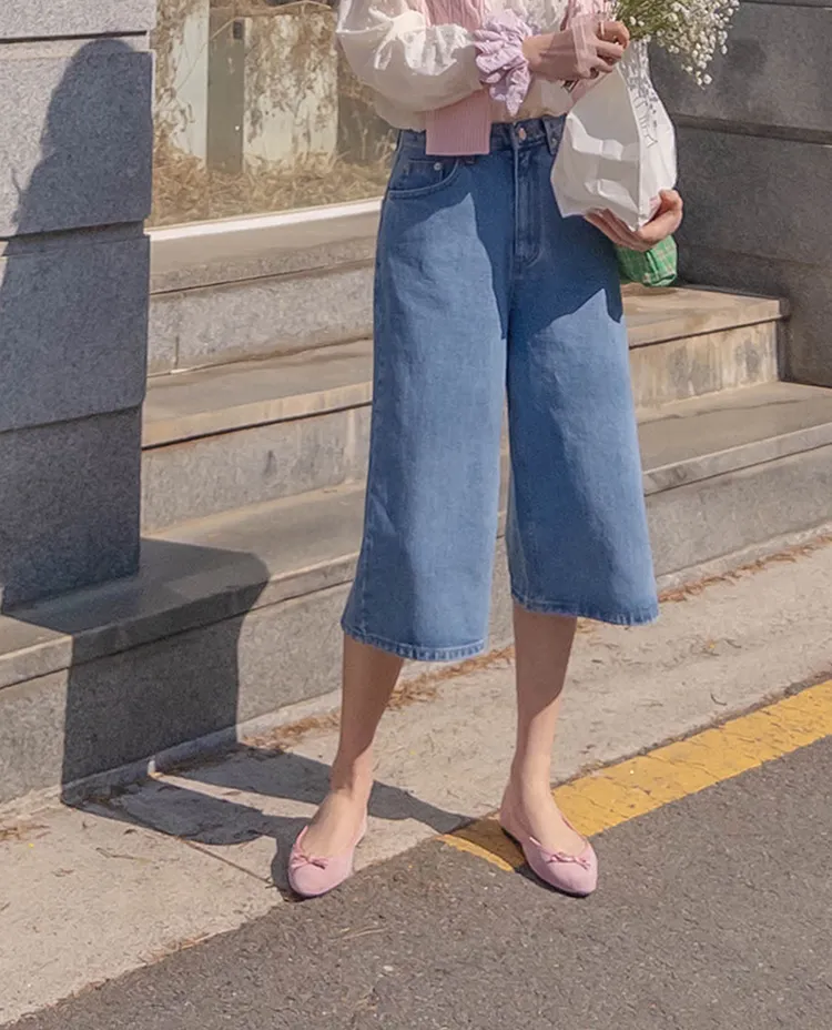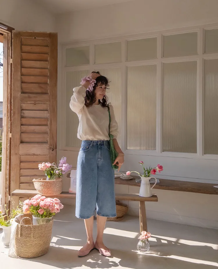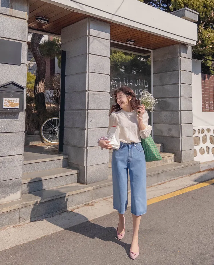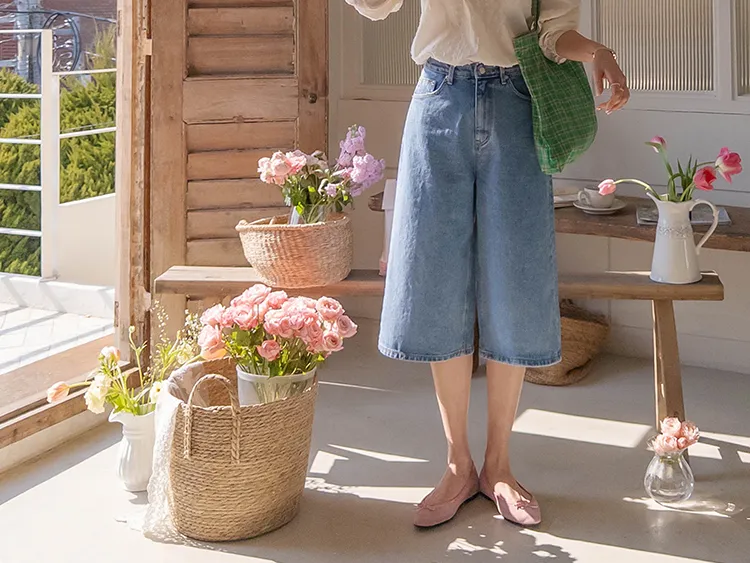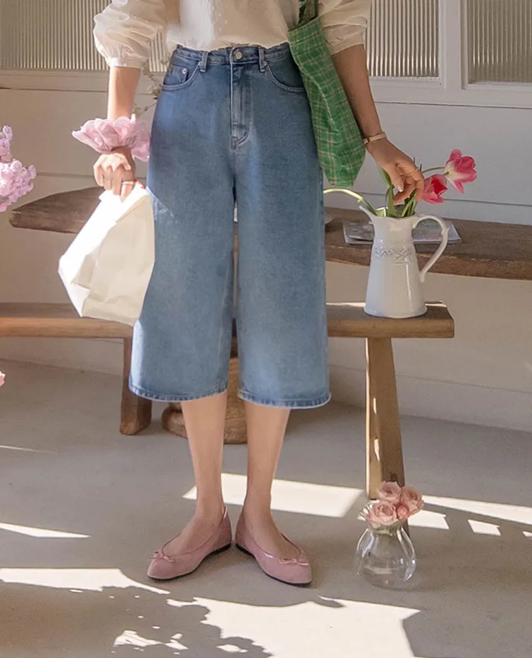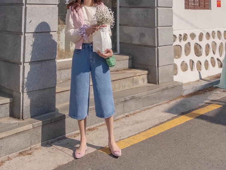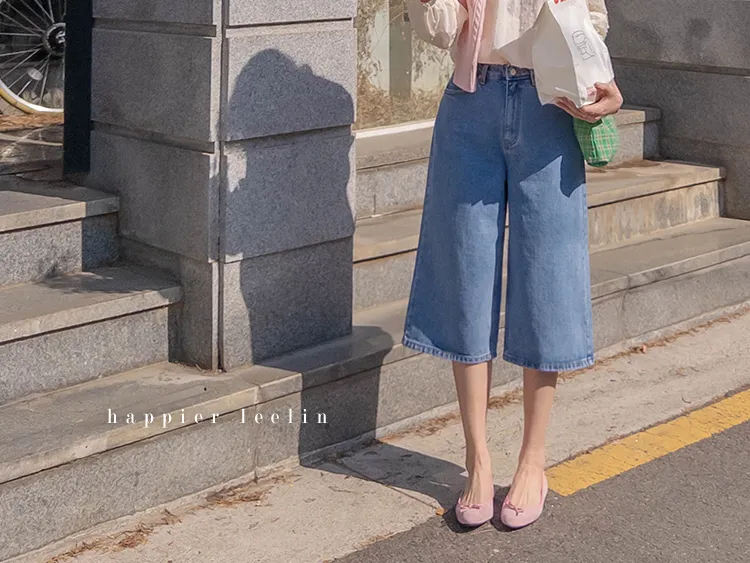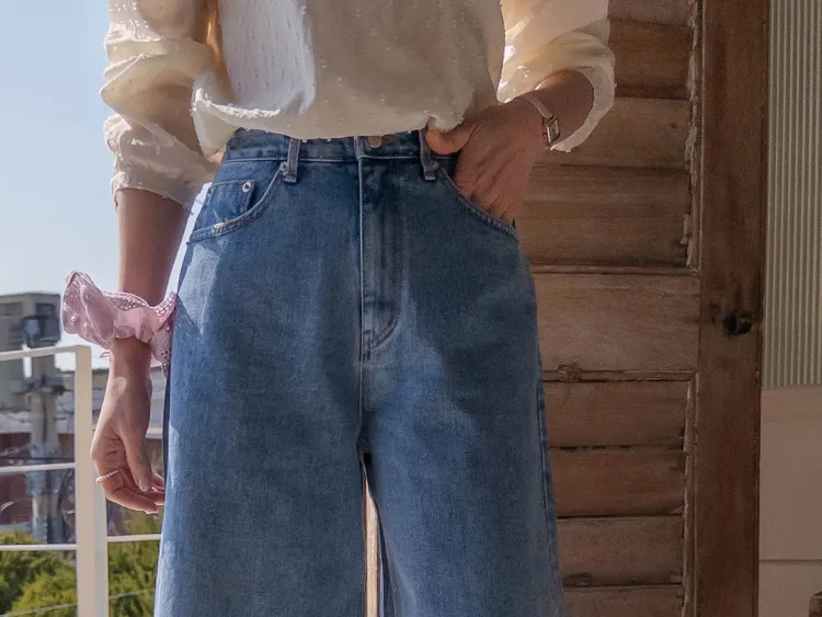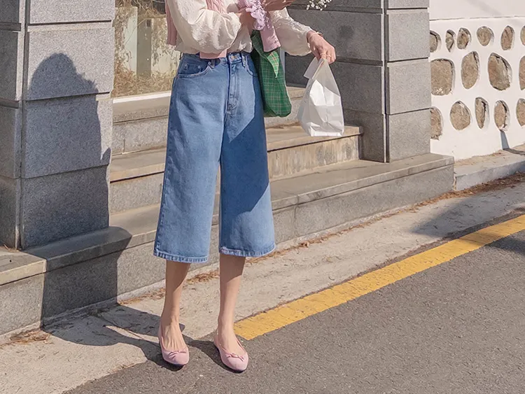 休閒風格穿搭寬版A字剪裁七分牛仔褲
