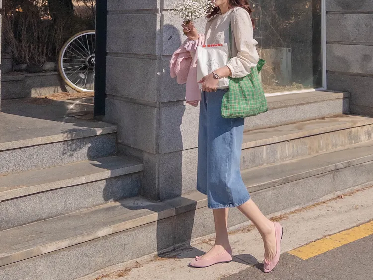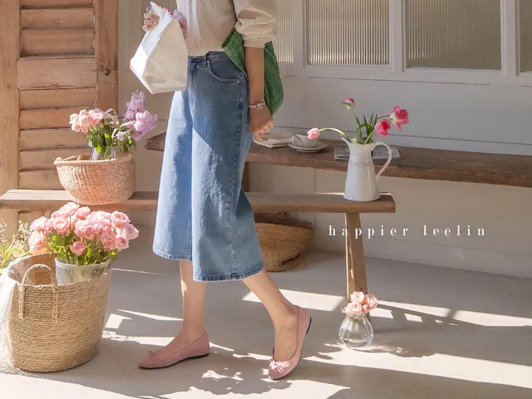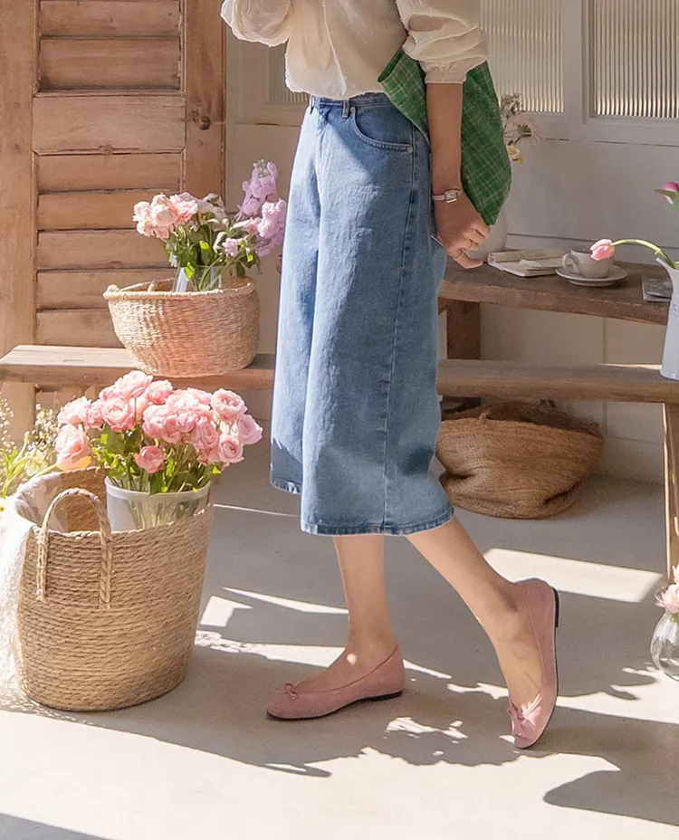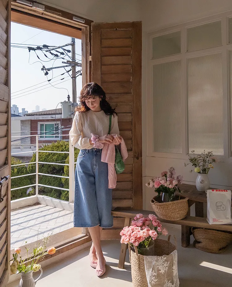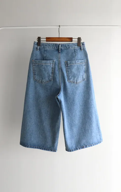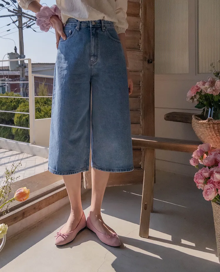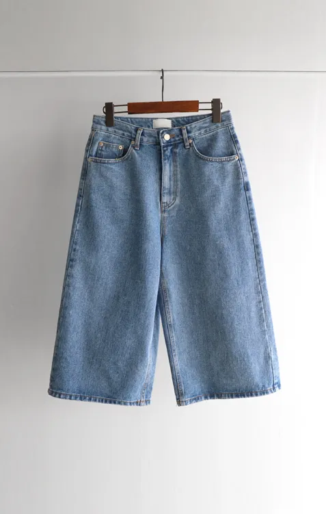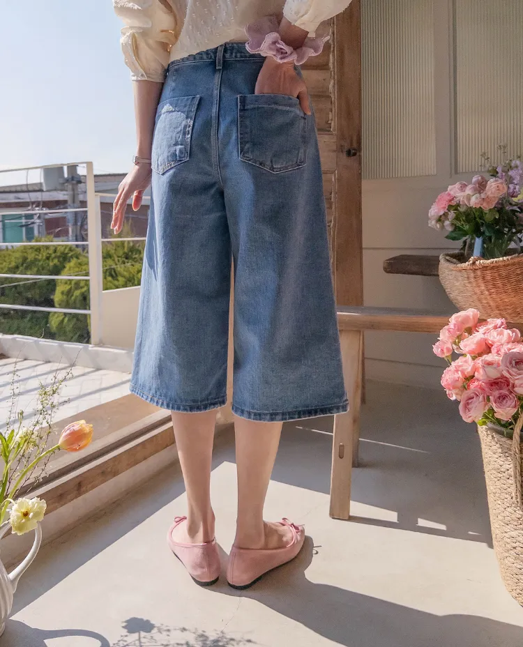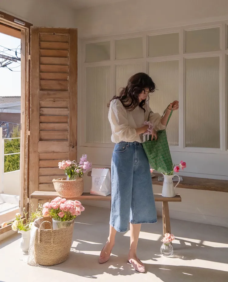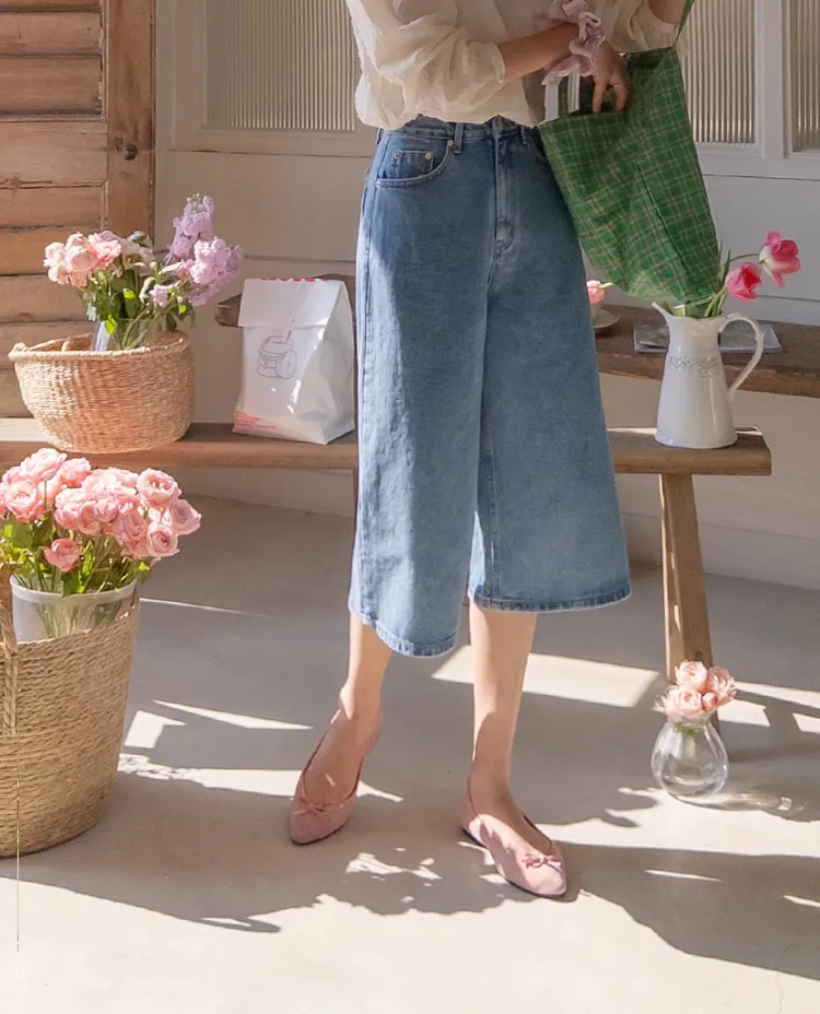 休閒風格穿搭寬版A字剪裁七分牛仔褲