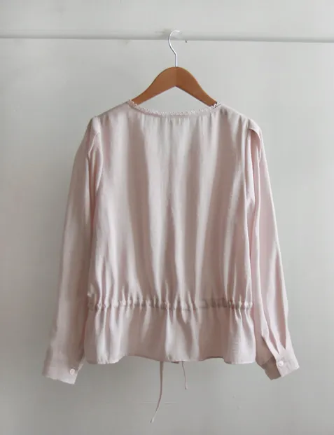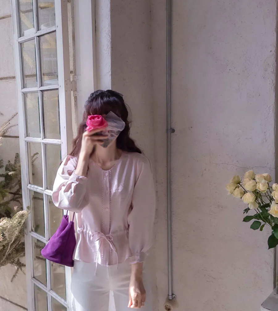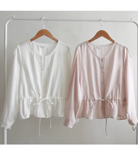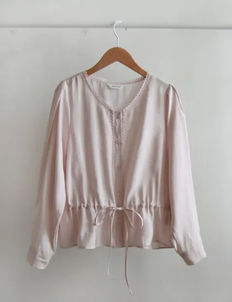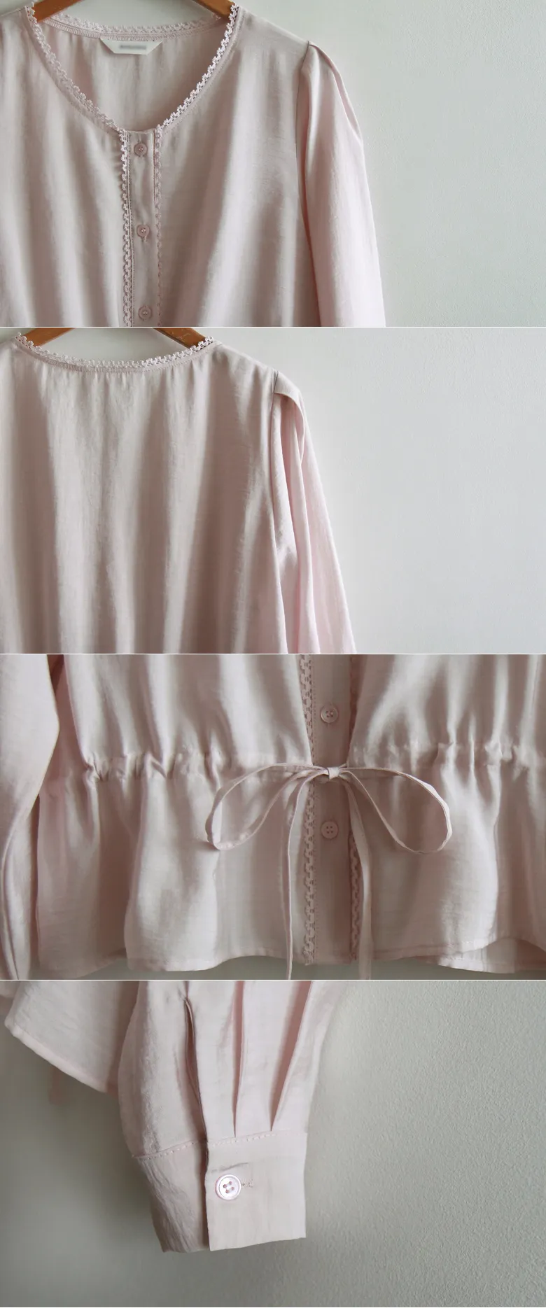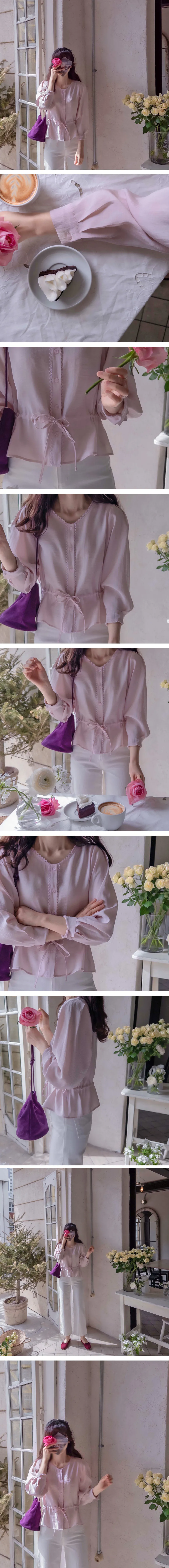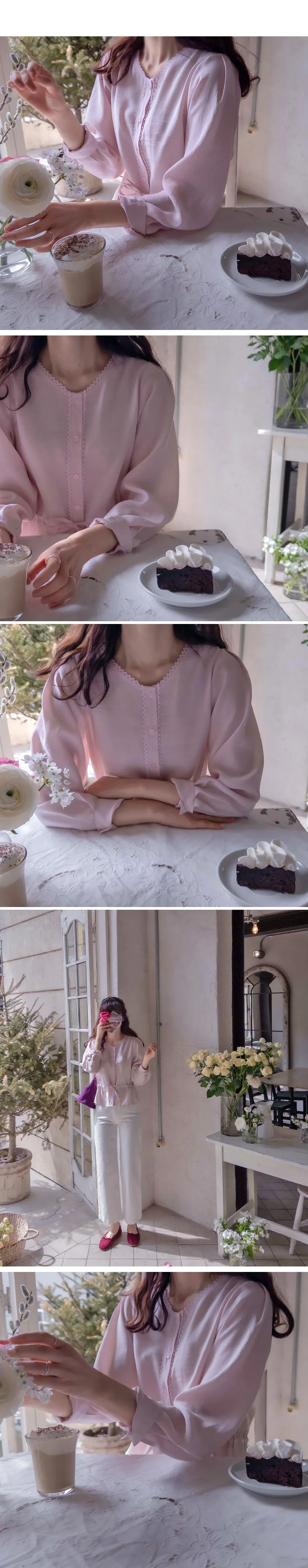 【用腰帶調整腰圍線條】【迷你蕾絲領很漂亮】【柔和色彩排扣上衣營造明亮氛圍】【繫上腰帶,創造出可愛修身且帶有微妙摺皺的合身感】【浪漫氣息的上衣】