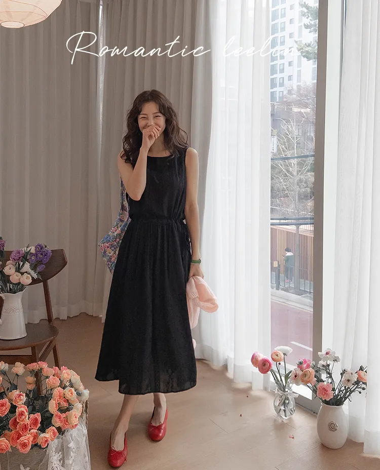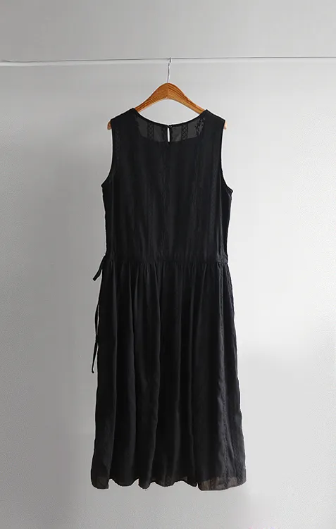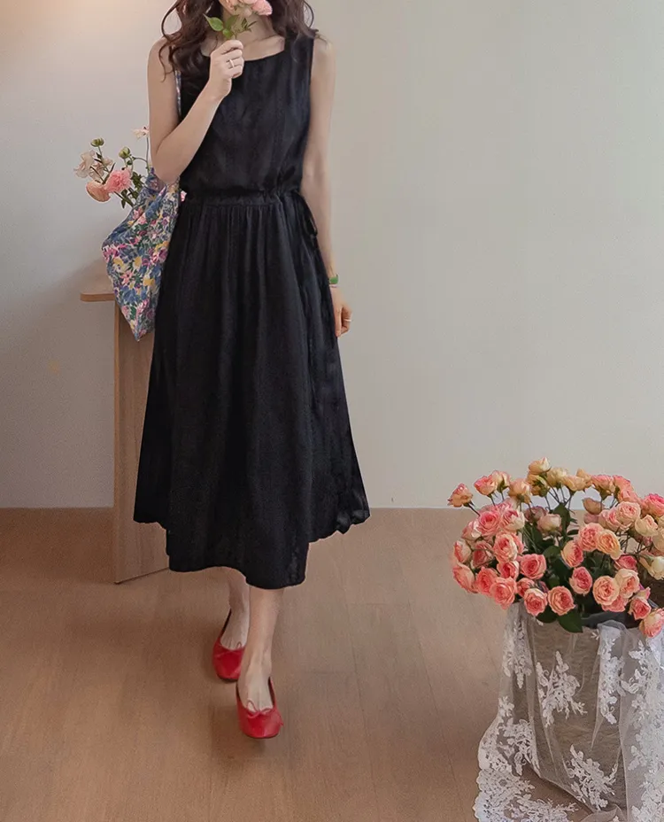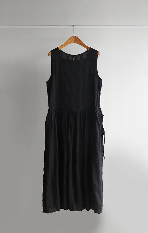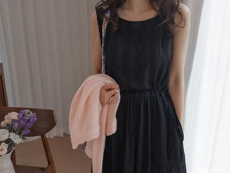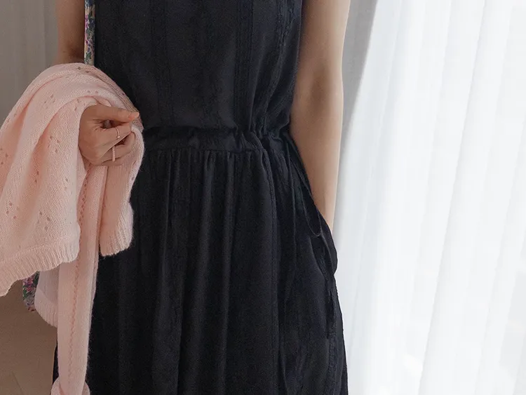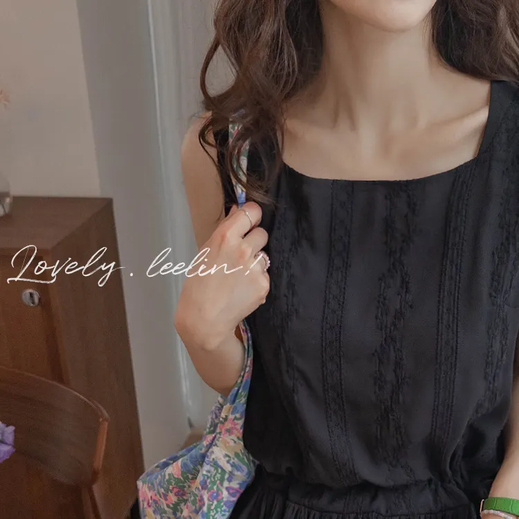 浪漫蕾絲花朵刺繡腰側綁帶感性方領連身裙 黑色