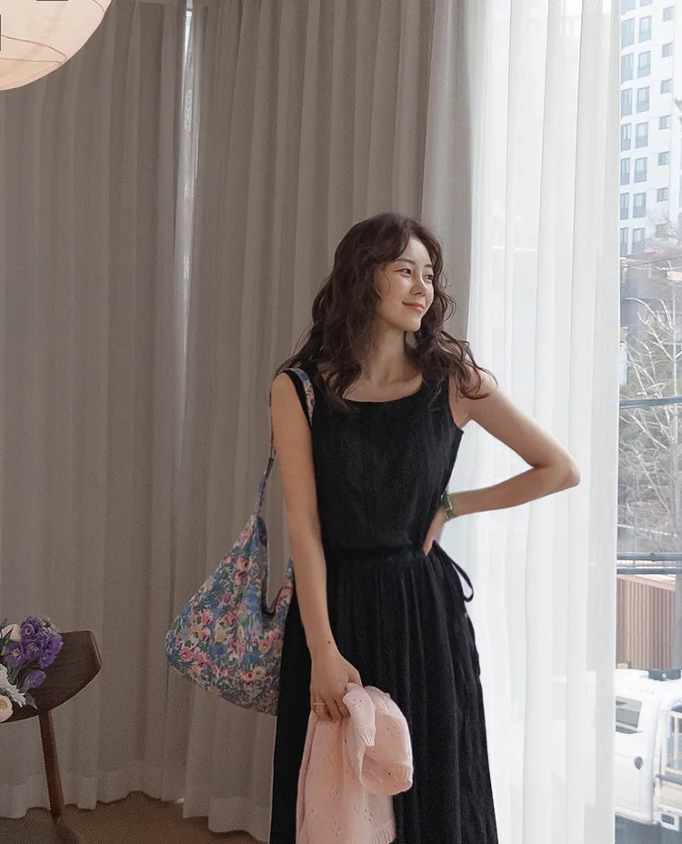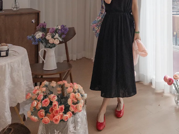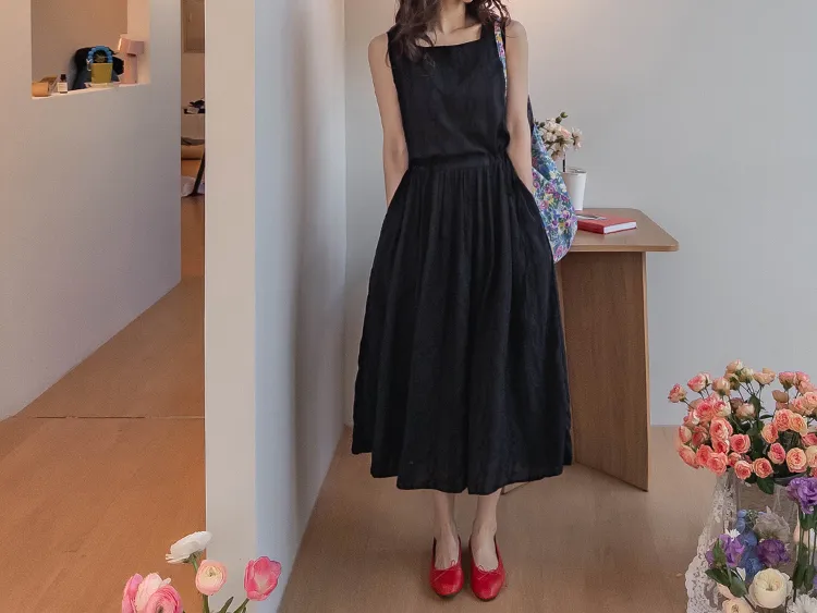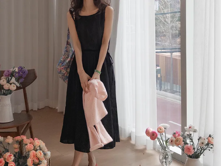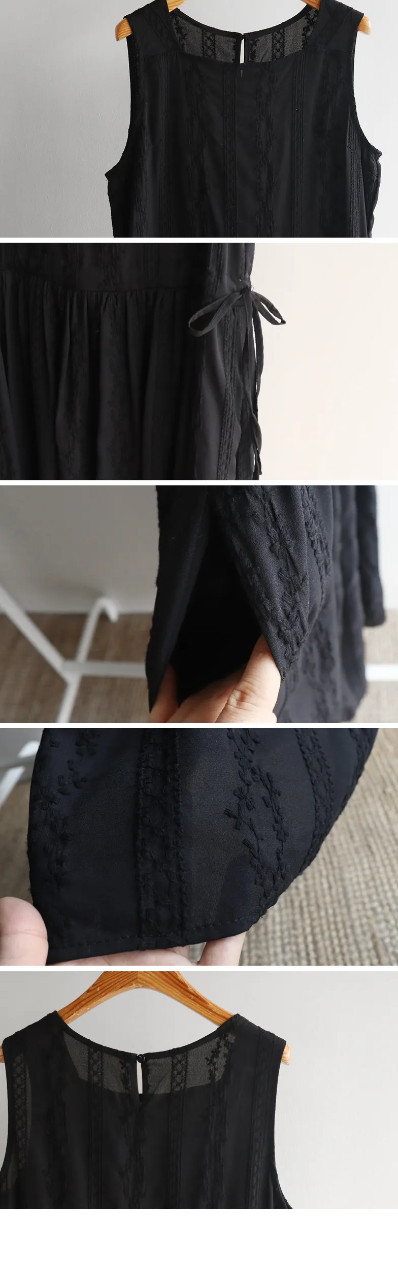 浪漫蕾絲花朵刺繡腰側綁帶感性方領連身裙 黑色