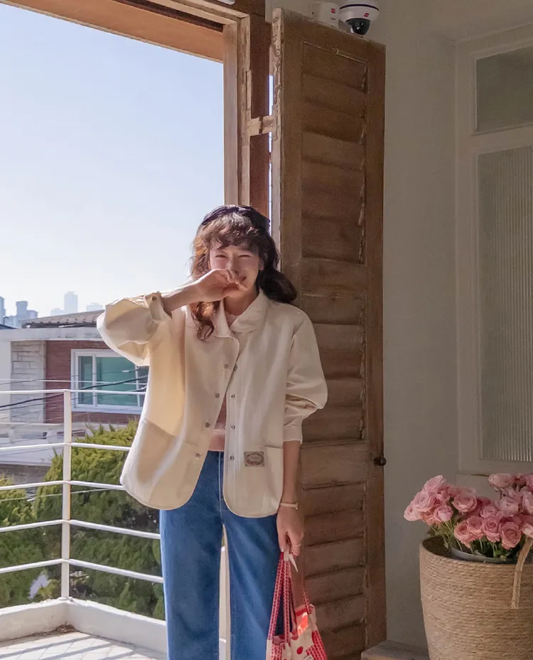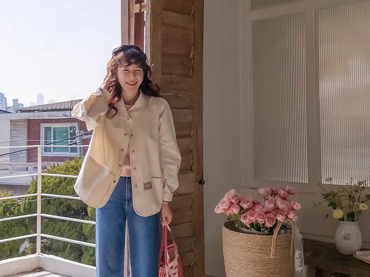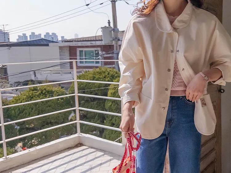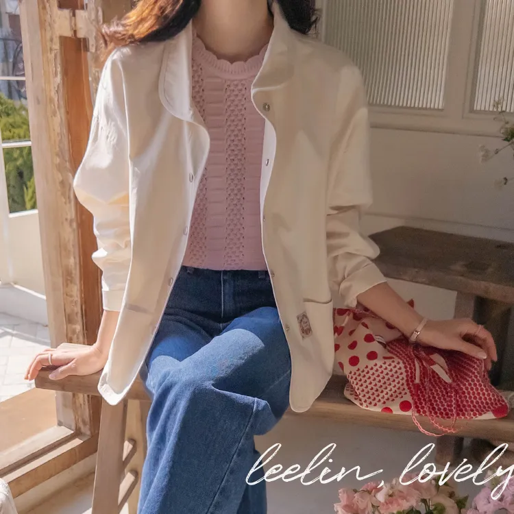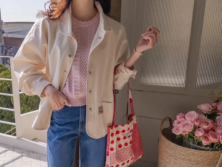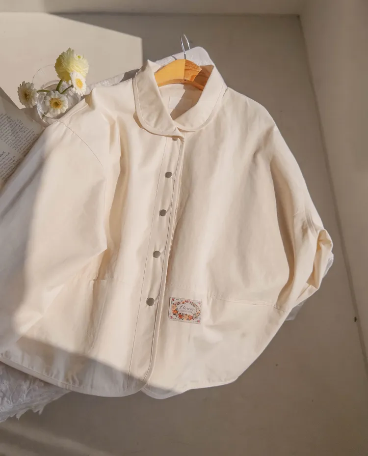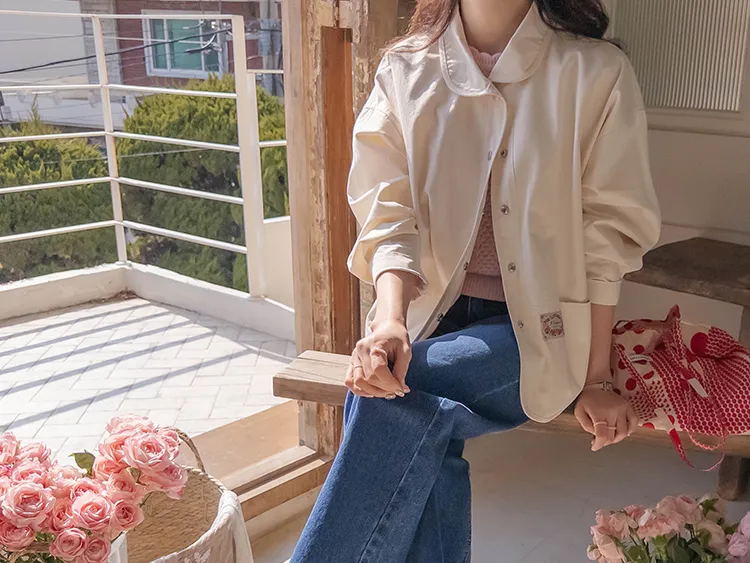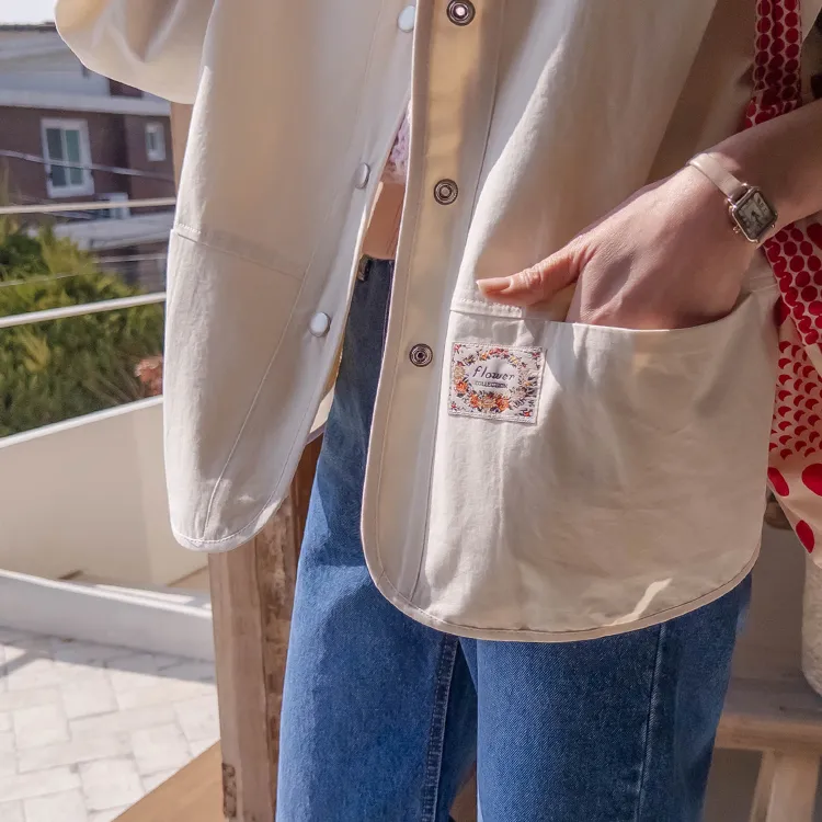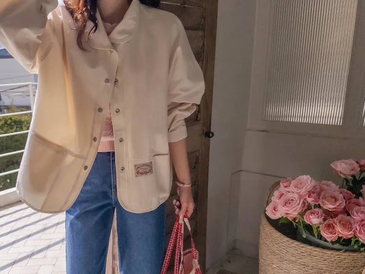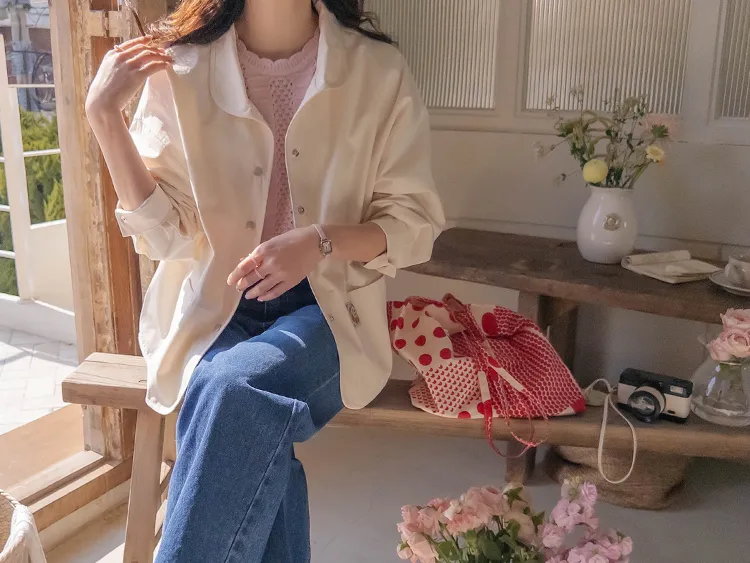 柔和圓潤剪裁點綴花朵標籤穿搭外套