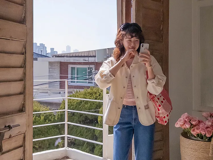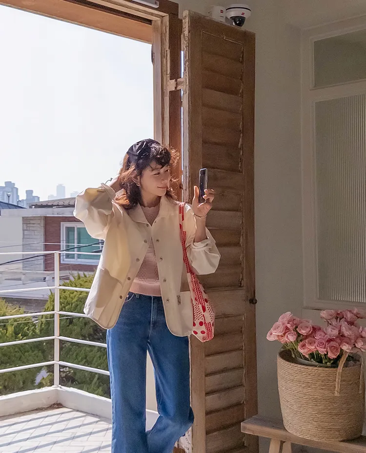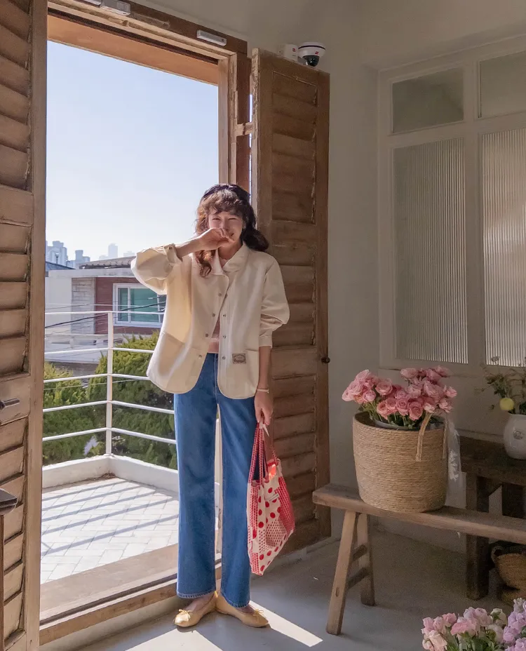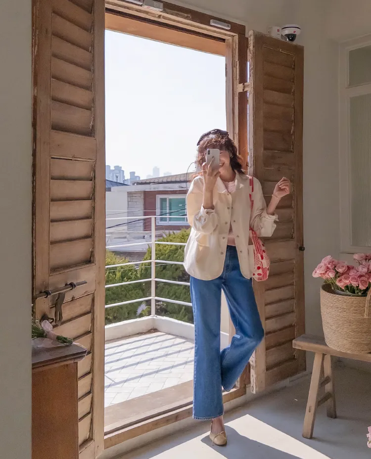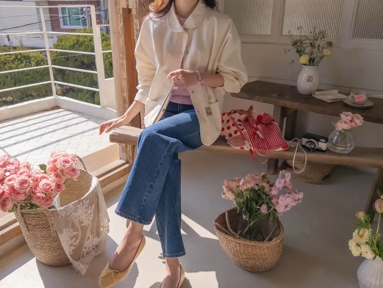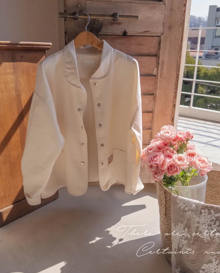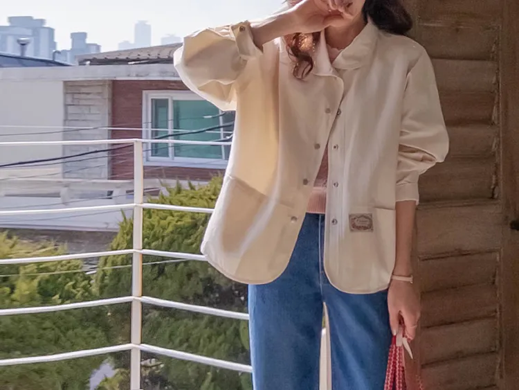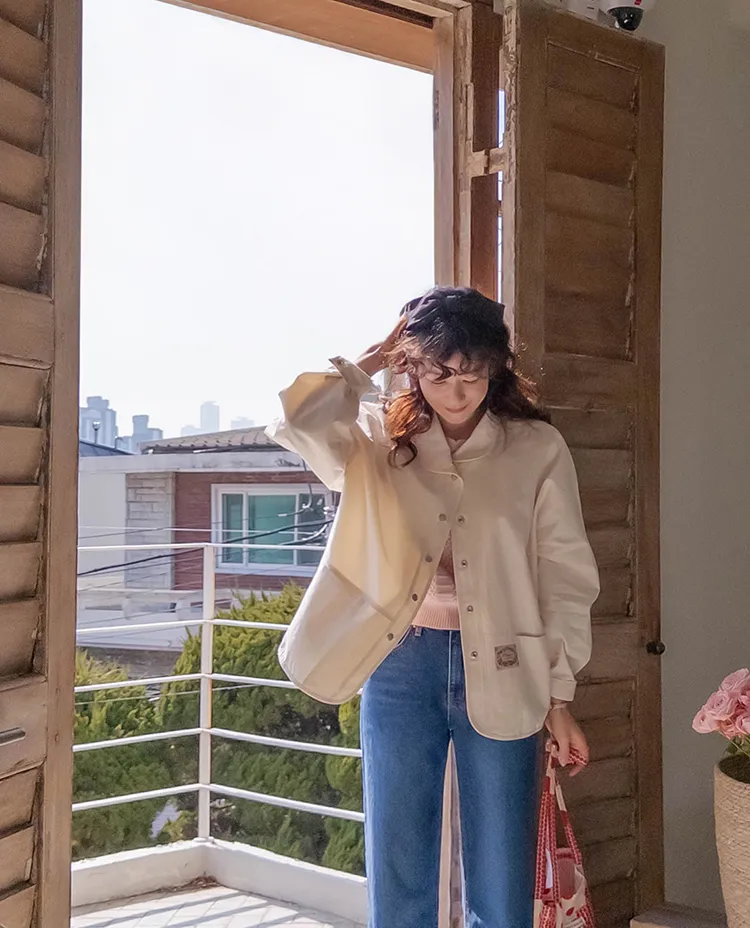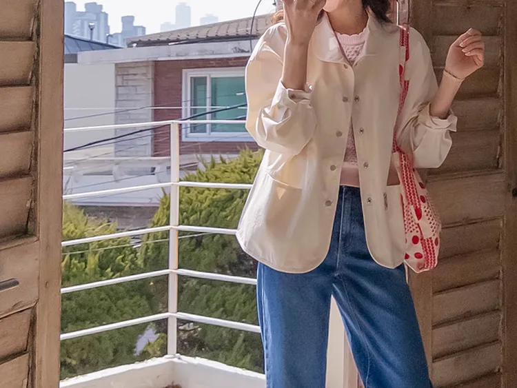 柔和圓潤剪裁點綴花朵標籤穿搭外套