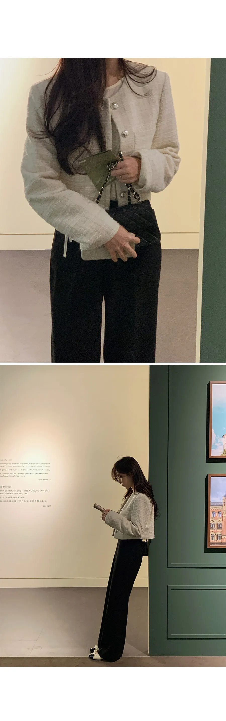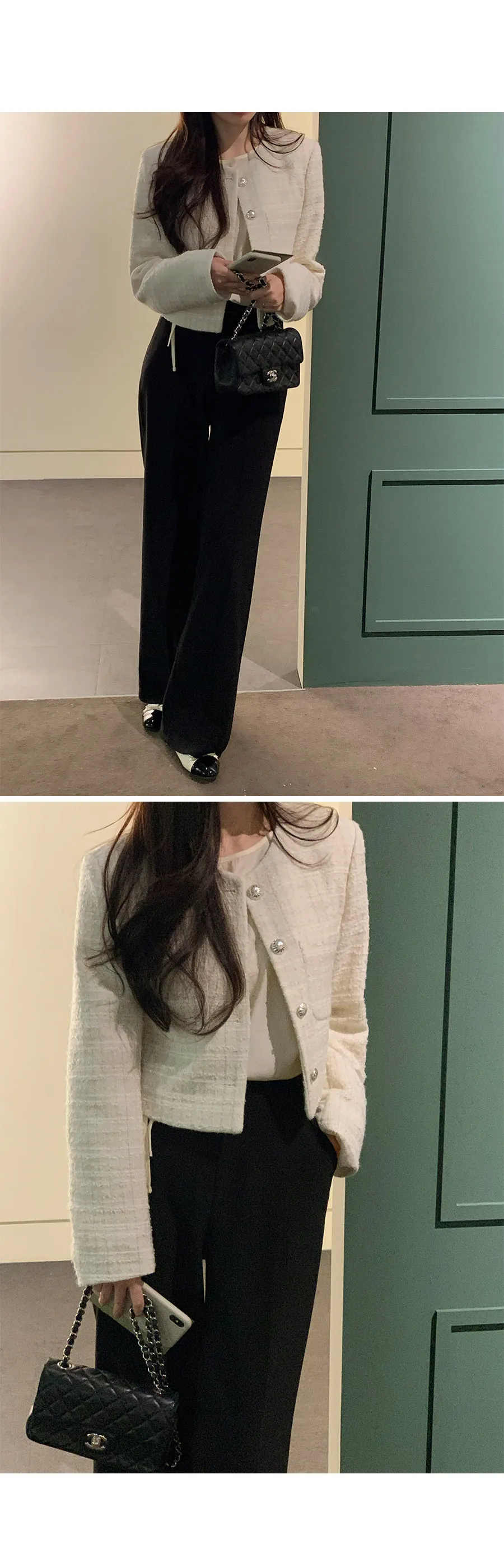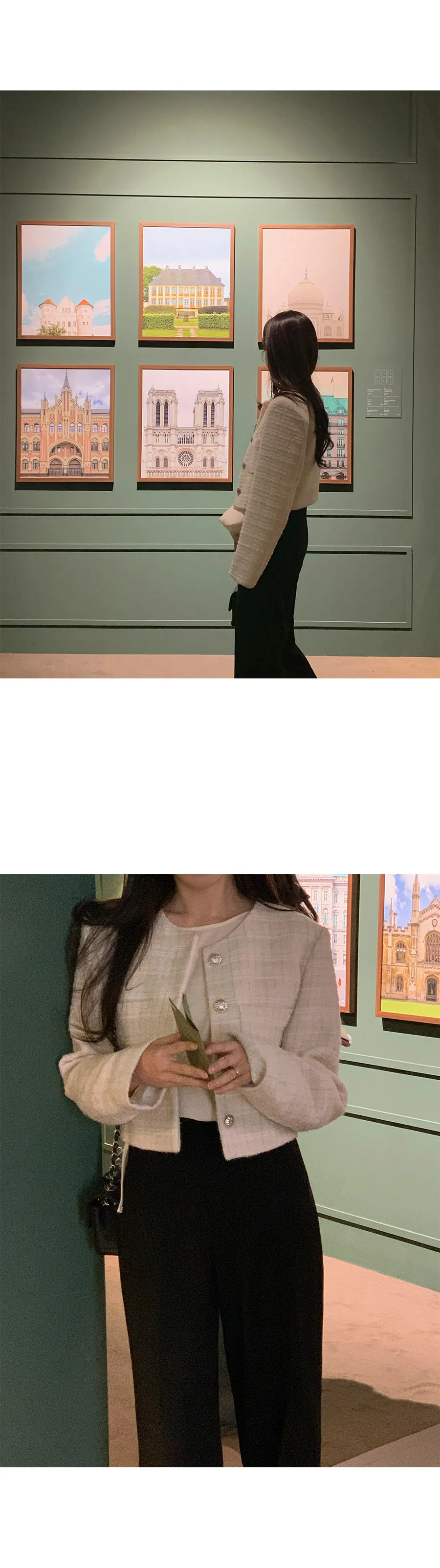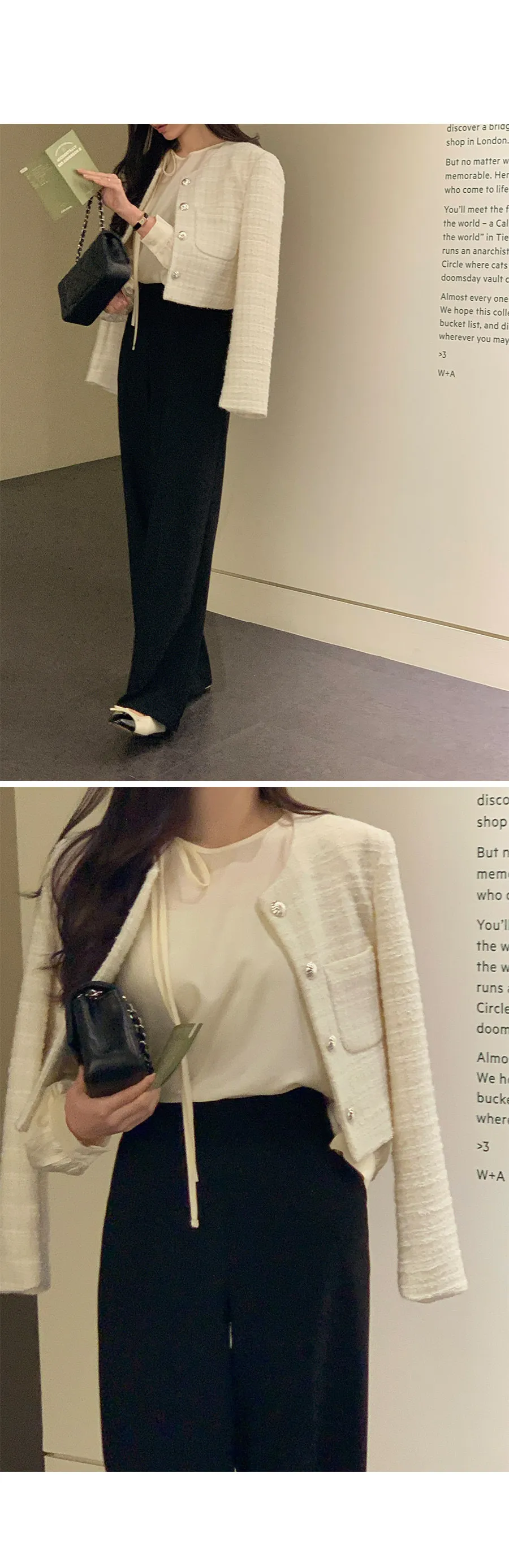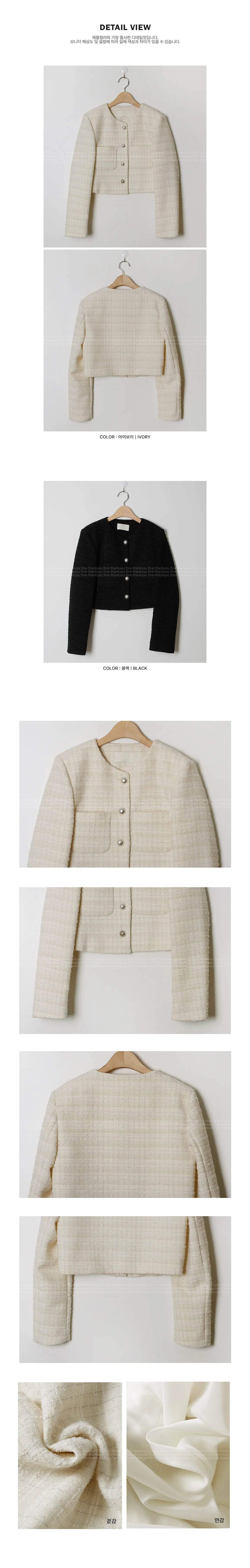 可開合的立體銀色鈕扣是亮點,及至臀部的半短款長度使雙腿顯得更長。 簡潔的無領圓領設計,可單獨穿著,打造賓客裝扮、辦公室裝扮或正式裝扮。