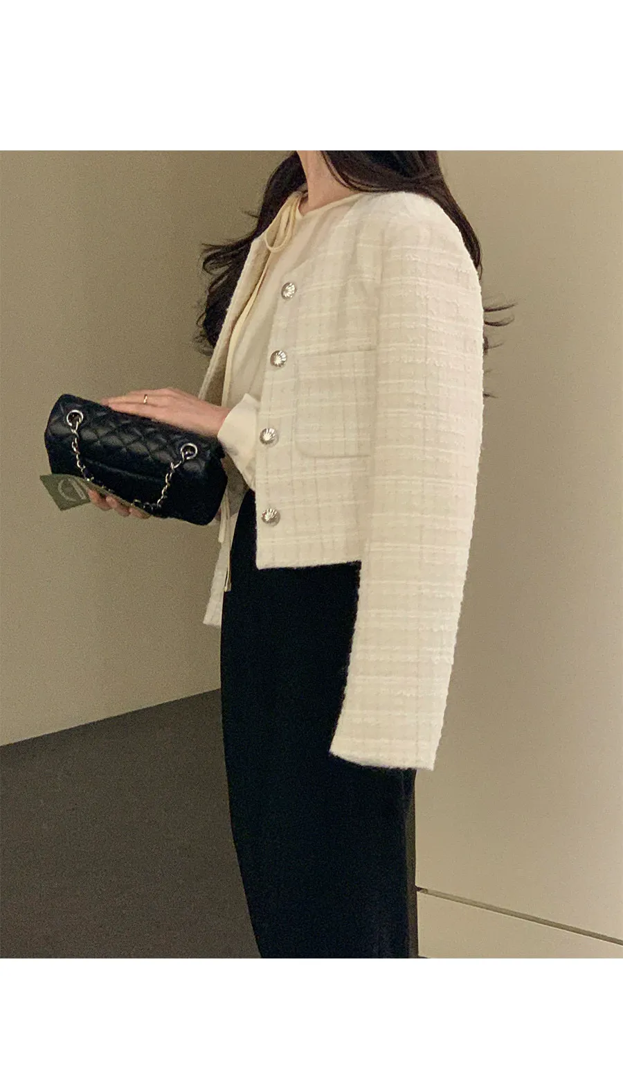 美麗氣息立體銀色鈕扣細微格紋花呢外套