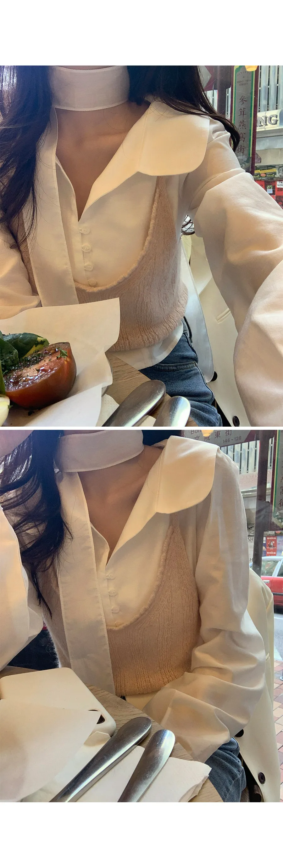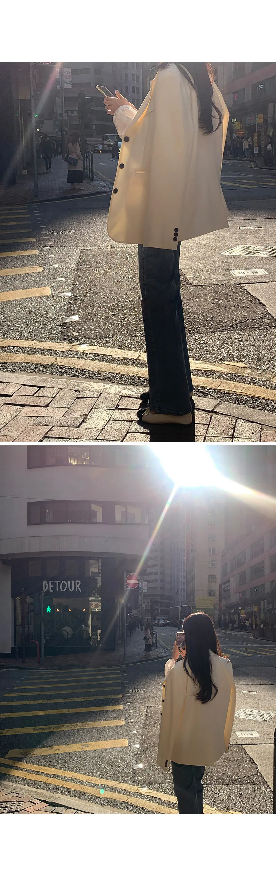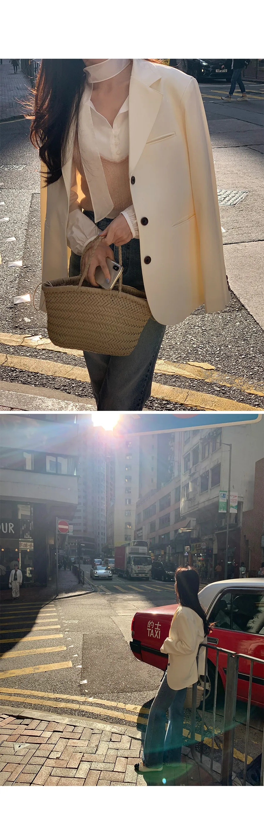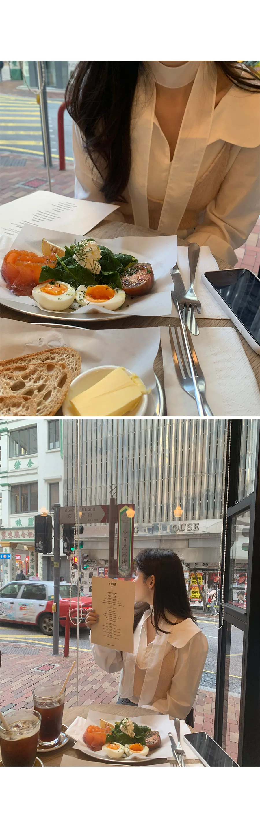 具有時尚氣息的排扣上衣 。可透過搭配繞在脖子上的領帶打造多種造型 。