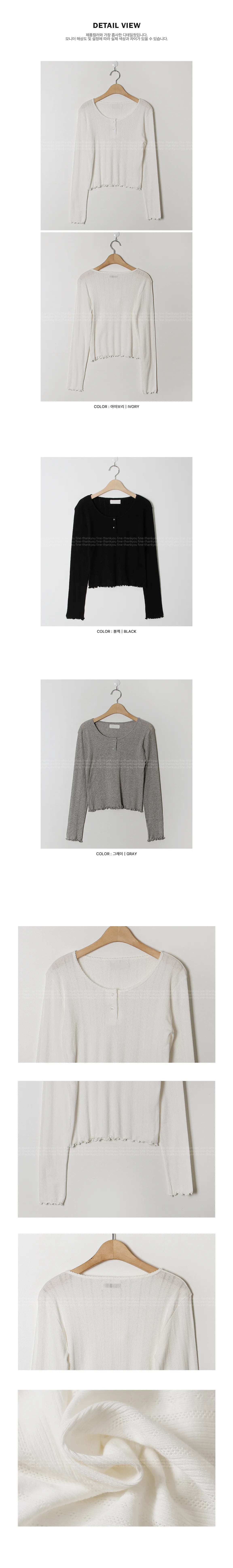 一件可愛的心情上衣。 一款修身版型的日常上衣,非常適合作為內搭或單品穿著! 可愛之處透過添加鏤空和垂直線條的圖案來完成,袖子和下擺的波浪形剪裁營造出女性化的氛圍。 圓領和波浪剪裁營造可愛氛圍, 開合心形鈕扣增添了可愛的氛圍。 它非常適合與開襟衫或外套搭配 ,而且也適合與無袖連身裙或緊身胸衣背心搭配。