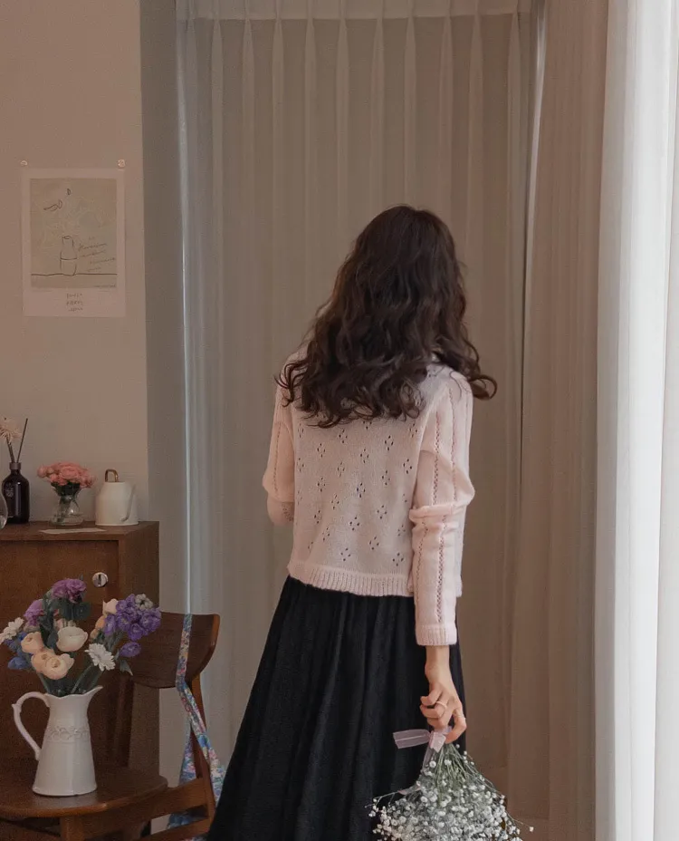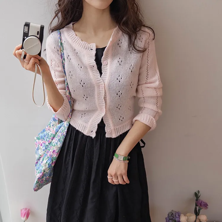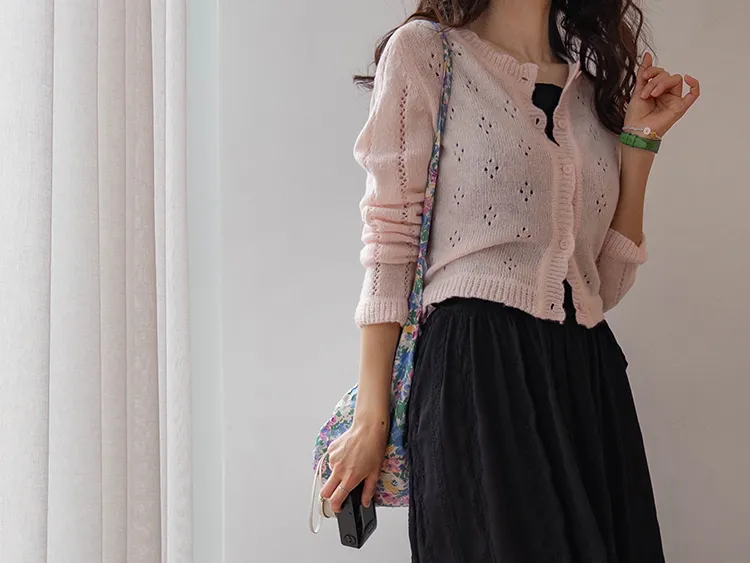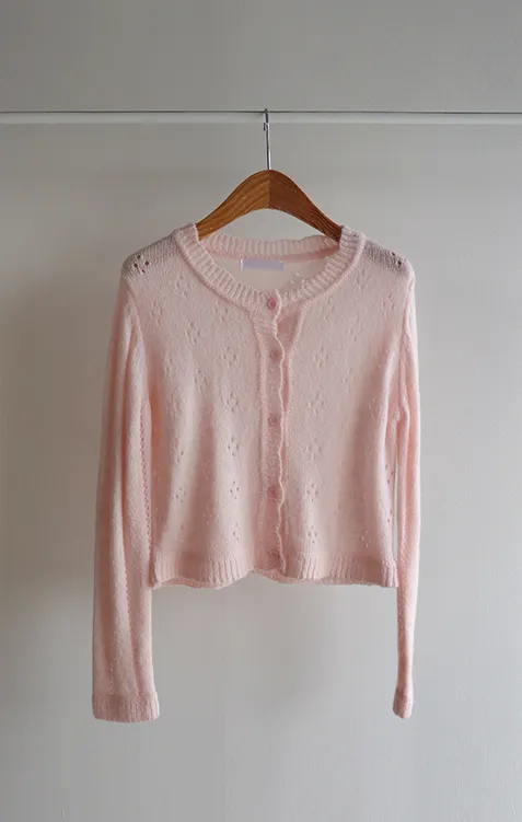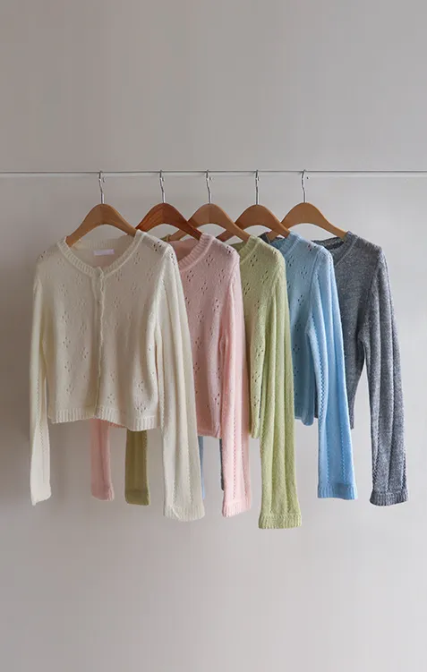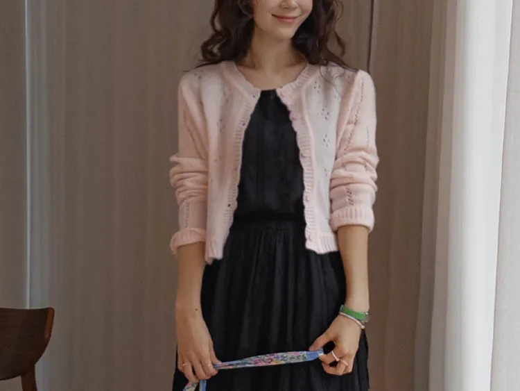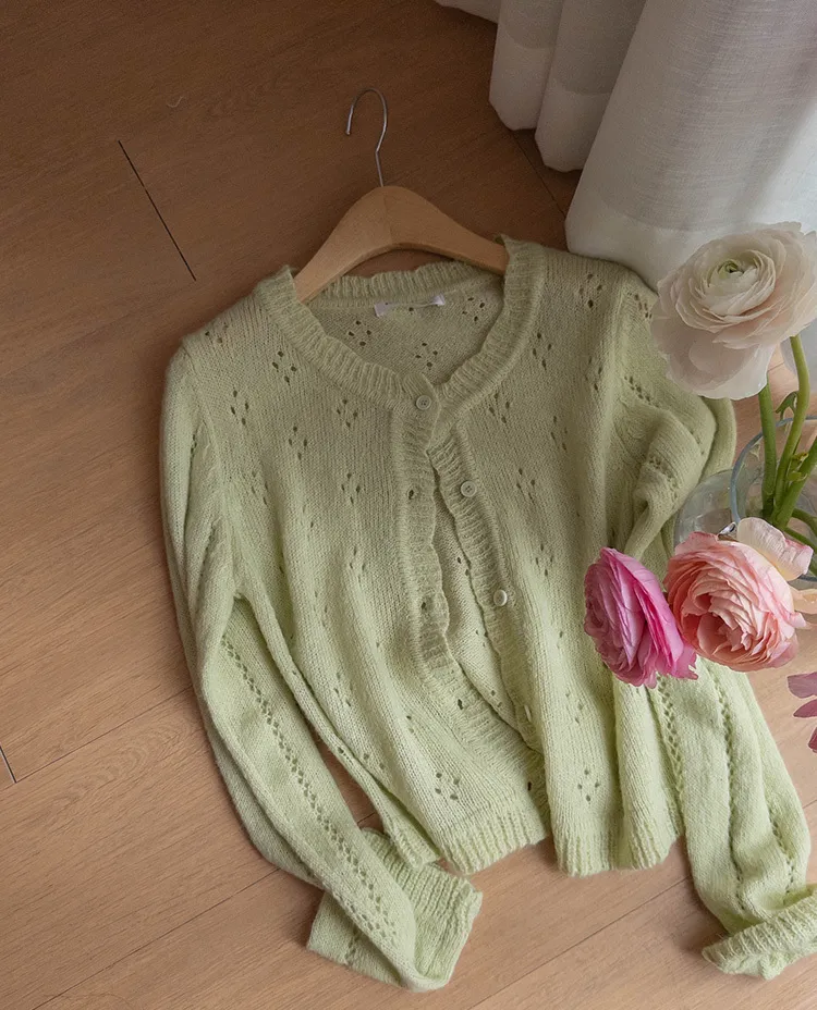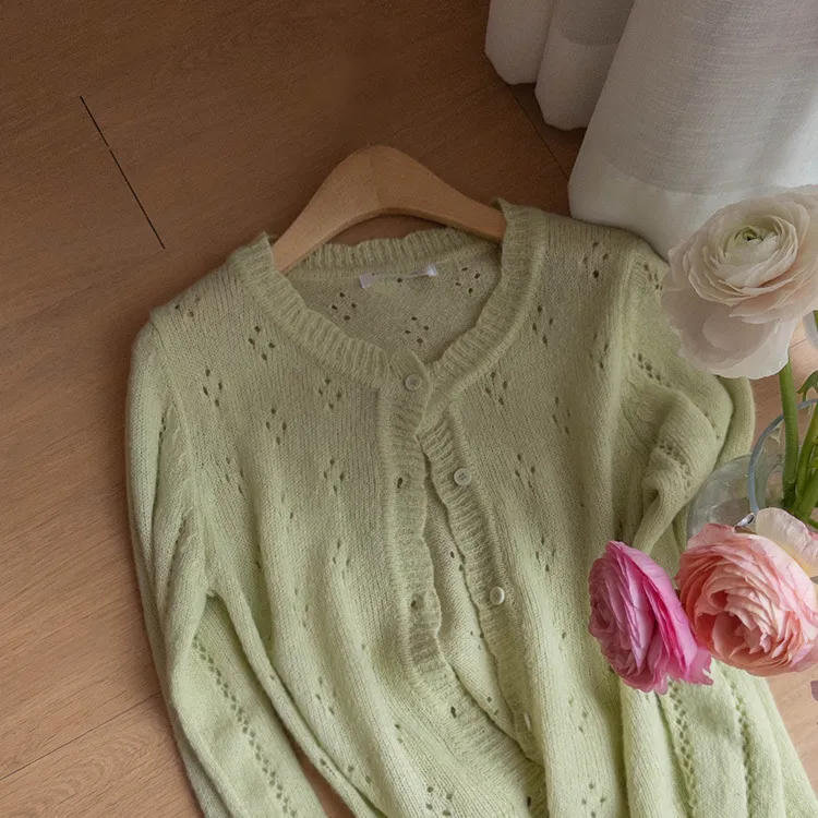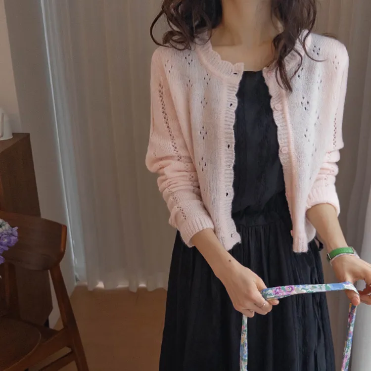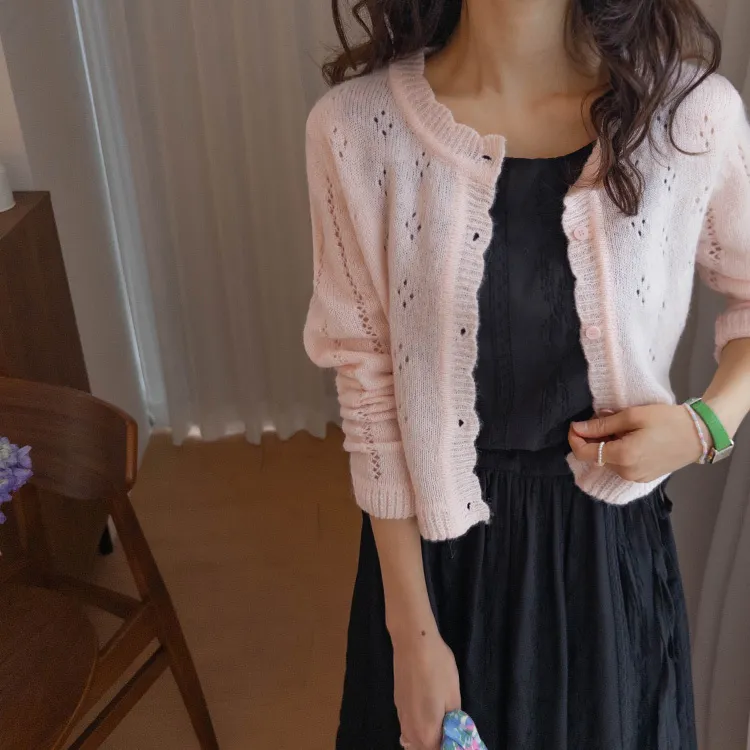 柔和色彩可愛波浪邊鏤空孔洞開衫
