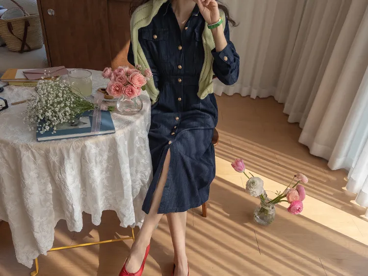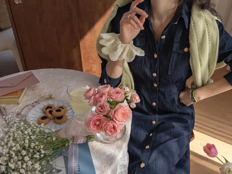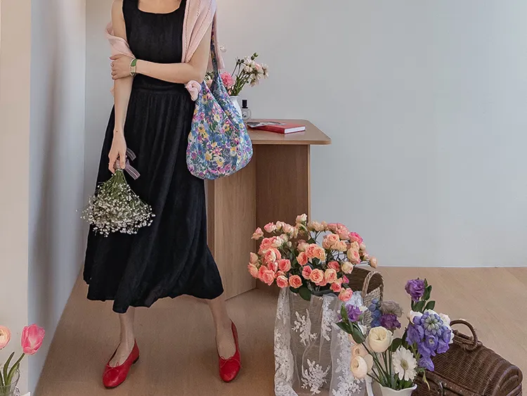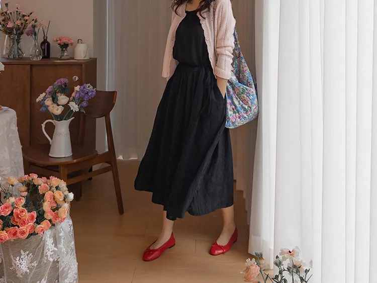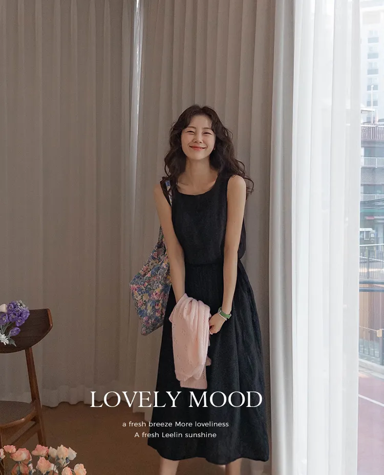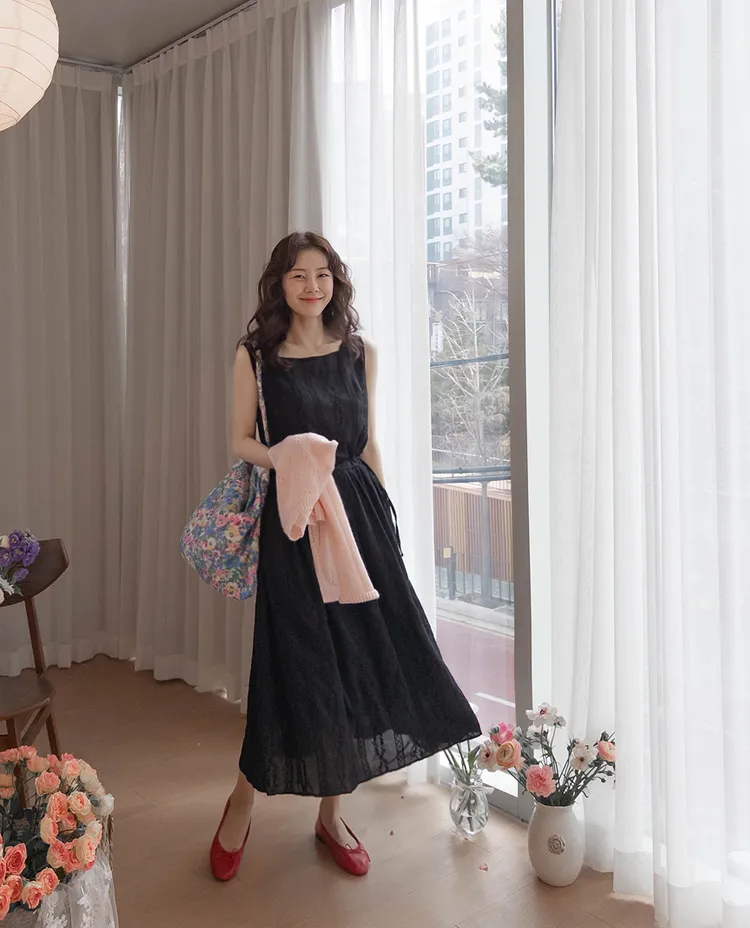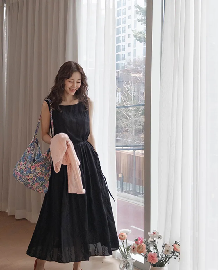 浪漫蕾絲花朵刺繡腰側綁帶感性方領連身裙 黑色