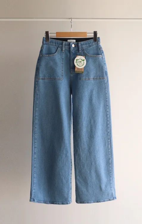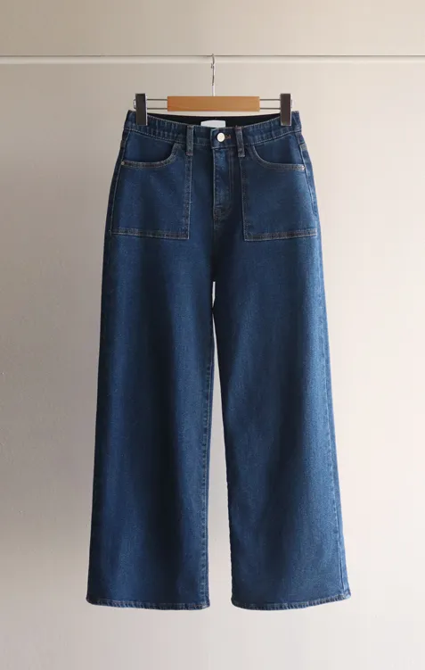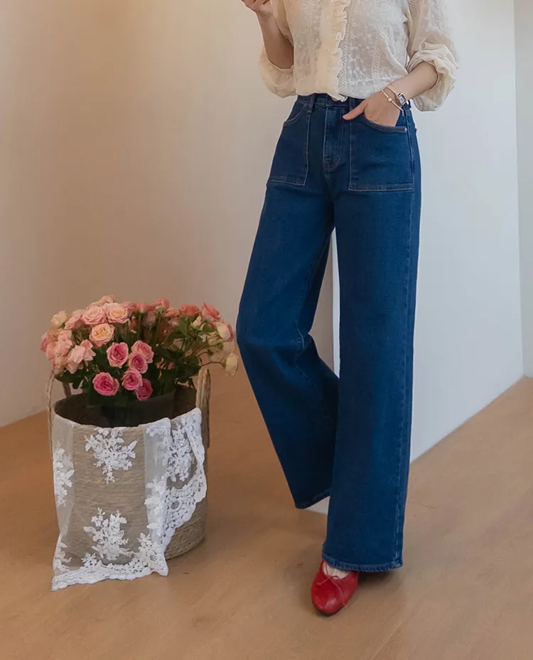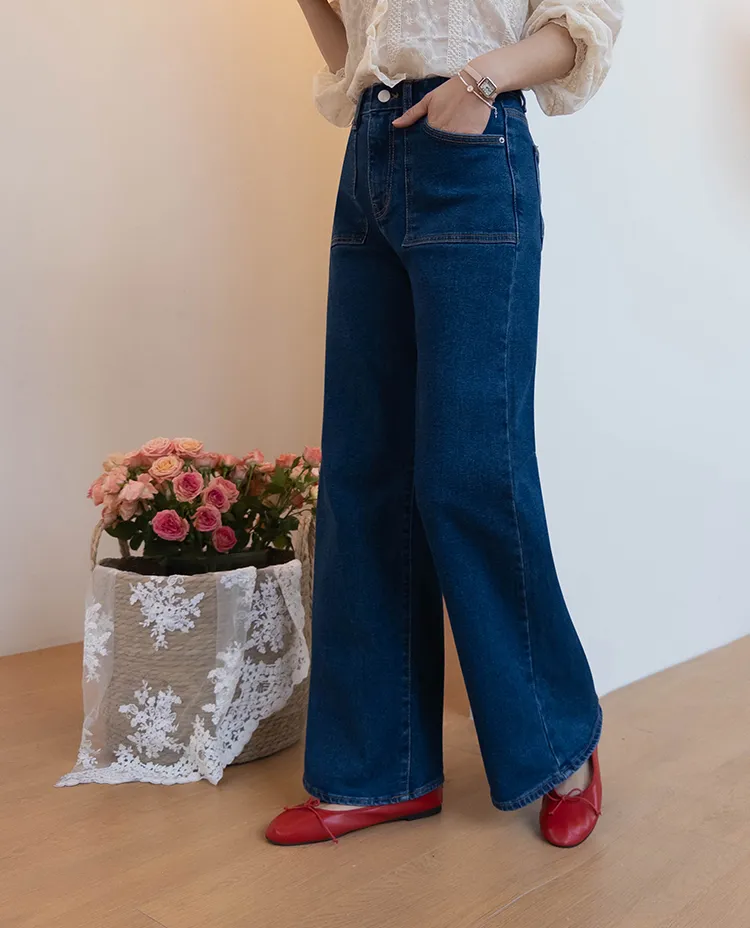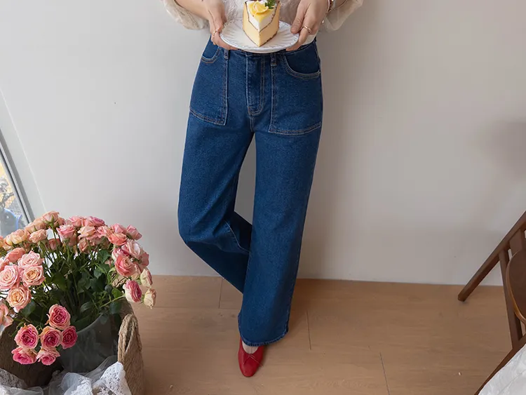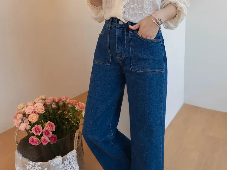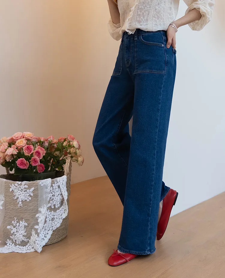 漂亮版型方形口袋直筒修身寬版牛仔褲