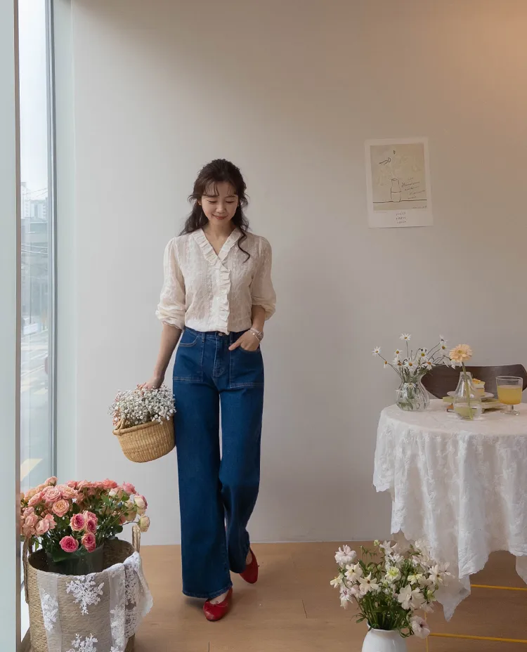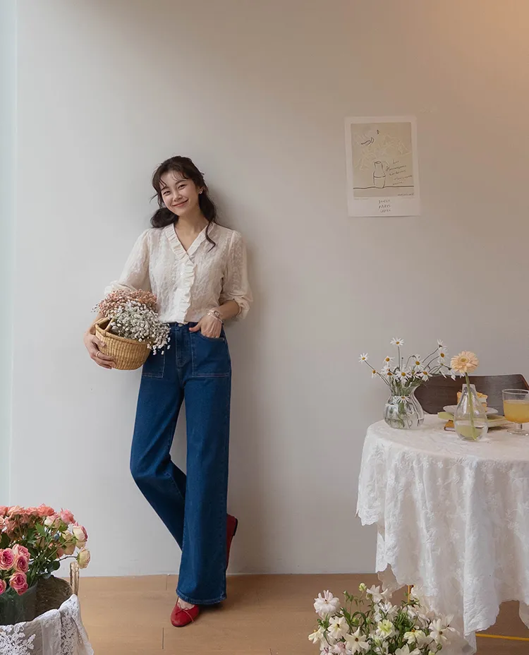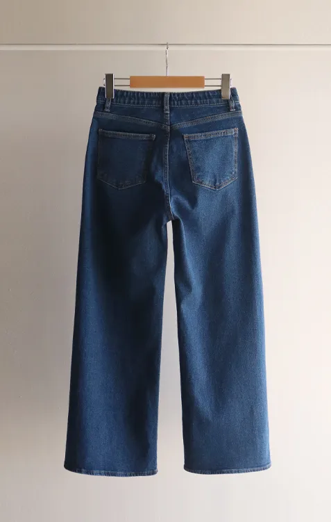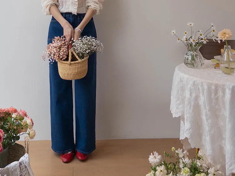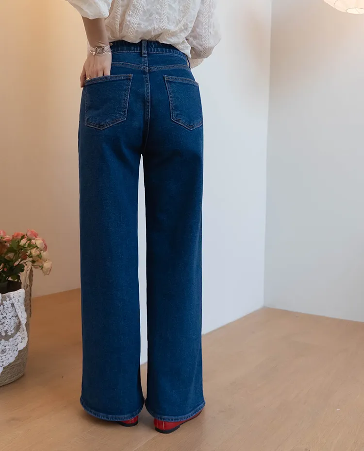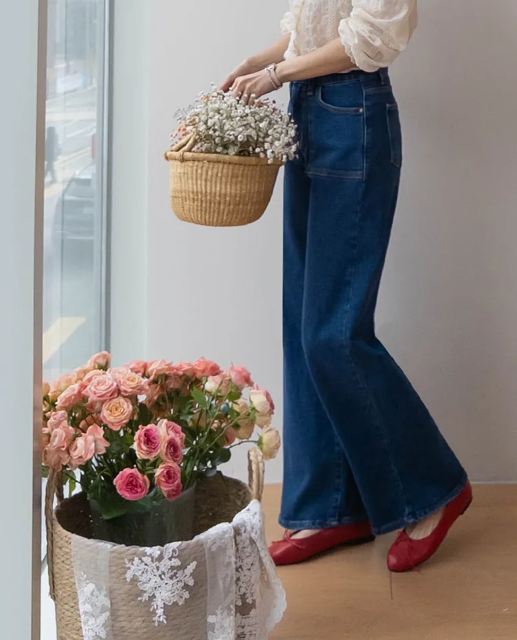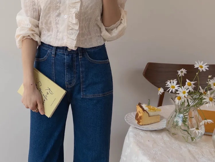 漂亮版型方形口袋直筒修身寬版牛仔褲