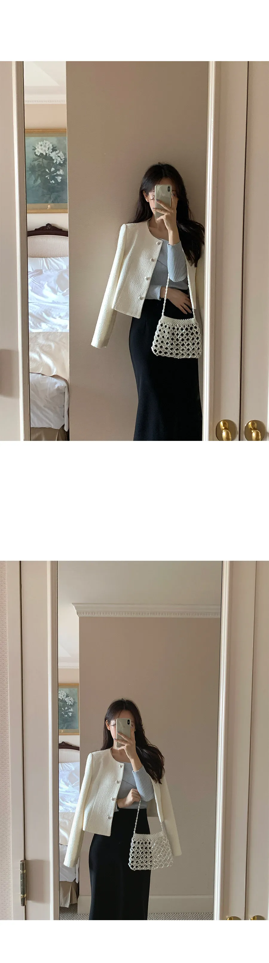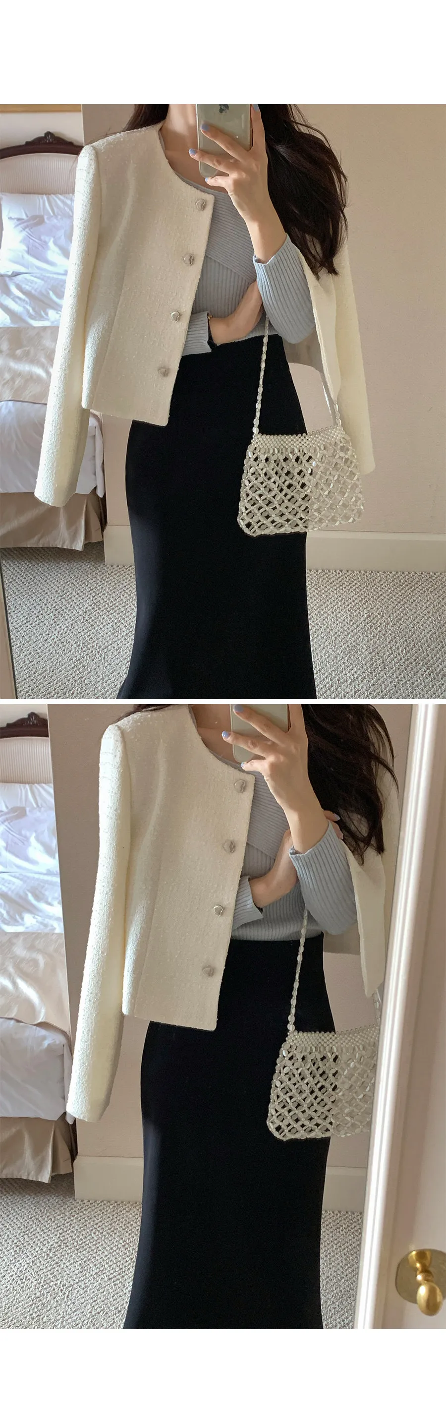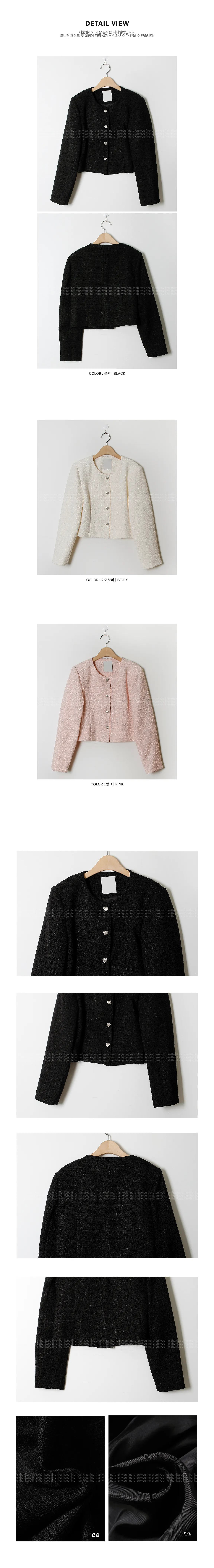 營造浪漫氛圍的花呢外套 〜!非常適合在換季期間出席正式場合穿著的花呢外套。僅具有立體感的花呢材質就增添了獨特的感覺, 標準的合身度和到達臀部的短款長度營造出看起來更長的腿部線條 。可開合的心形銀色鈕扣營造出浪漫情調,無領圓領設計賦予裝扮俐落感。 這款外套內建有薄肩墊, 使其看起來更加合身,並營造出女性氣息。 這是一款可以單獨佩戴以完成賓客造型或約會造型的單品。這款可與任何服飾搭配的花呢外套,例如 牛仔褲、休閒褲、短裙和連身裙 :)