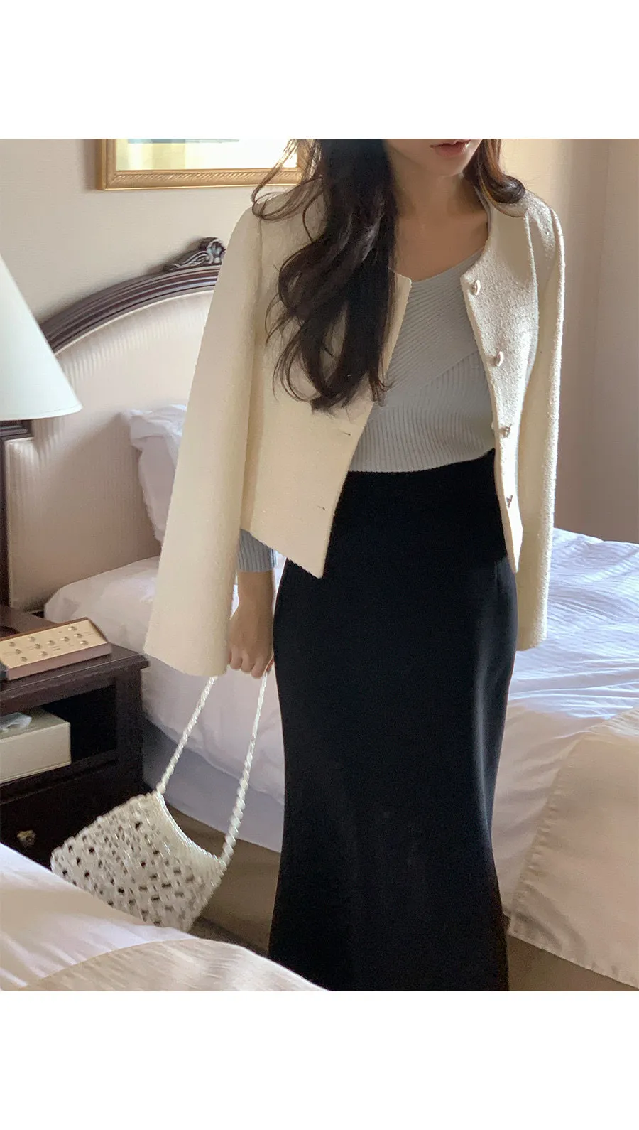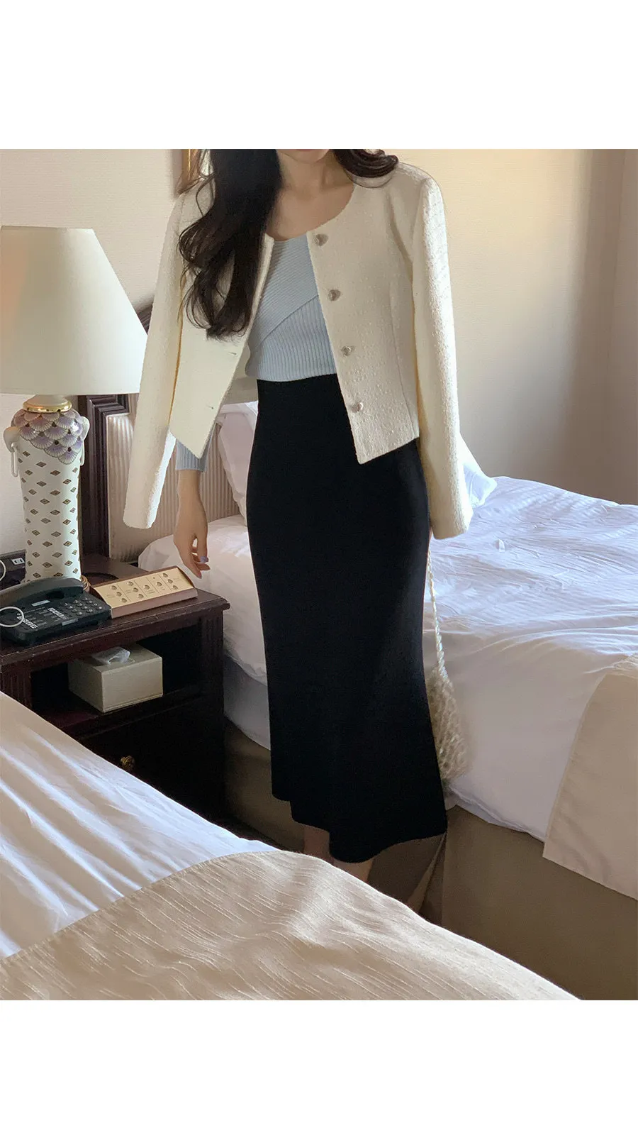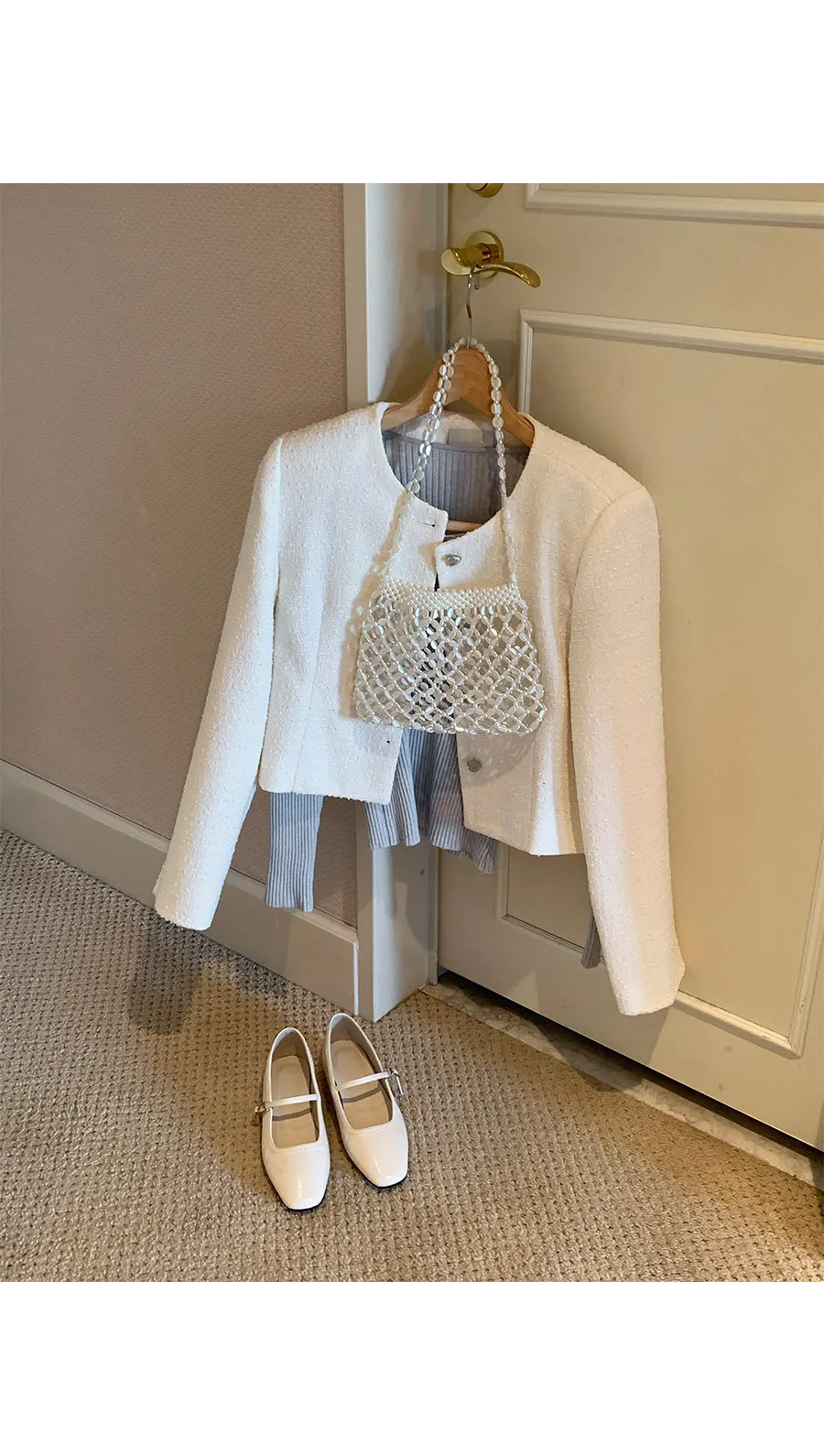 營造浪漫氛圍的花呢外套 〜!非常適合在換季期間出席正式場合穿著的花呢外套。僅具有立體感的花呢材質就增添了獨特的感覺, 標準的合身度和到達臀部的短款長度營造出看起來更長的腿部線條 。可開合的心形銀色鈕扣營造出浪漫情調,無領圓領設計賦予裝扮俐落感。 這款外套內建有薄肩墊, 使其看起來更加合身,並營造出女性氣息。 這是一款可以單獨佩戴以完成賓客造型或約會造型的單品。這款可與任何服飾搭配的花呢外套,例如 牛仔褲、休閒褲、短裙和連身裙 :)